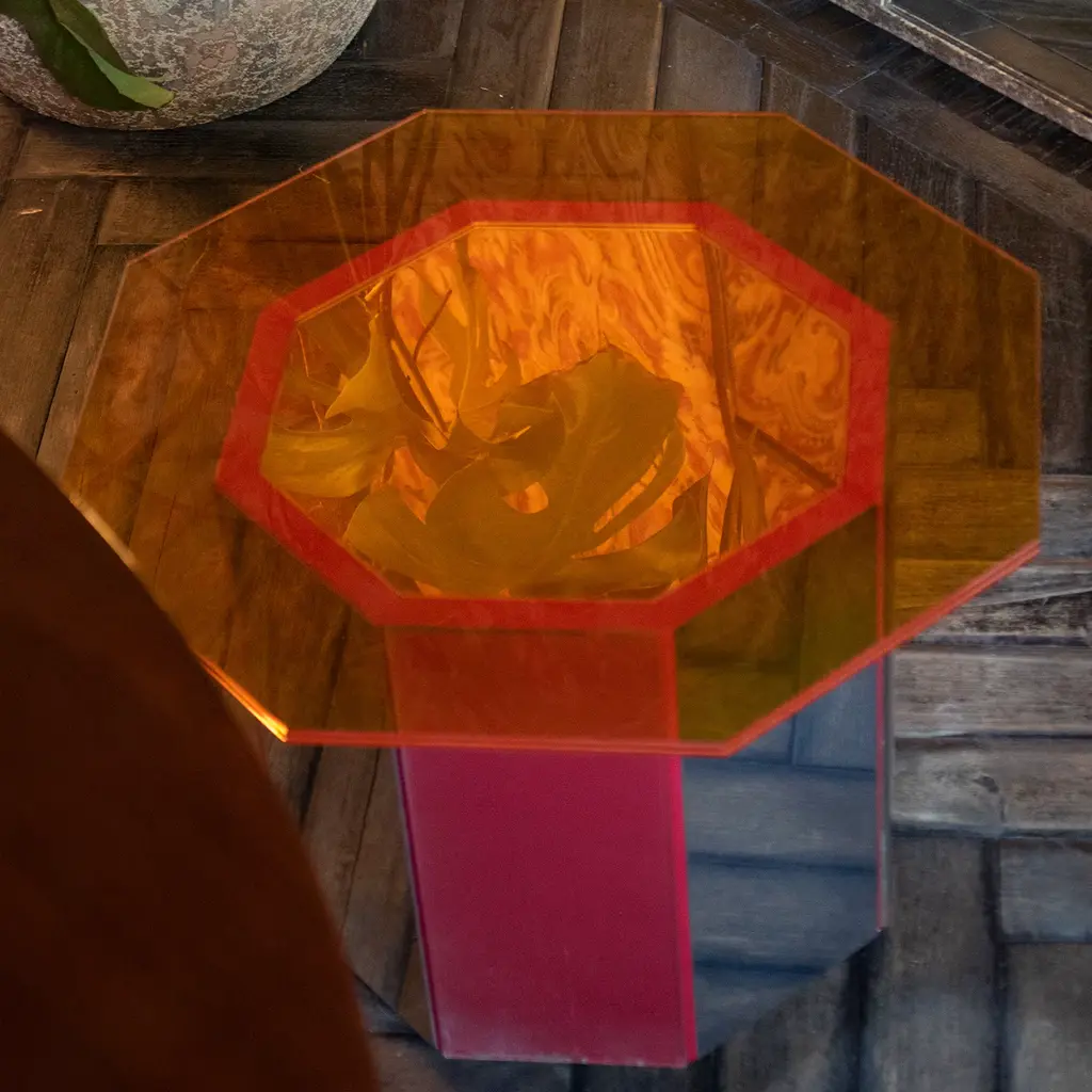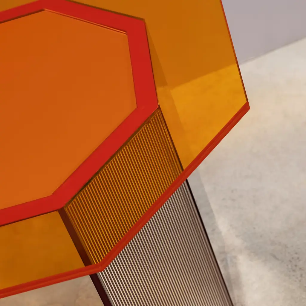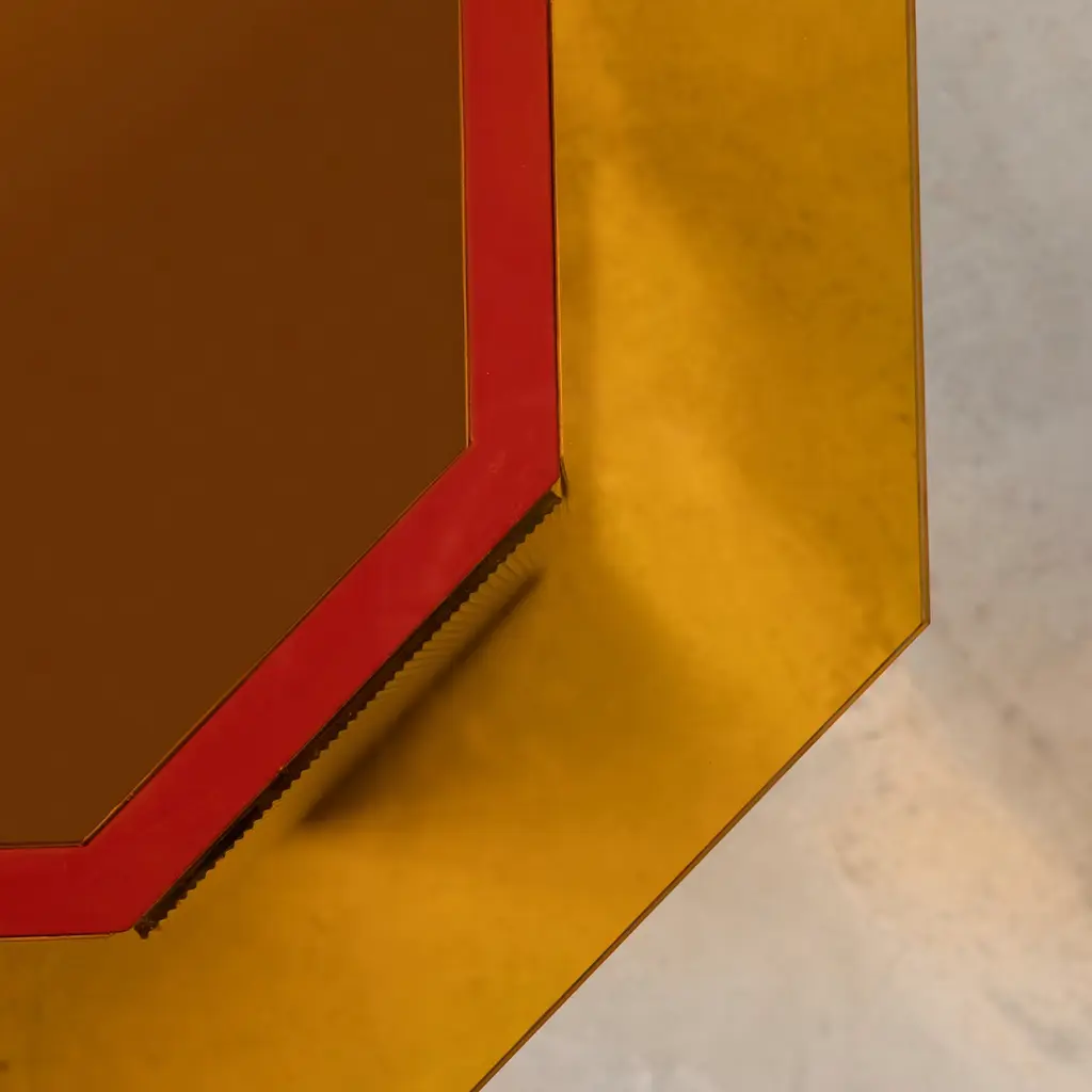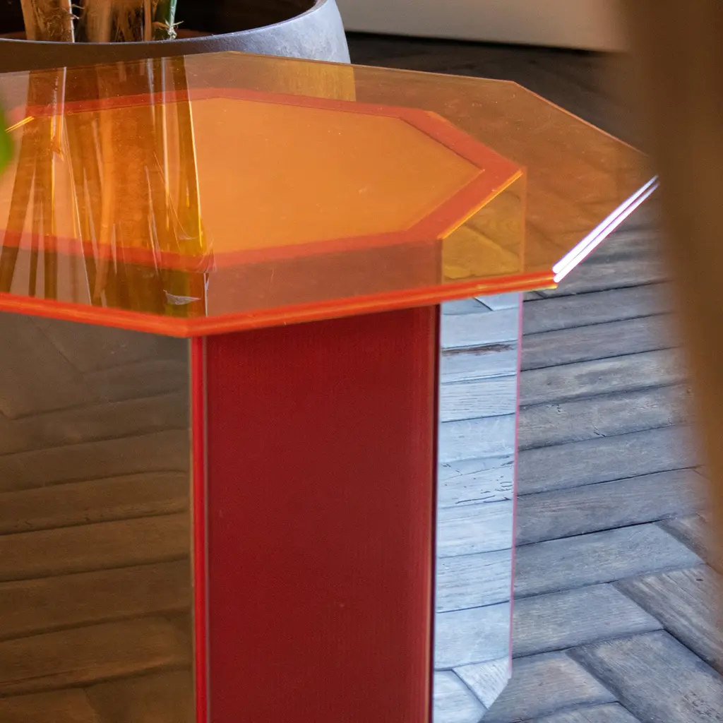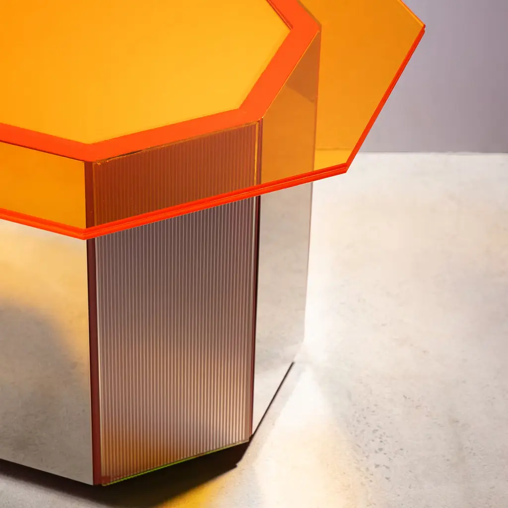 A distinctive chromatic effect for a modern dining area, this Sandra e Raimondo side table pays tribute to a famous comedy couple who were complete opposites. Showcasing a sturdy regular octagonal base crafted in steel-covered wood, and an orange mirrored glass irregular octagon-shape top. Measures 50x50x35cm.