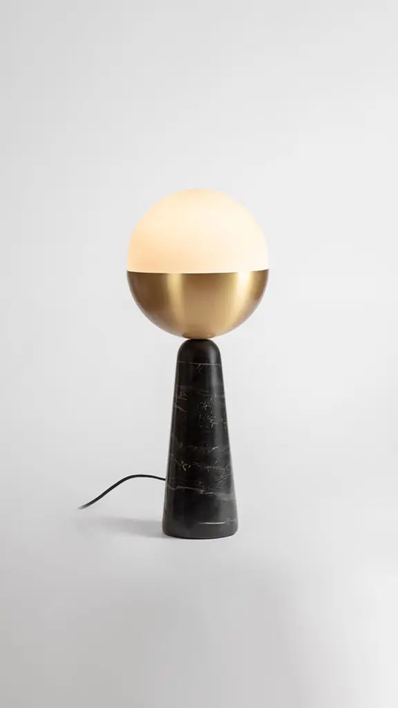 Crafted with a nod to Mid-Century Modern aesthetics, the Studio M Satellite Desk Lamp presents a striking fusion of structural elements. Its French Gold dish, the namesake, reflects the gentle radiance emitted by a Satin White Opal glass shade, softly diffusing the inset LED lamps. The lamping sits steadily atop a solid cylinder of intricately veined Black marble, exuding sophistication and restraint in its design. With materials ranging from marble to stainless steel and a sleek globe shade, this lamp effortlessly bridges the gap between Mid-Century Modern and Contemporary styles, offering a luxurious and functional accent piece suitable for any space.