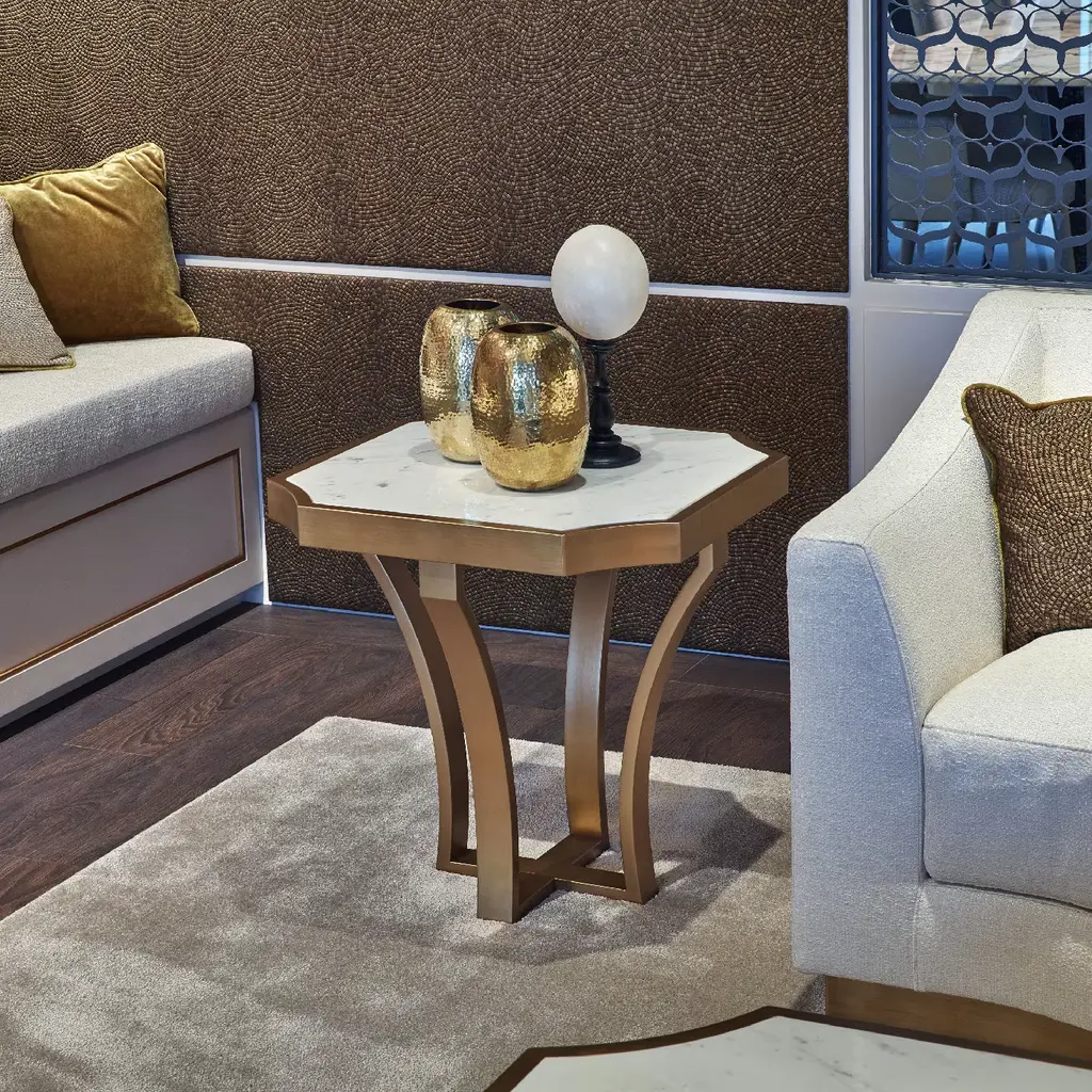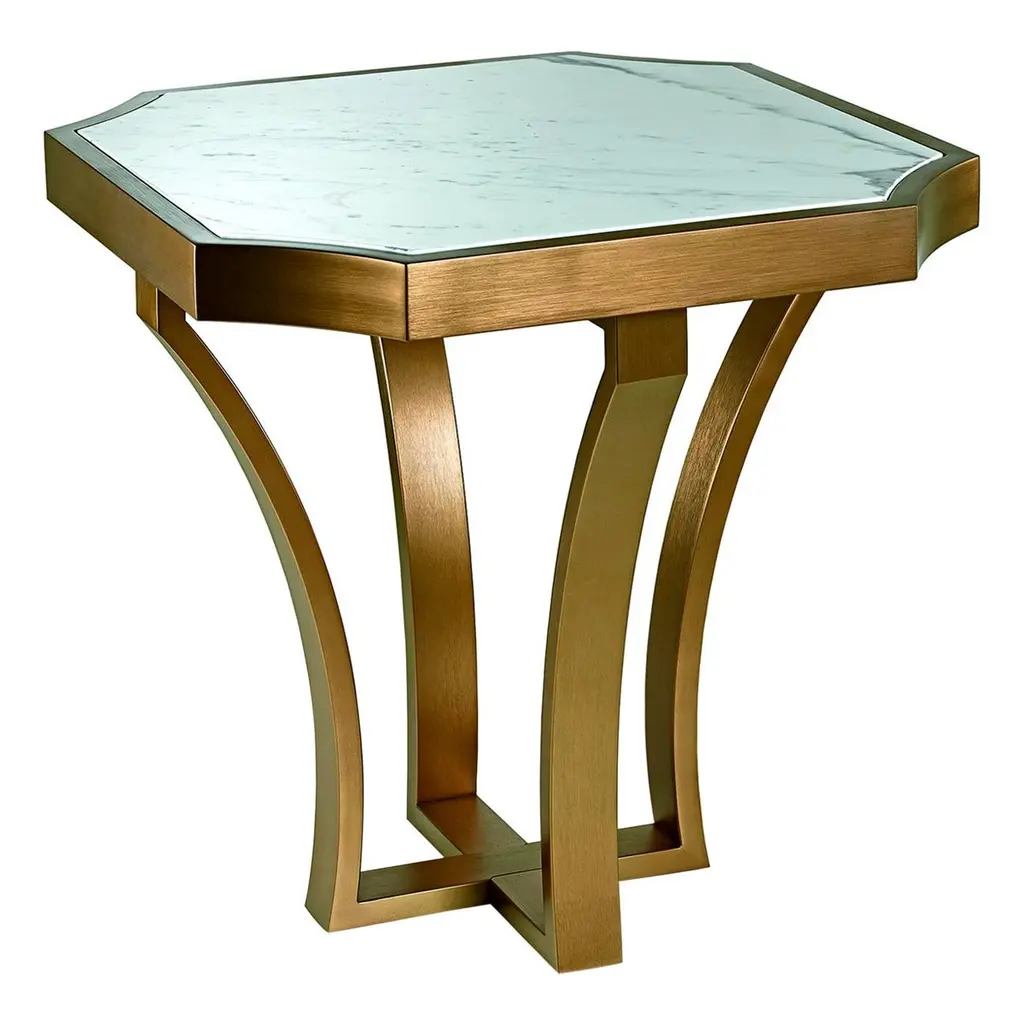 This stunning side table is part of the Savoy Collection, which will splendidly complement the seating options of the Borgia Collection in both traditional and modern living rooms. Its timeless allure comes from a harmonious combination of sinuous elements and straight lines entirely made of bronze that adds a warm glow to the marble of the rectangular top with cut corners.