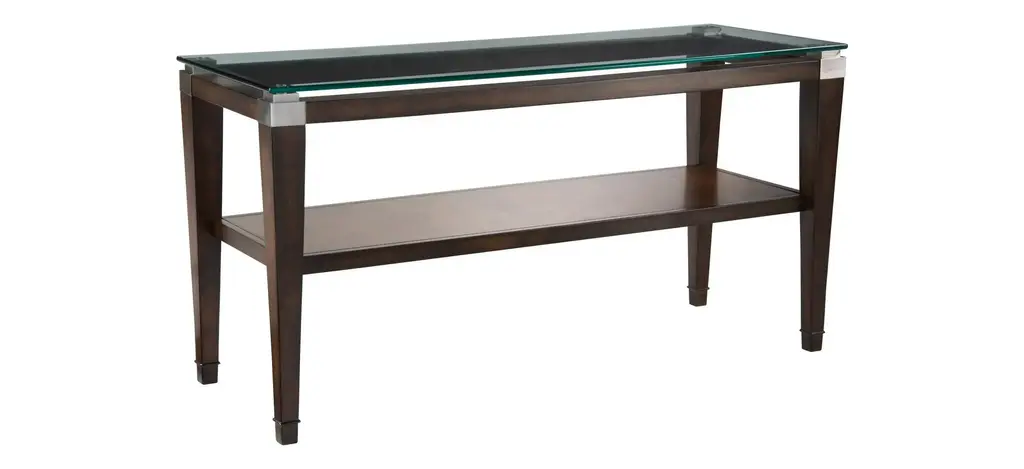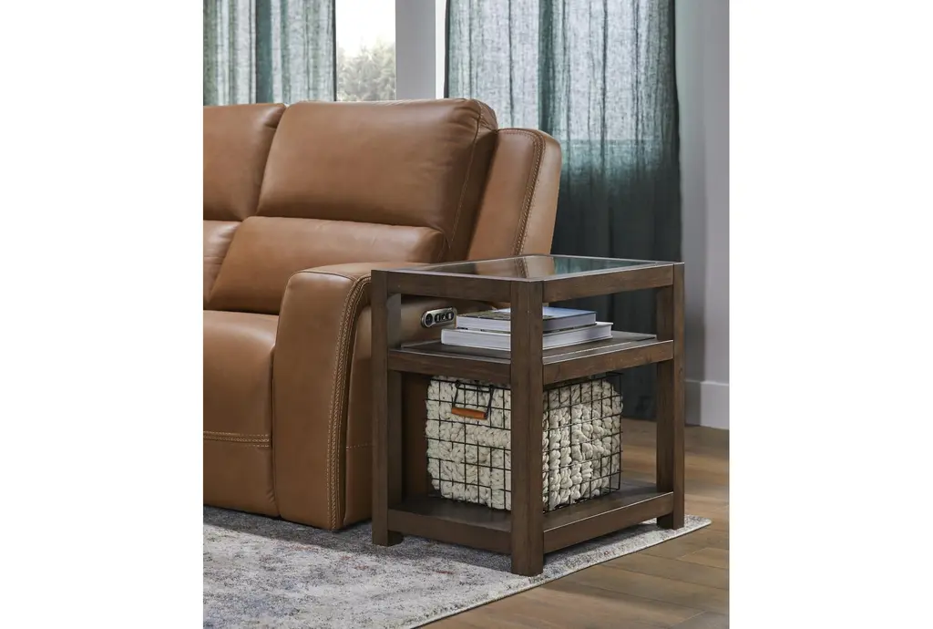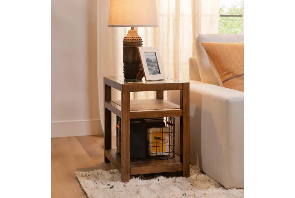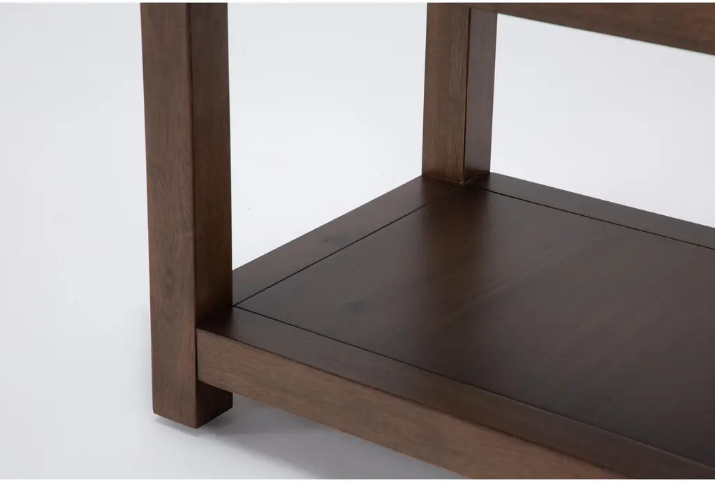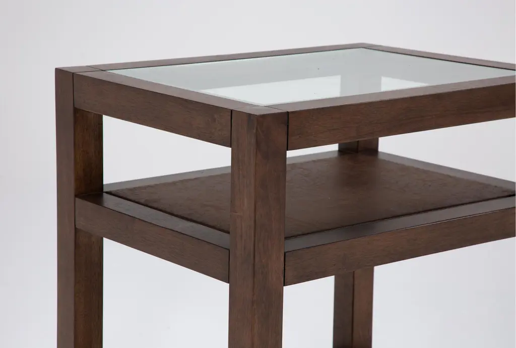 Introducing the Sawyer Brown Walnut End Table, a modern masterpiece designed to enhance your living room. This 18-inch wide rectangle table features a stunning glass top and a solid wood base, combining walnut veneer with solid rubberwood for a sophisticated look. The rich walnut color and contemporary design make it perfect for any space, offering both functionality and style.