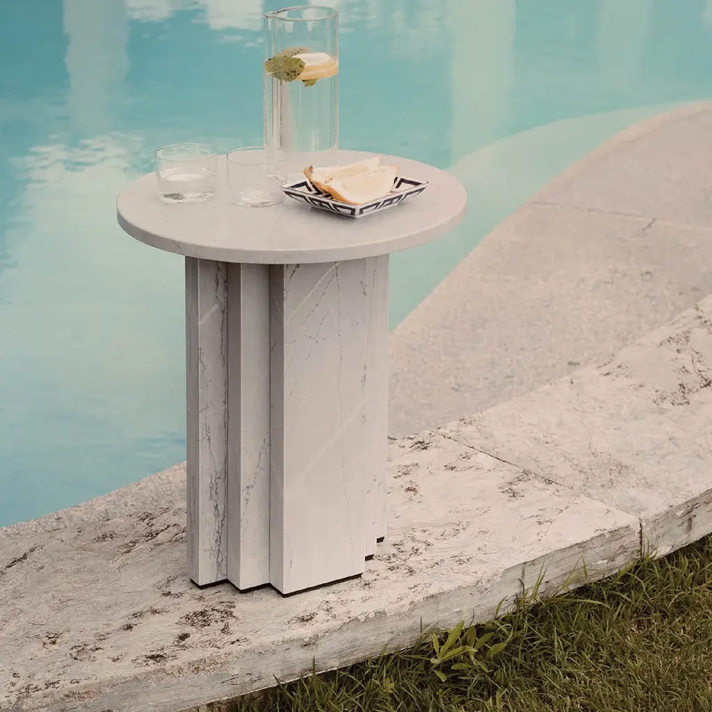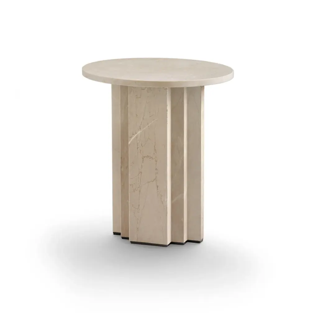 Introducing the Scaled Base Side Table by Arflex Scalea. Crafted with delicate precision to highlight its unique material, the table's sleek round top beautifully contrasts with a bold, sculptural base. A statement piece that adds a touch of sophistication and luxury to any space.