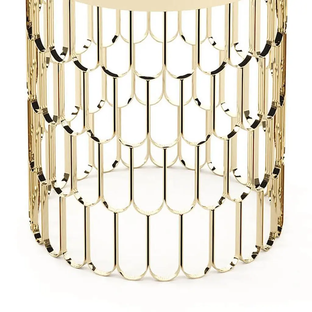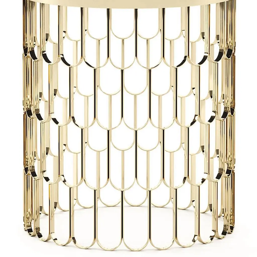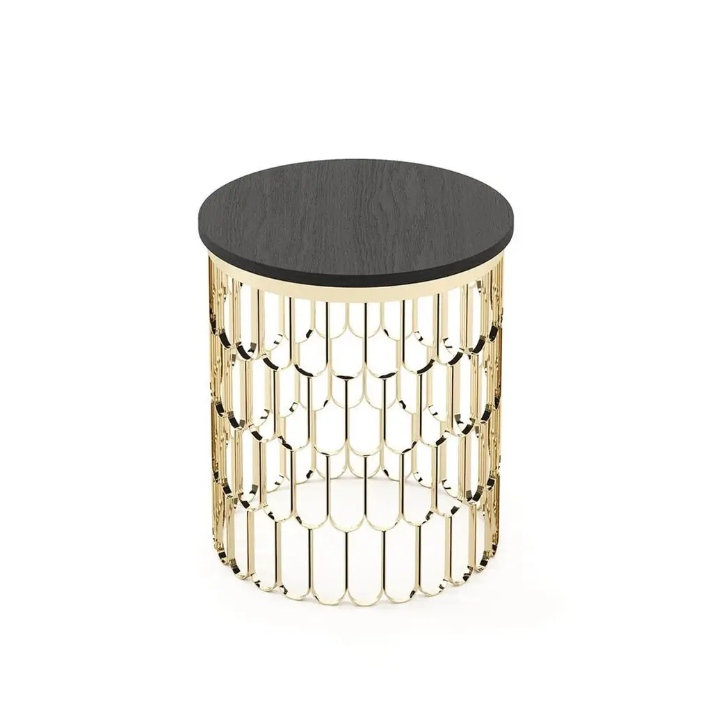 Side table scales with structure inpolished stainless steel in gold finish.With smocked oak matte top