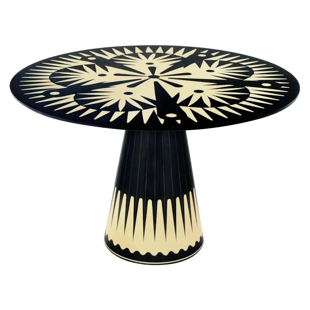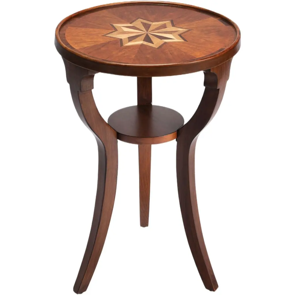 Scalloped Lamp Table is an exquisite blend of artistry and functionality that adds a touch of elegance to any space. The central turned column and the delicately shaped frame top create a visual symphony that draws the eye to the intricate inlay, resembling a blooming flower.Finished in a rich matt mahogany, this lamp table exudes warmth and sophistication. The inlaid top showcases a meticulous combination of mahogany feather, ebony, cherry, and pear wood, bringing a tapestry of natural textures and hues to the forefront.Elevate your decor with the Scalloped Lamp Table—a piece that transcends the ordinary, seamlessly merging craftsmanship and design. Whether in your living room, bedroom, or any curated space, this table is a statement of refined taste and a celebration of intricate detailing. Illuminate your home with the timeless allure of the Scalloped Lamp Table—a harmonious blend of form, finish, and artistic finesse.