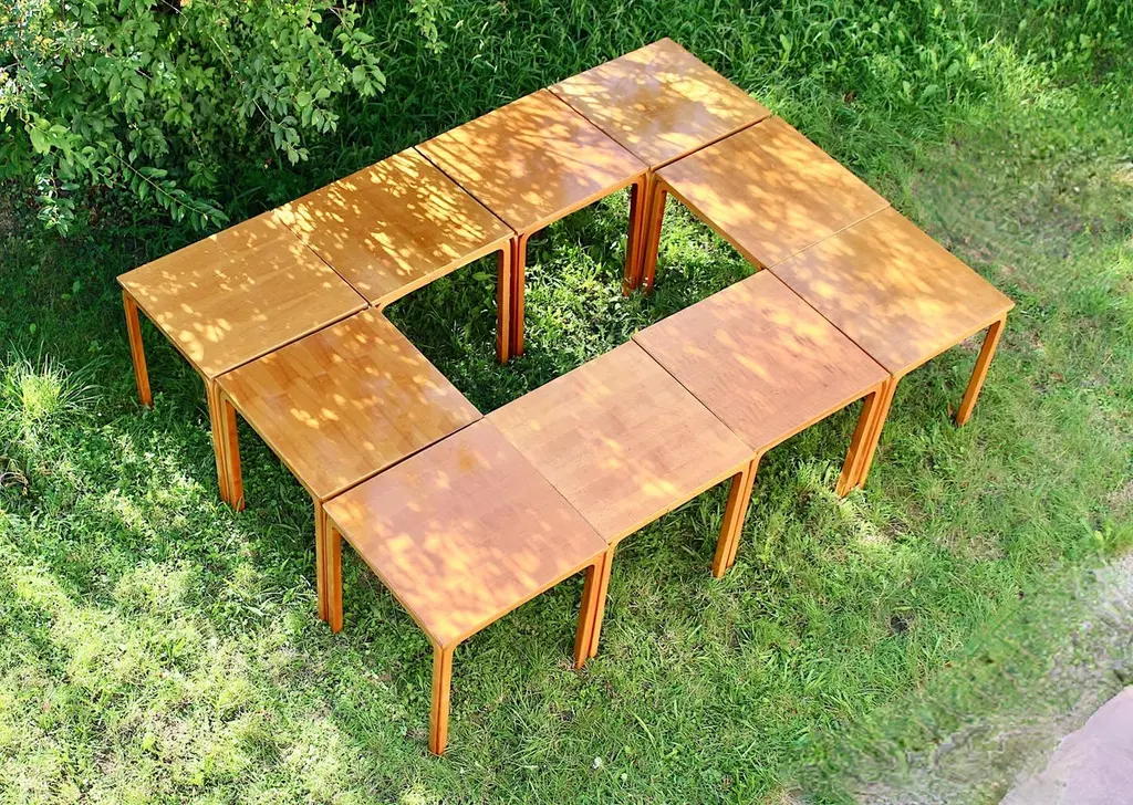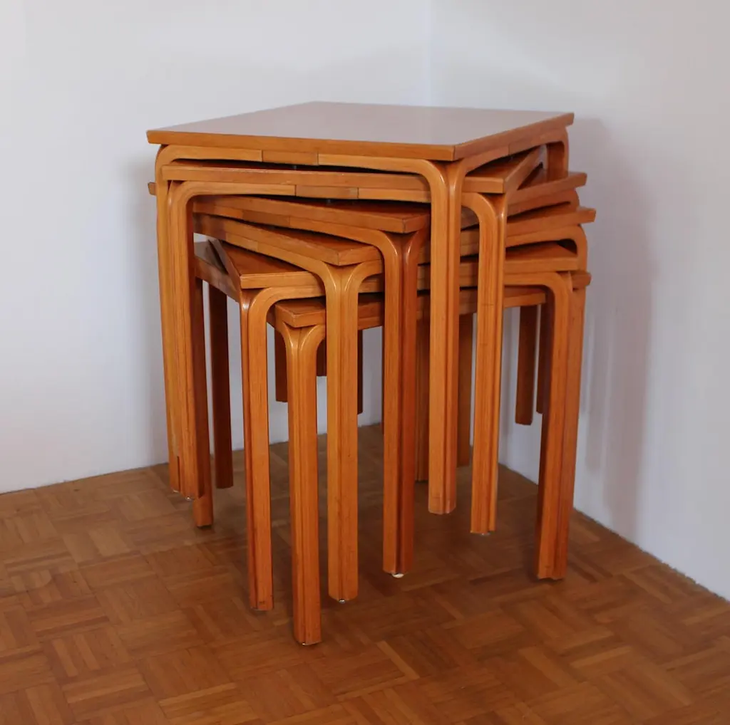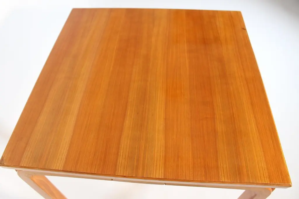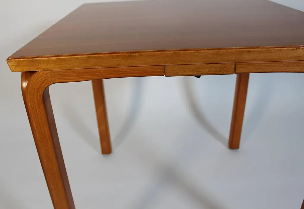 Scandinavian Modern vintage square like form side table fromplywood and birch dining table or side table by Alvar Aaltodesigned circa 1946 Finland manufactured circa 1960.A wonderful squared dining table or side table from birch, stained very similar to cherrywood, while the Y leg construction shows plywood.We decided to polish the table top by hand with shellac for astunning warmth and depth look and feel. Alvar Aalto ( 1898 - 1976 ) Finnish architect and designerHe worked in the circle of Le Corbusier, Fernand Leger, LaszloMoholy-Nagy, Walter Gropius. Just name but a few and plus, he was influenced from Deutschen Werkbund and Bauhausand sought for organic architecture - nature landscape andbuildings should be close together.A wonderful spirit, which reflects the current vision and the spiritof the time.Y legs stands for the leg construction and based on thebending wood by Alvar Aalto - the L legs. In the Y-legs, two slimL legs were chamfered on opposite sides and glued together.The condition is good ready for immediate use.Throughout the size and the height the table is versatile, usingas side table, as dining table for smaller sized rooms, forworkspaces, offices, vary it with pieces from warm chocolate brown, bold yellow and cool blue Contemporary, precious hot pink and red Rococo,sleek orange earth tones Mid Century Modern or classy Art Deco as well as green Organic.approx. measures:Width 70 cmDepth 70 cmHeight 74 cmPlease kindly note, that we are glad to offer 14 tables with refreshed and shellac polished table tops. Each table shows slightly different veneer pictures and different signs of character.The surface from the table tops are shellac polished by hand while the legs are carefully cleaned and in original condition.The attached images show examples how wonderfully and usable an arrangement of these tables looks like.Please check the quantity field and cross the requested number.