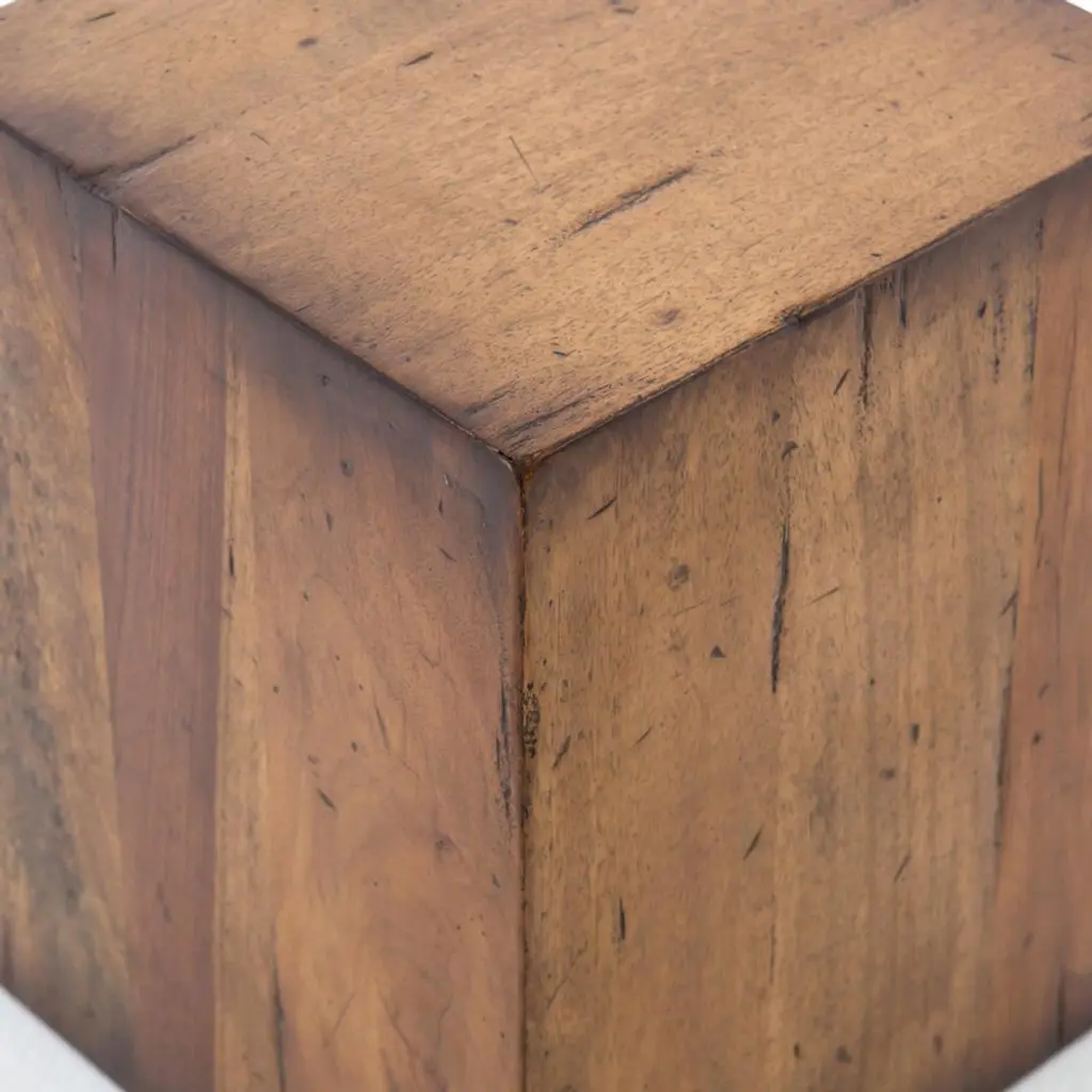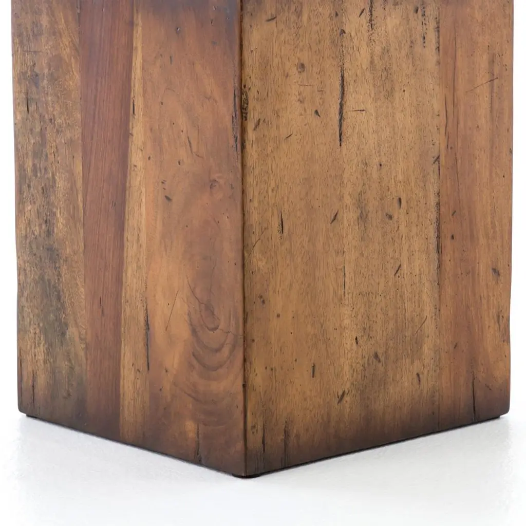 Bring a warm, rustic touch to any room in your home with the Scarlett end table. Its simple cubic shape is crafted from solid mixed reclaimed wood. Natural wood grain and knots peek through the brown tones, grounding your space with the beauty of nature.