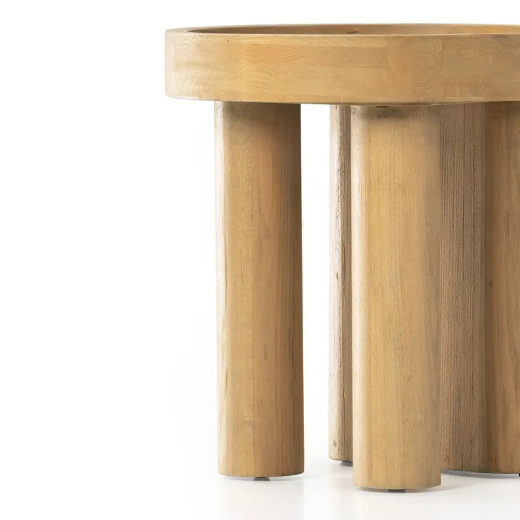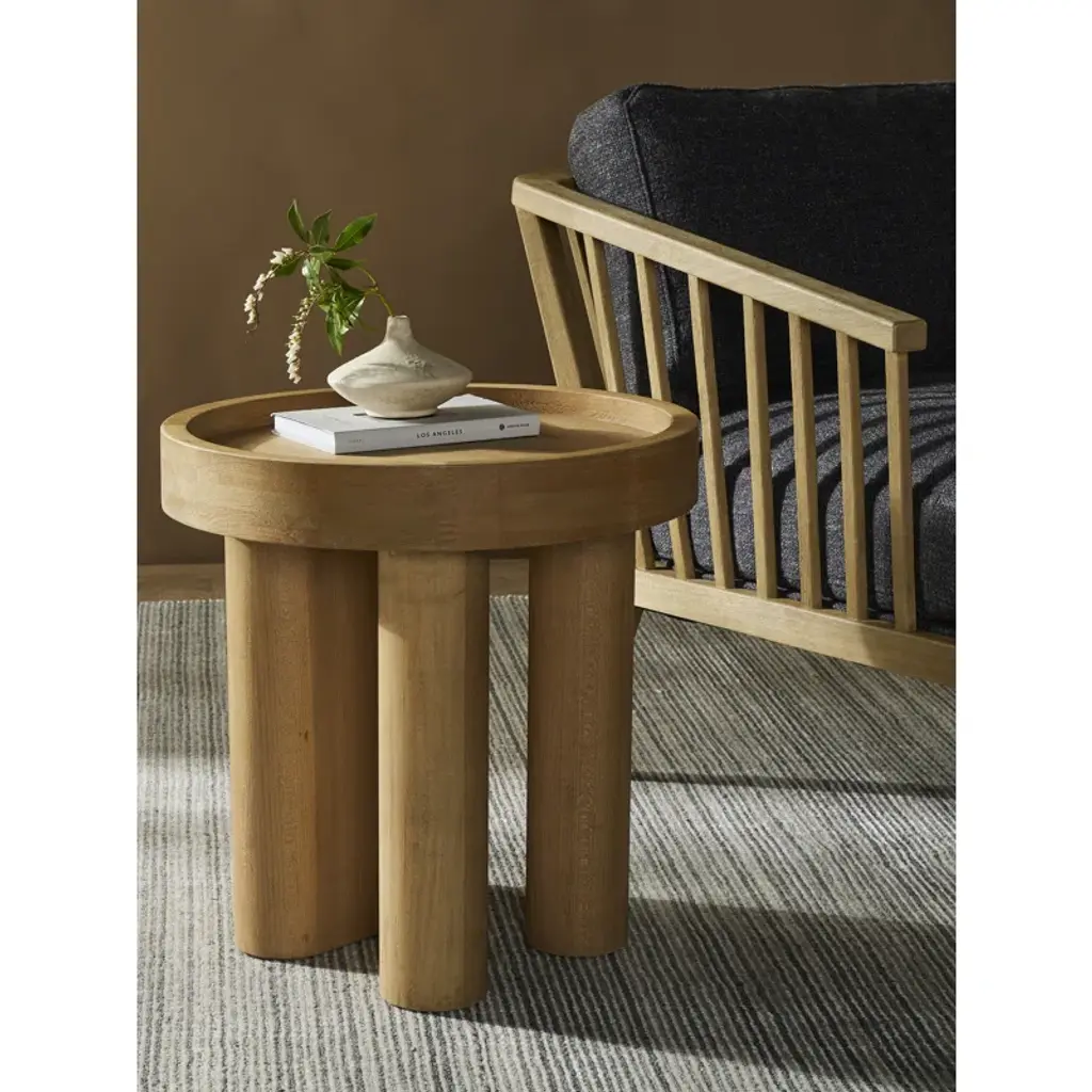 Solid beechwood forms one solid panel frame on one side and dual cylinder legs on the other, for an asymmetric look with balance. Perfectly sized to keep a favorite drink or book within reach.