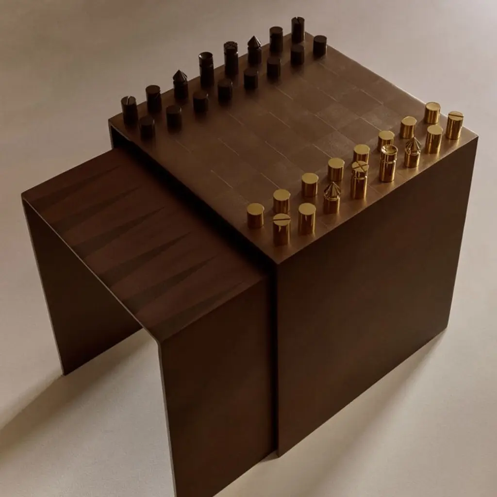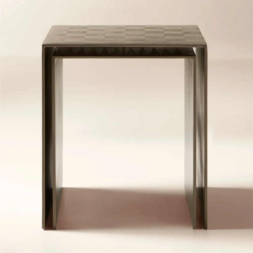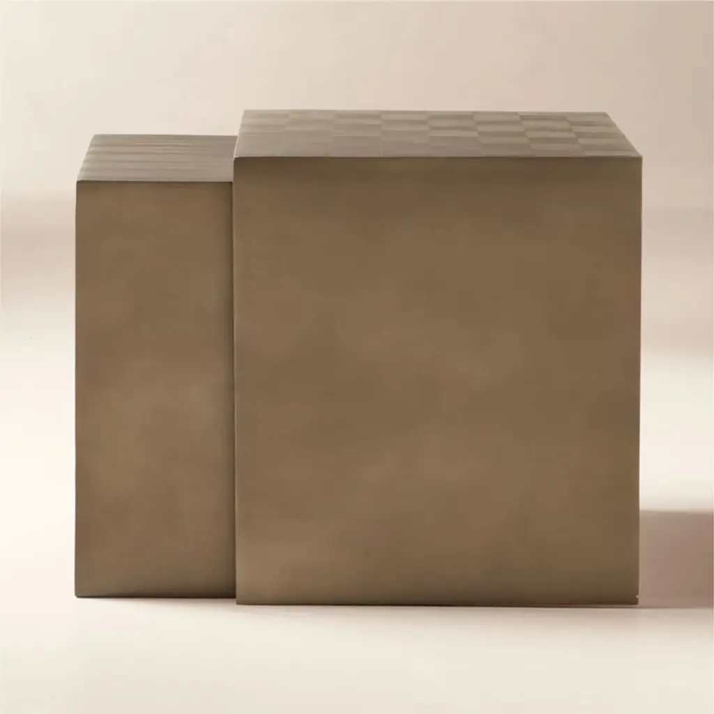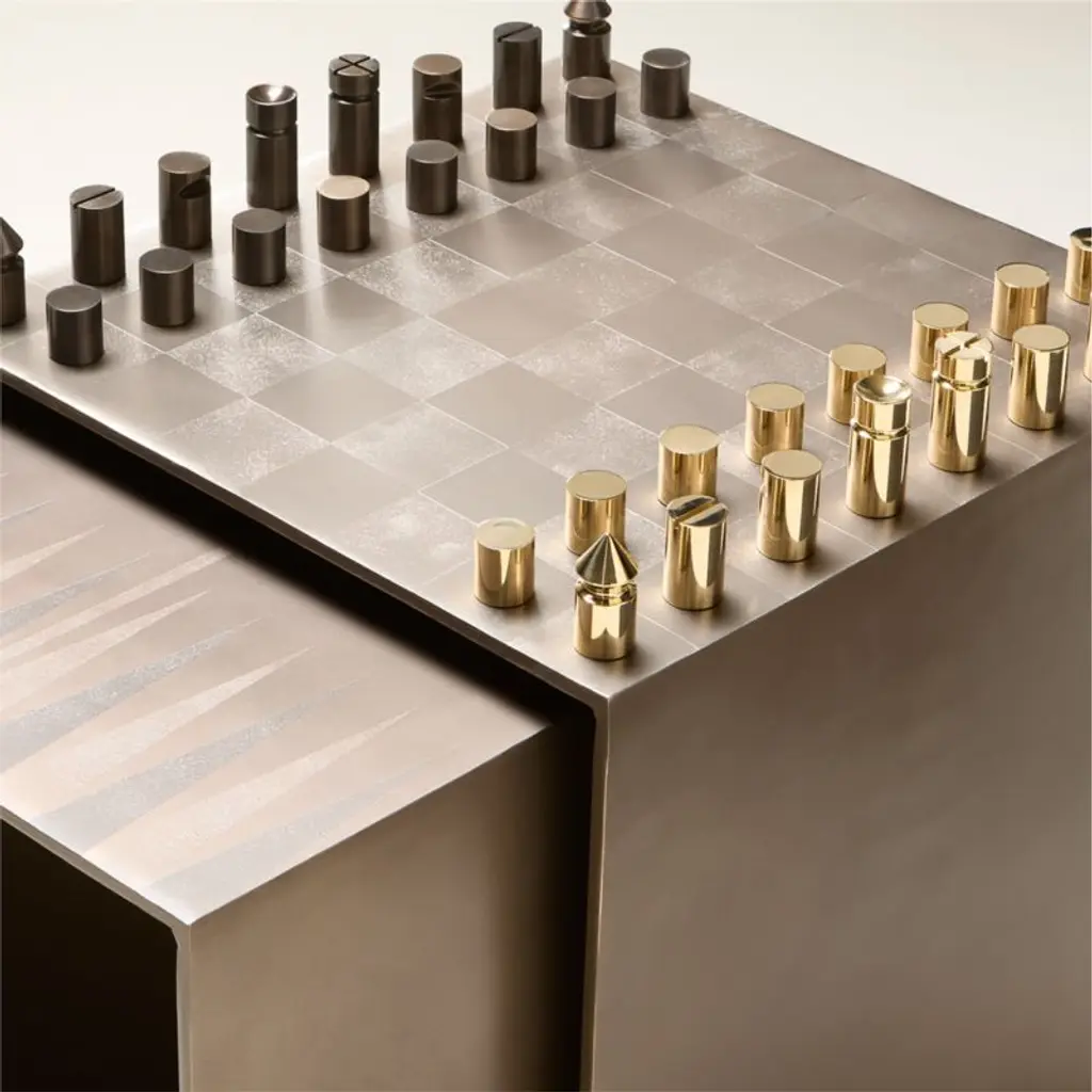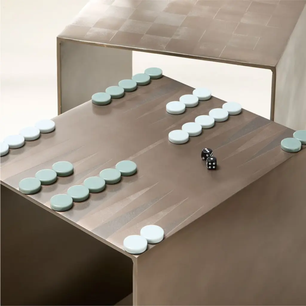 Modern bronze-plated nesting game tables by Barcelona-based Mermelada Estudio are etched with either a backgammon or chess/checkers game board. When not in play, nest the tables together to create an unexpected layered side table. CB2 exclusive.