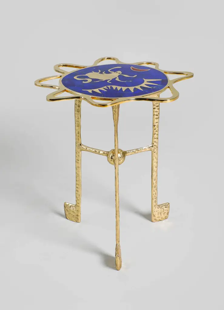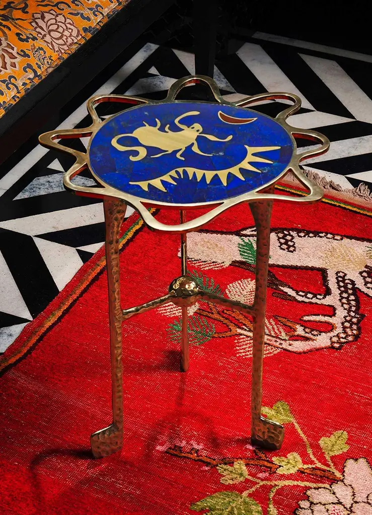 Bring the universe home, and see what’s written in the stars. These renderings of enamel and brass depict the ineffable mysticism of planetary movements, one which governs and dictates the lives of millions across India. Each meticulously designed object features a stone corresponding to its zodiac sign, reflecting the deep fascination held for the cosmic energies influencing destinies. These pieces serve as a tangible link to the celestial forces and elicit the true nature within us all.Side table in brass with semi precious inserts. Handmade in India.Product DetailsMaterial: BrassInlay: Lapiz Lazuli , Red JasperSize: 17.5"L x 16.5"W x 20"H 44.5 L x 41.9 W x 50.8 H cmWeight: 9.5 kg 20.9 lbsNumber of Pieces: 1 Side TableSKU: VST570This product has been handcrafted by local artisans. As such, slight variations are a testament to the unique character of a piece made by hand.