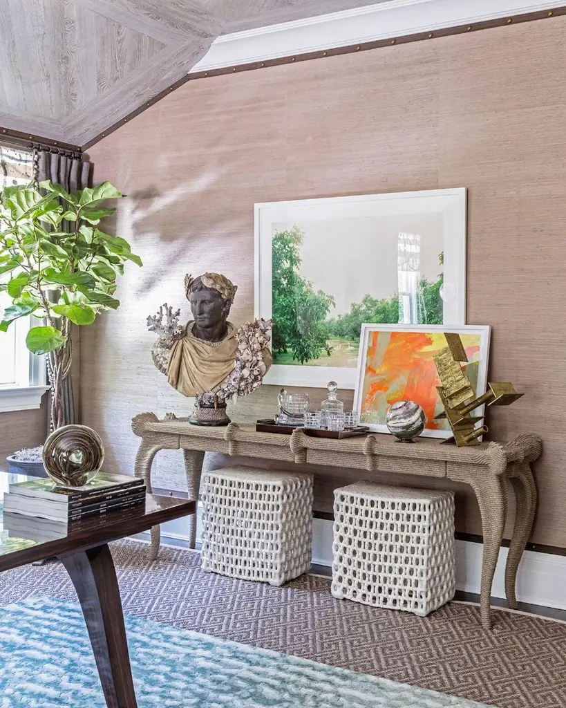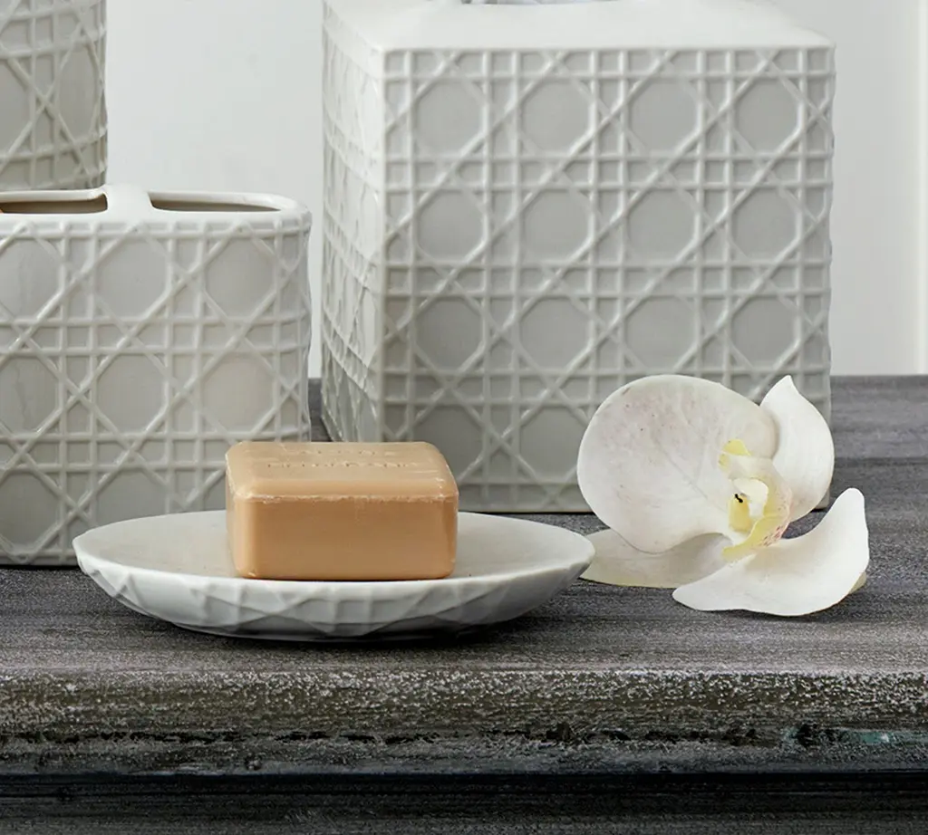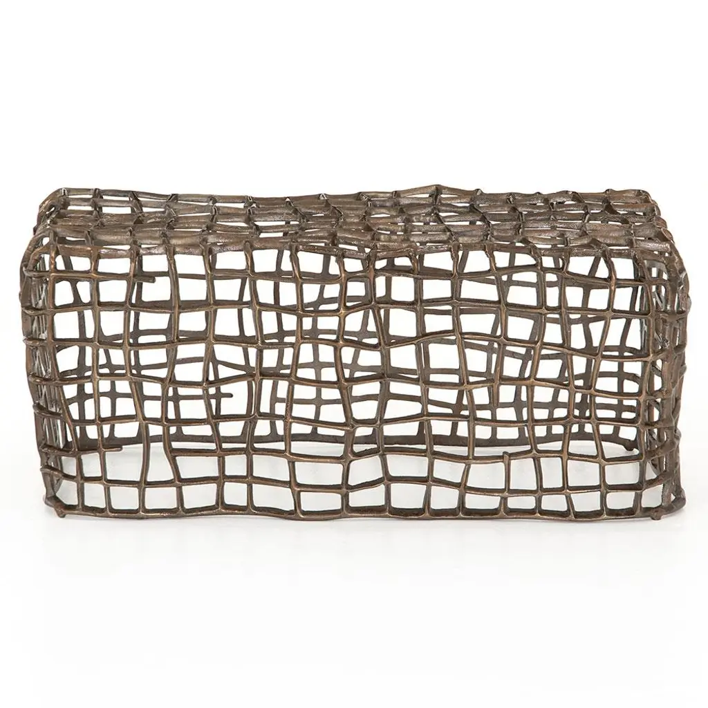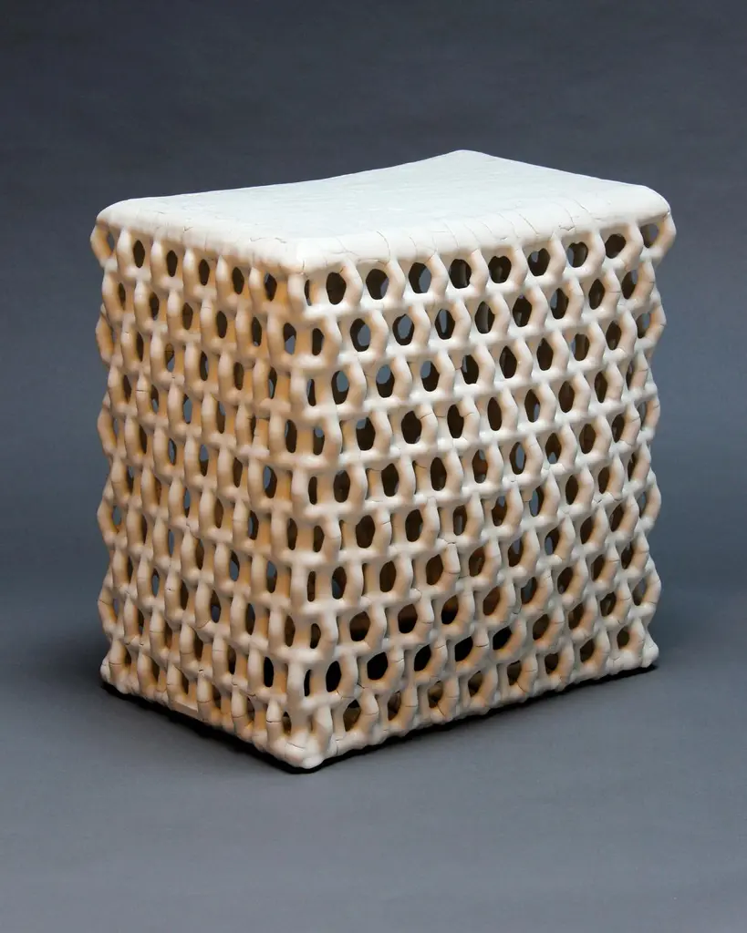 Rhombus table by Scott Daniel Design. This design results from each vertical link of wire bent by hand to form an angular pattern, and is a method used across numerous applications. A rhombus is a quadrilateral whose four sides all have the same length, in this case we bend and break that rule to make the Rhombus table.ProcessInspired by the concept of Alchemy – combining basic elements to create something of great value - Cmesh was developed through an experimental artistic process. Clay and metal, normally incompatible materials, were combined in numerous ways and tested extensively until the process was developed and refined.MaterialClay, MetalDimensionsH 20" x W 19" x D 13"Dimension variations occur naturally, +/- 1”Custom dimensions available.FinishWarm White Satin, Metallic Copper, Metallic BlackAdditional finishes available upon request.