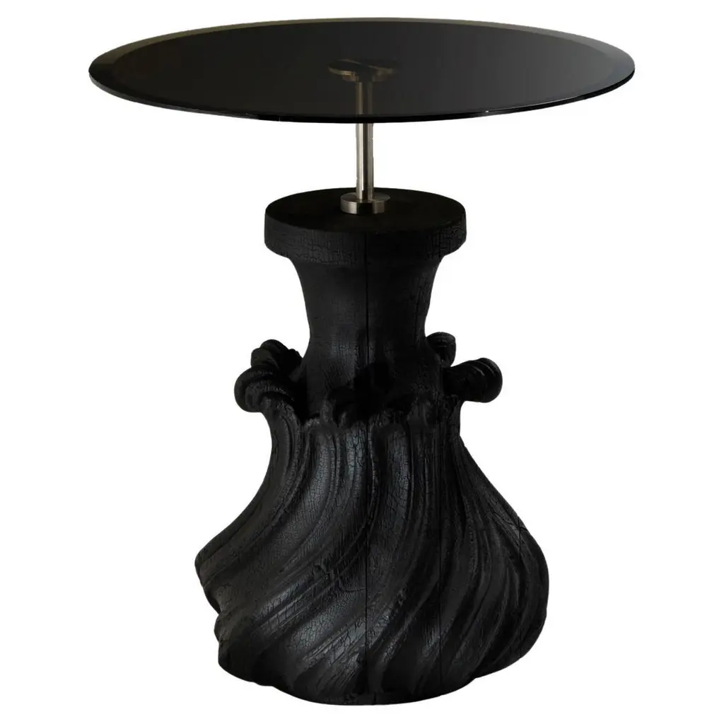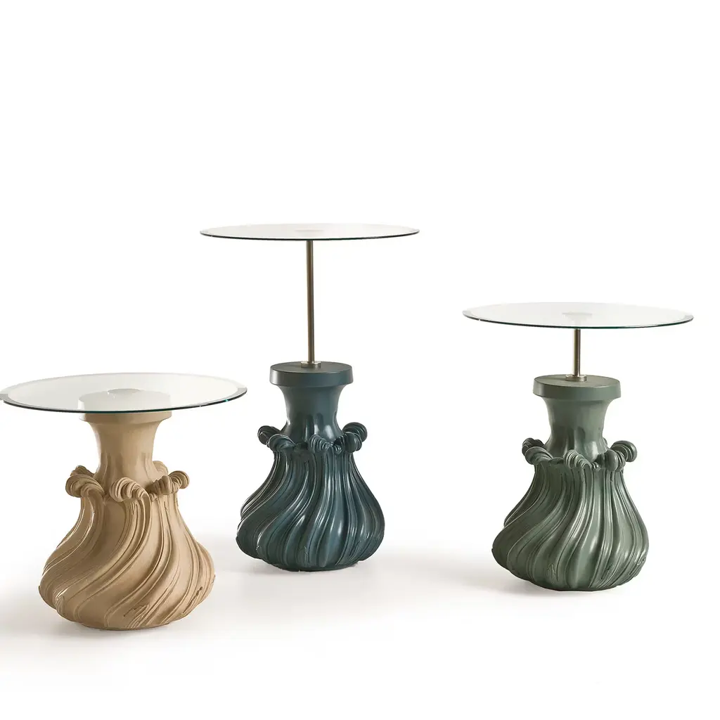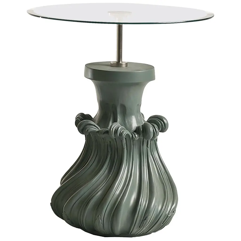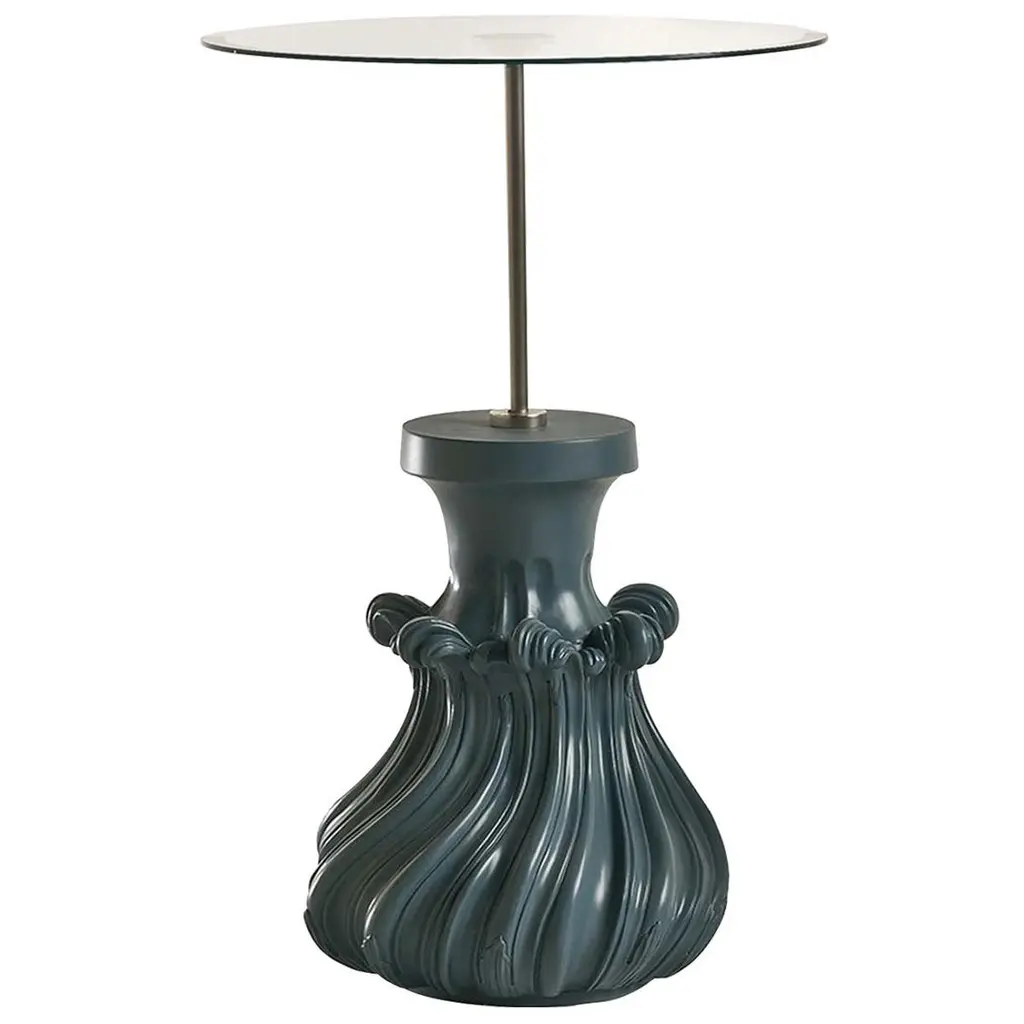 Discover the Scoubidou lamp table, a masterpiece by Nigel Coates, exclusively designed to redefine your space. The carved wooden base in a chic matt military green lacquering unfolds into a dynamic, rounded form with a nod to classical elegance—a Doric capital. Crowned with a beveled crystal top, this table effortlessly blends modern luxury with timeless design. Elevate your home with the artful fusion of form and function—welcome Scoubidou into your lifestyle.