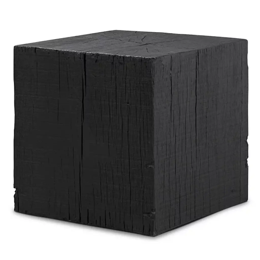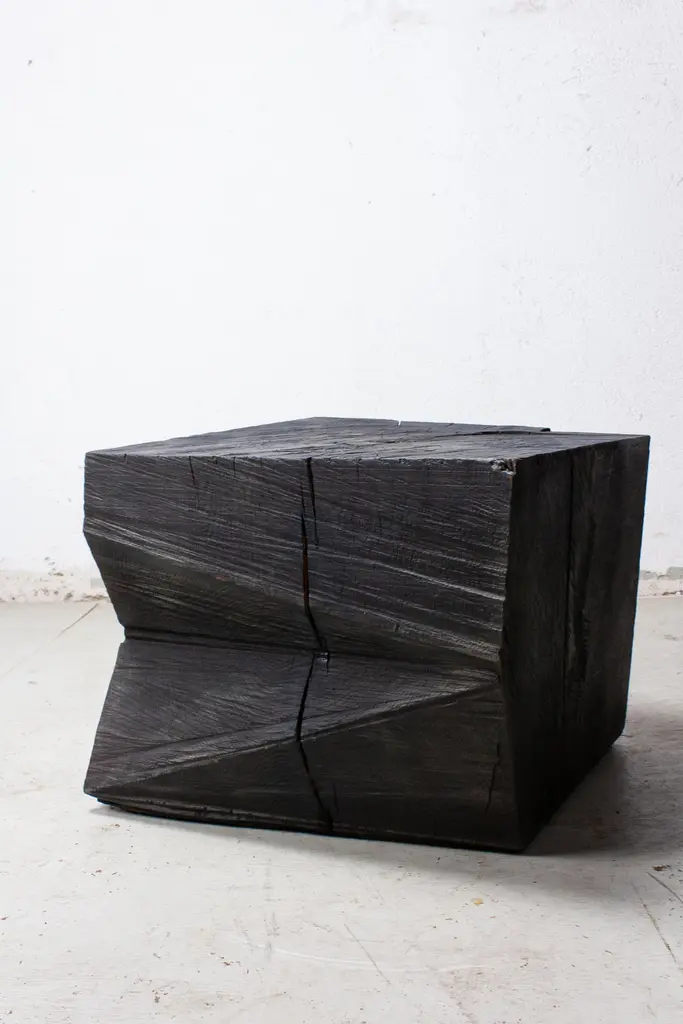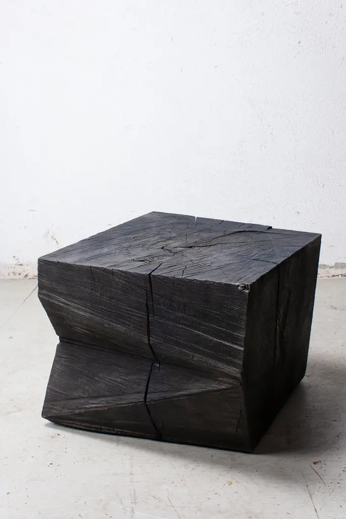 End table CT-9 by Denis Milovanov x Soha Concept(Side table, end table, stool, pedestal...)Material: Solid oakDimensions: H 34 x 40 x 40 cmSÓHA design studio conceives and produces furniture design and decorative objects in solid oak in an authentic style. Inspiration to create all these items comes from the Russian North aesthetics with its severe nature, log huts black from time and climate and scant patterns. Wood is masterfully hand processed with chainsaw or chisel, whereby producing beautiful surface patterns. The wood is soaked in boiling baths of linseed oil, creating this special patina and making each creation a very unique piece. Reacting with tanning substances under high temperature, oil gives the objects expressive and natural colours, from light brown to charcoal-black. SÓHA offers a vast array of neo-primitivist interior objects. Our kitchen utensil, wall panels, sculptures and furniture solutions are executed in one unique style and will organically fit into the interior of your home. Each piece is one-of-a-kind handmade product.Unique piece made to order.