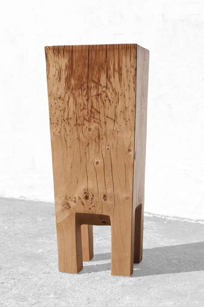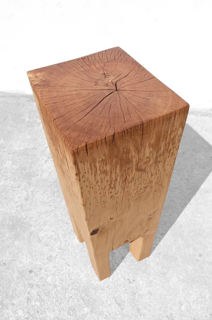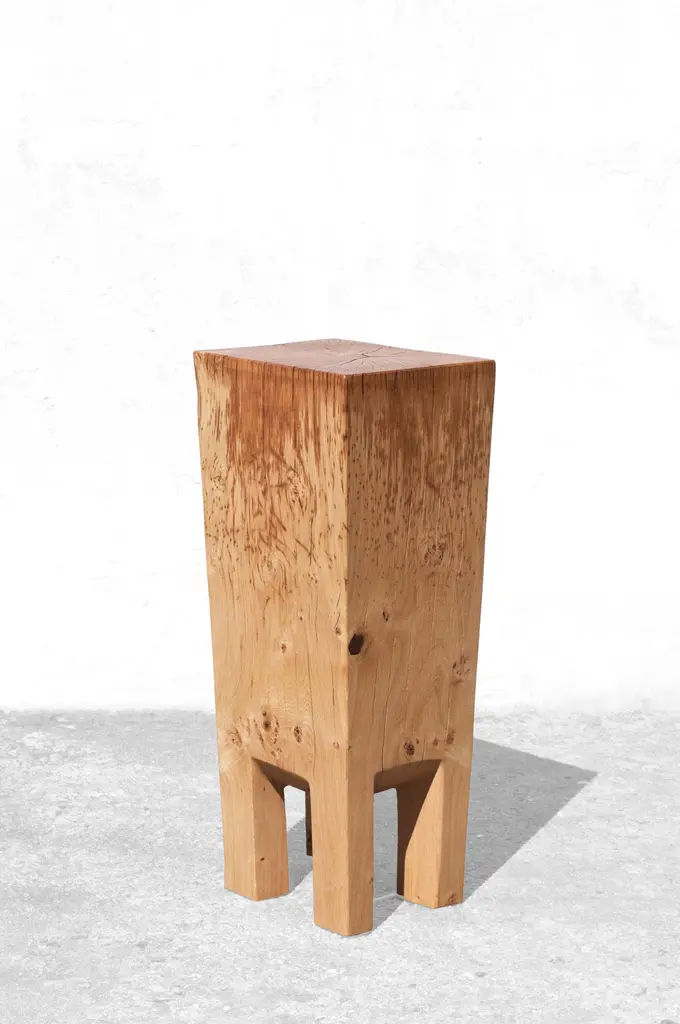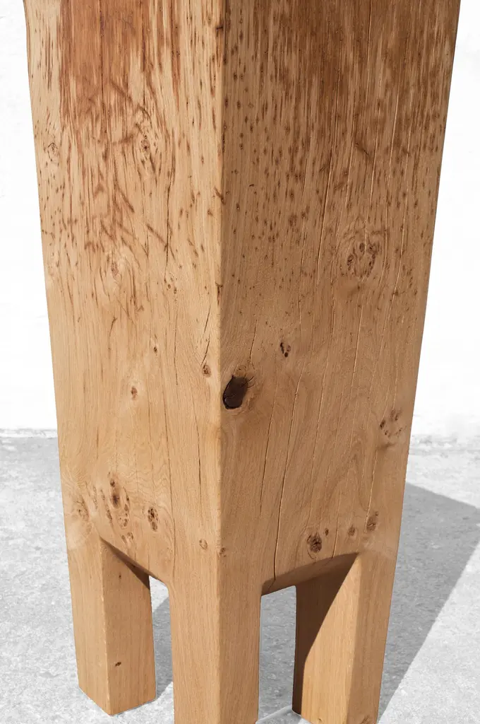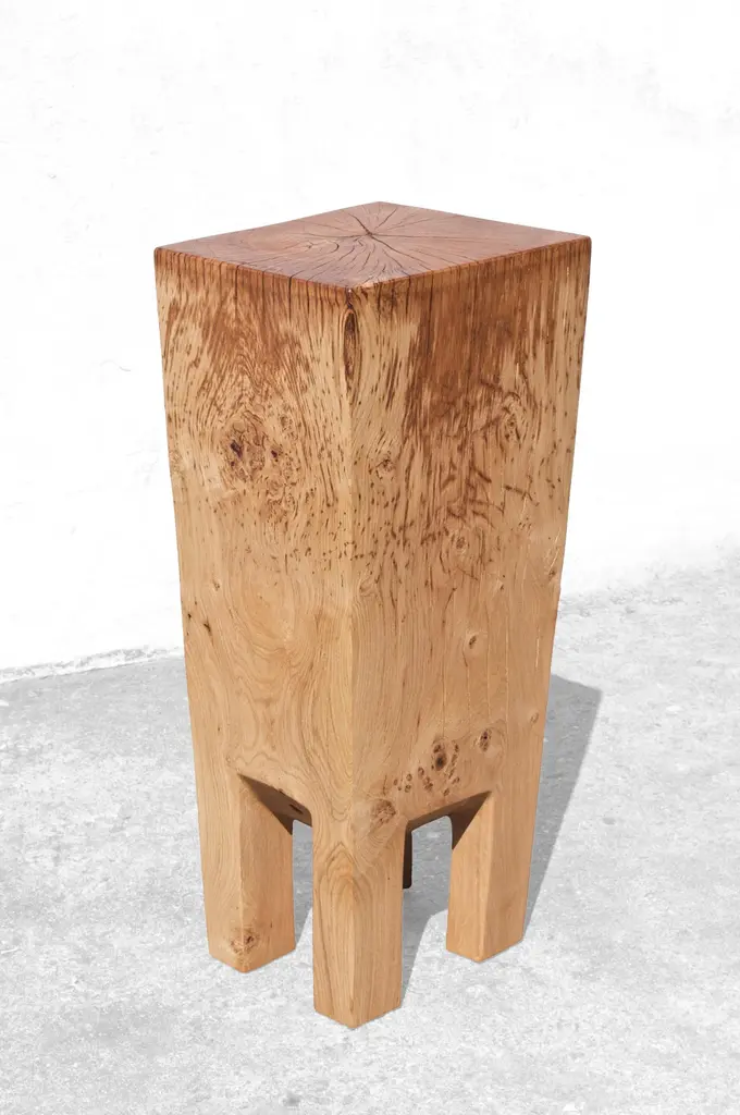 Sculpted side table by Jörg PietschmannDimensions: H 86 x W 34 x D 33 cm In Pietschmann’s sculptures, trees that for centuries were part of a landscape and founded in primordial forces tell stories inscribed in the memory of their fibers.The forms Jörg Pietschmann pares from ancient trees are extensive and astonish with their physical presence, a combination of elegance and primeval nature. Pietschmann’s sculptures are monuments to the trees from which they derive.Being endowed with the ruggedness of primeval matter gives them a veritable vitality: figures that appear to have grown into their sculptural form of their own accord. But Pietschmann’s tangibly present bodies have undergone a considerable degree of metamorphosis.In order to generate these unique tree specimens he examines the tree’s morphology and intrinsic inner map until the courses of its grain, of a curve, knots and cracks concur with his projections. The exploratory process is accompanied by constant modification, giving at the start of each new piece no more than an intimation of the figure that will later emerge. In their completion, Pietschmann’s sculptures once more become universal form.