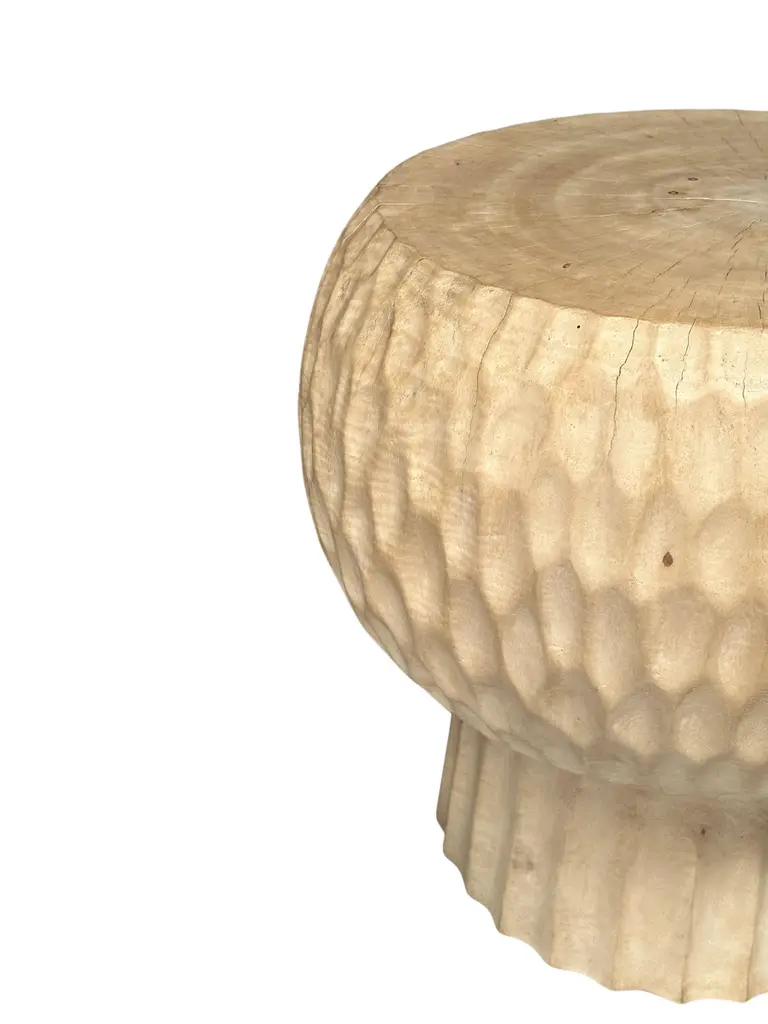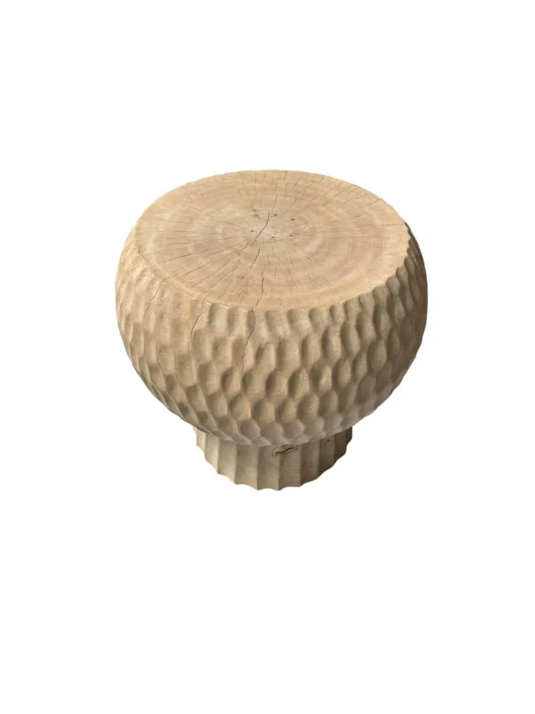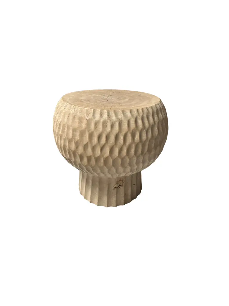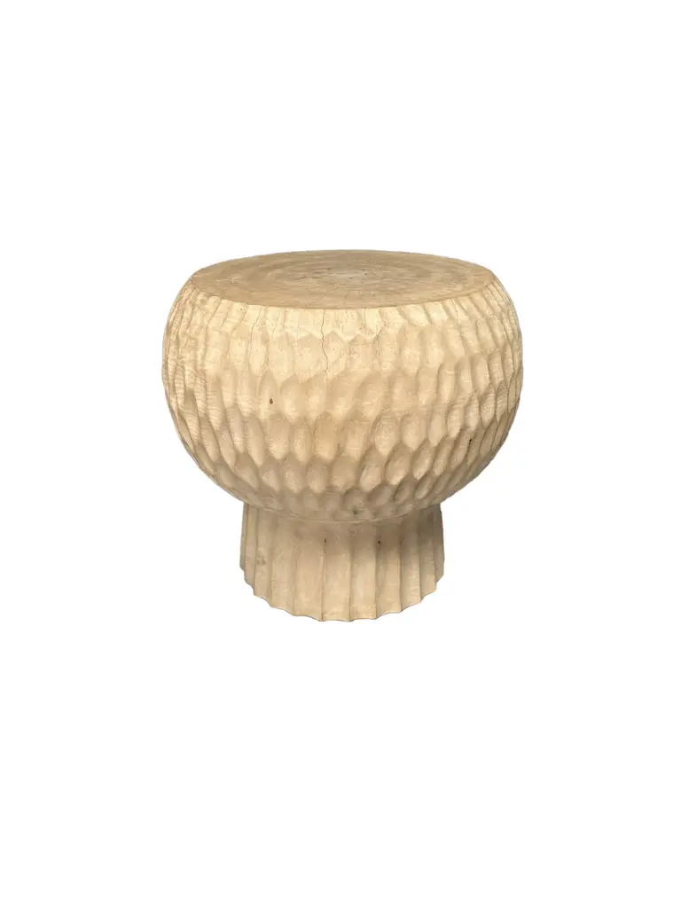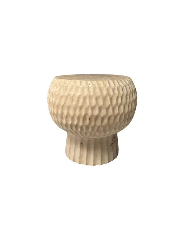Introducing our exquisite round side table, expertly crafted from rich mango wood. This stunning piece features intricate geometric hand-carved details on its sides, showcasing the artisan's skill and adding a unique visual texture. The natural variations in the wood grain bring warmth and character, making it a perfect addition to any living space. Its compact design makes it versatile for use beside a sofa or bed, while the striking craftsmanship ensures it serves as a beautiful focal point in your home decor. Elevate your interior with this blend of functionality and artistry. To achieve its cream pigment the wood was bleached several times and then sanded and smoothed. Dimensions; The table top Diameter; 45cm (17.71in), Diameter at widest point 50cm (19.68in) / Height 45cm (17.71in)