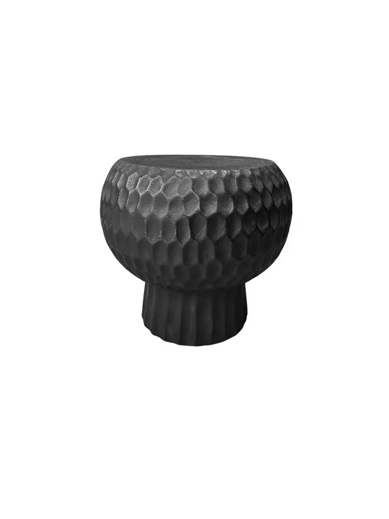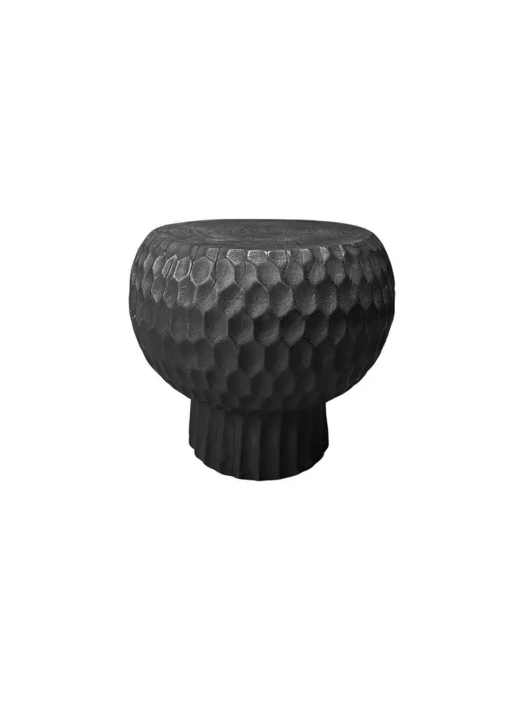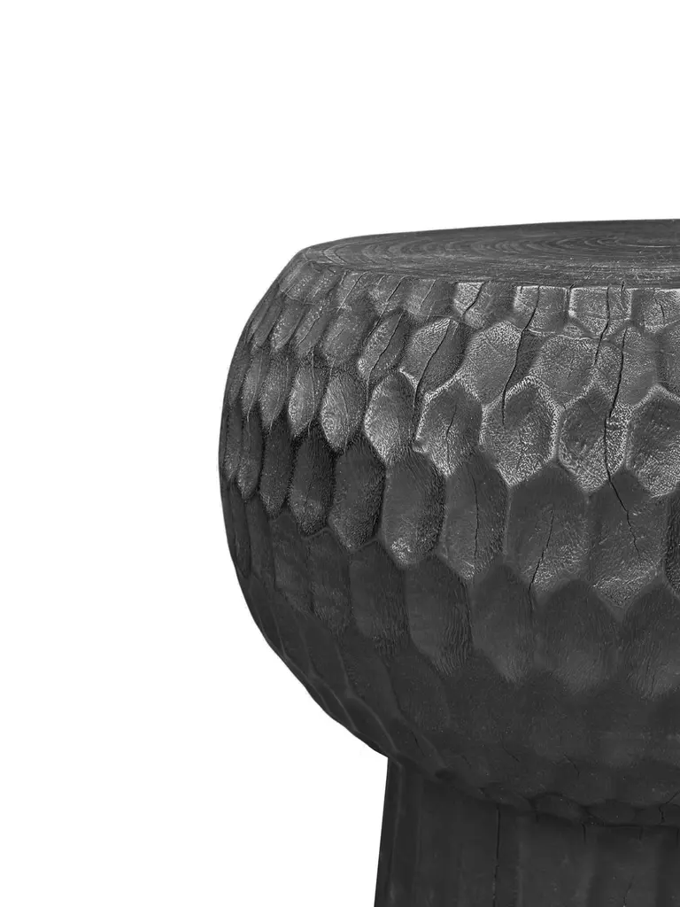 Introducing our exquisite round side table, expertly crafted from rich mango wood. This stunning piece features intricate geometric hand-carved details on its sides, showcasing the artisan's skill and adding a unique visual texture. The natural variations in the wood grain bring warmth and character, making it a perfect addition to any living space. Its compact design makes it versatile for use beside a sofa or bed, while the striking craftsmanship ensures it serves as a beautiful focal point in your home decor. Elevate your interior with this blend of functionality and artistry. To achieve its black pigment the wood was burned several times and then sanded and smoothed. Dimensions; The table top Diameter; 45cm (17.71in), Diameter at widest point 50cm (19.68in) / Height 45cm (17.71in)