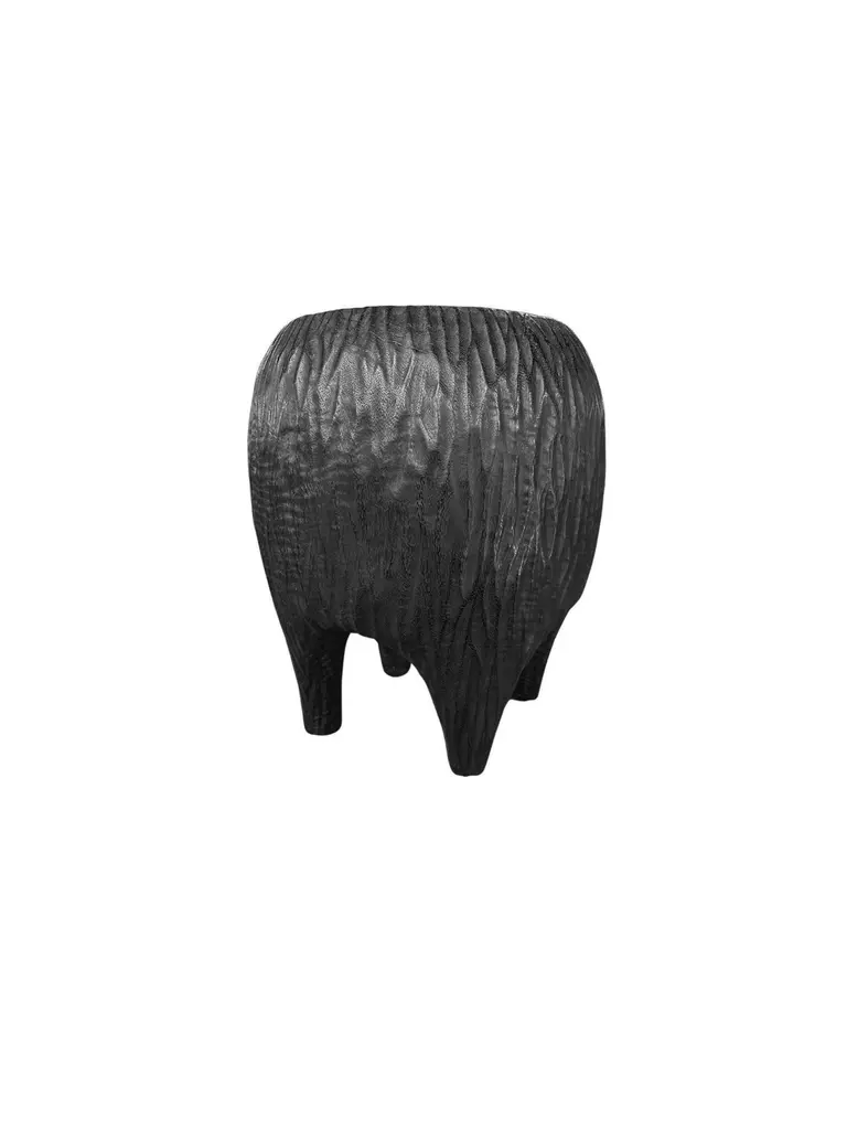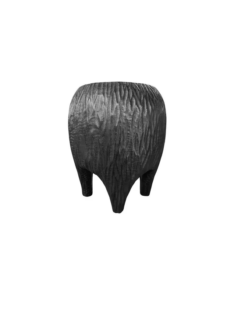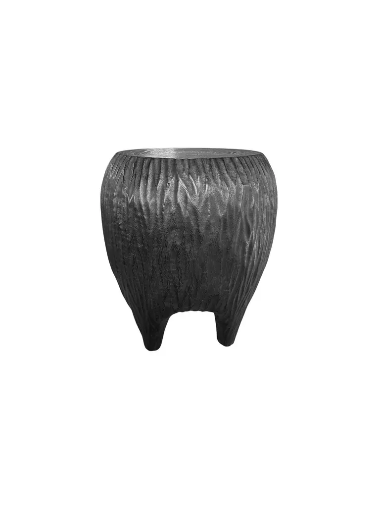 Introducing a stunning sculptural mango wood side table that beautifully blends artistry and functionality. This exquisite piece features intricately carved sides that showcase the natural grain of the wood, adding depth and texture to its design. The table stands gracefully on elegant, curved narrow legs, which lend a touch of sophistication and ensure stability. Perfect for any living space, this side table serves as a stylish accent while providing a warm, organic feel to your home decor. Its unique craftsmanship makes it not just a piece of furniture, but a true work of art. To achieve its black pigment the wood was burned several times and finished with a clear coat. Dimensions; Diameter at widest point 40cm (15.74in) / Table Top Diameter 30cm (11.81in)