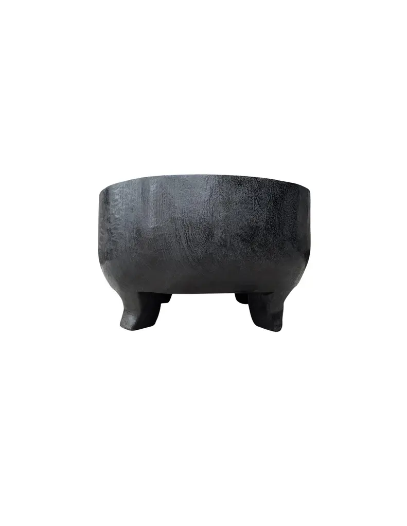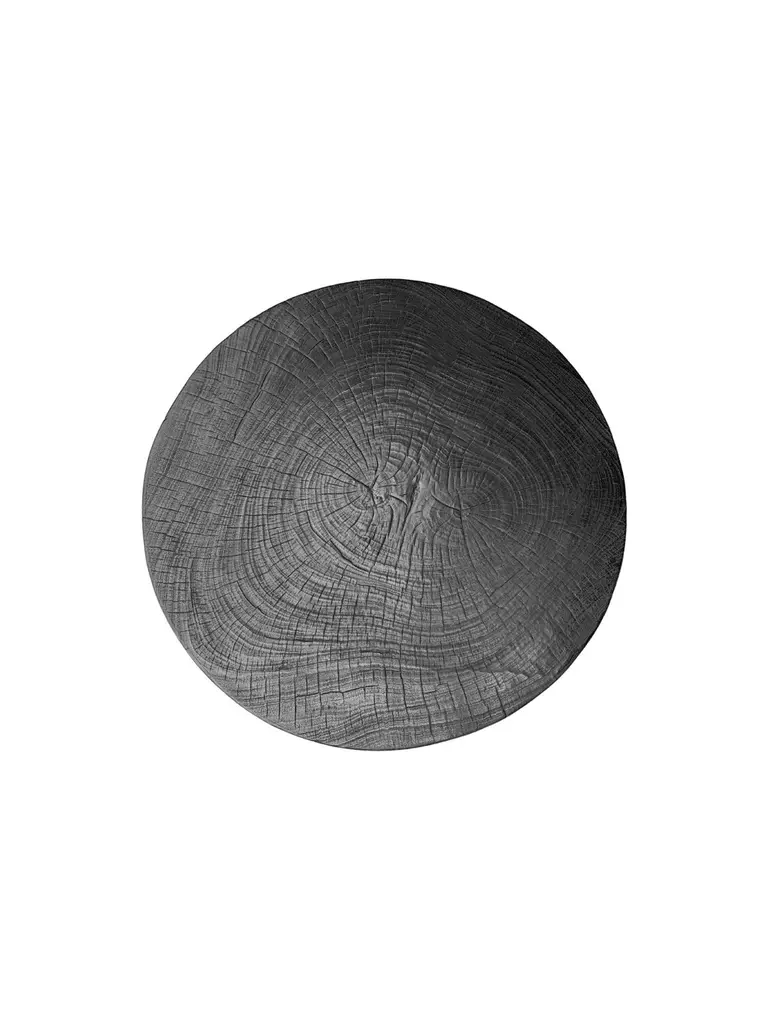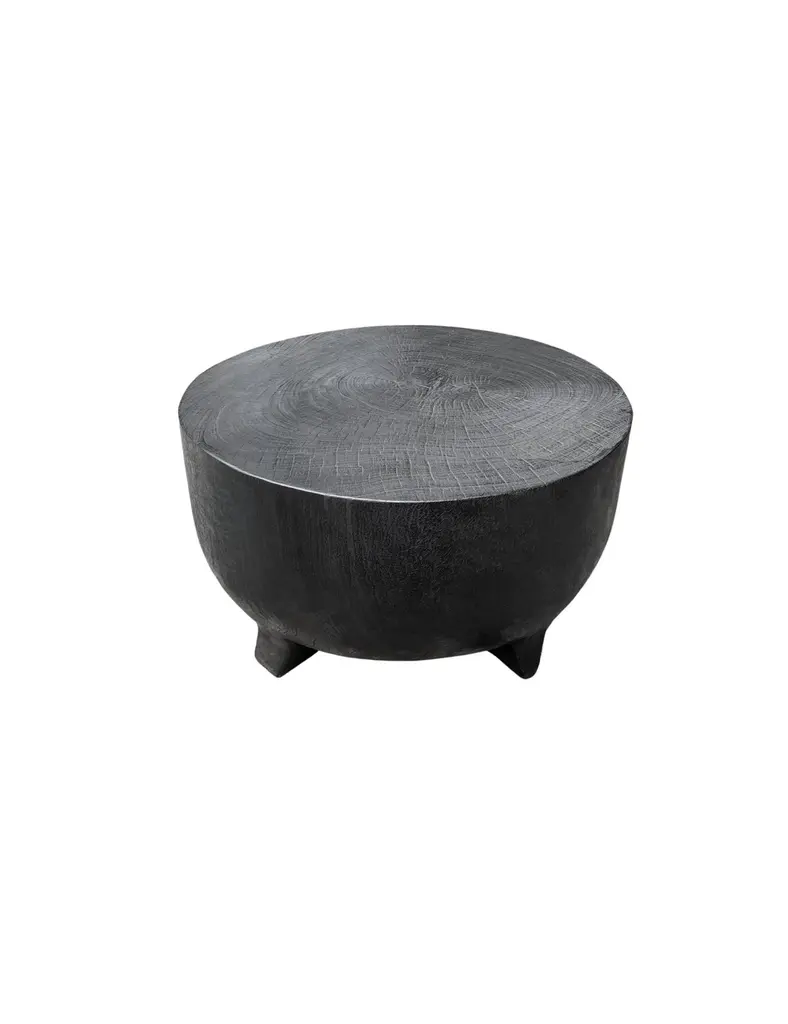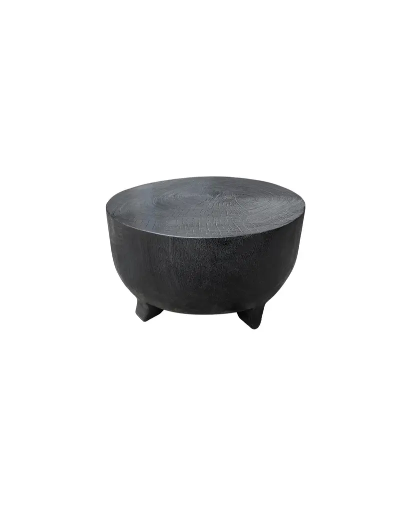 A wonderfully sculptural round side table elevated on four, low and curved legs. Its rich black pigment was achieved through burning the wood three times. Its neutral pigment and subtle wood texture makes it perfect for any space. A uniquely sculptural and versatile piece. This table was crafted from a solid block of mango wood.