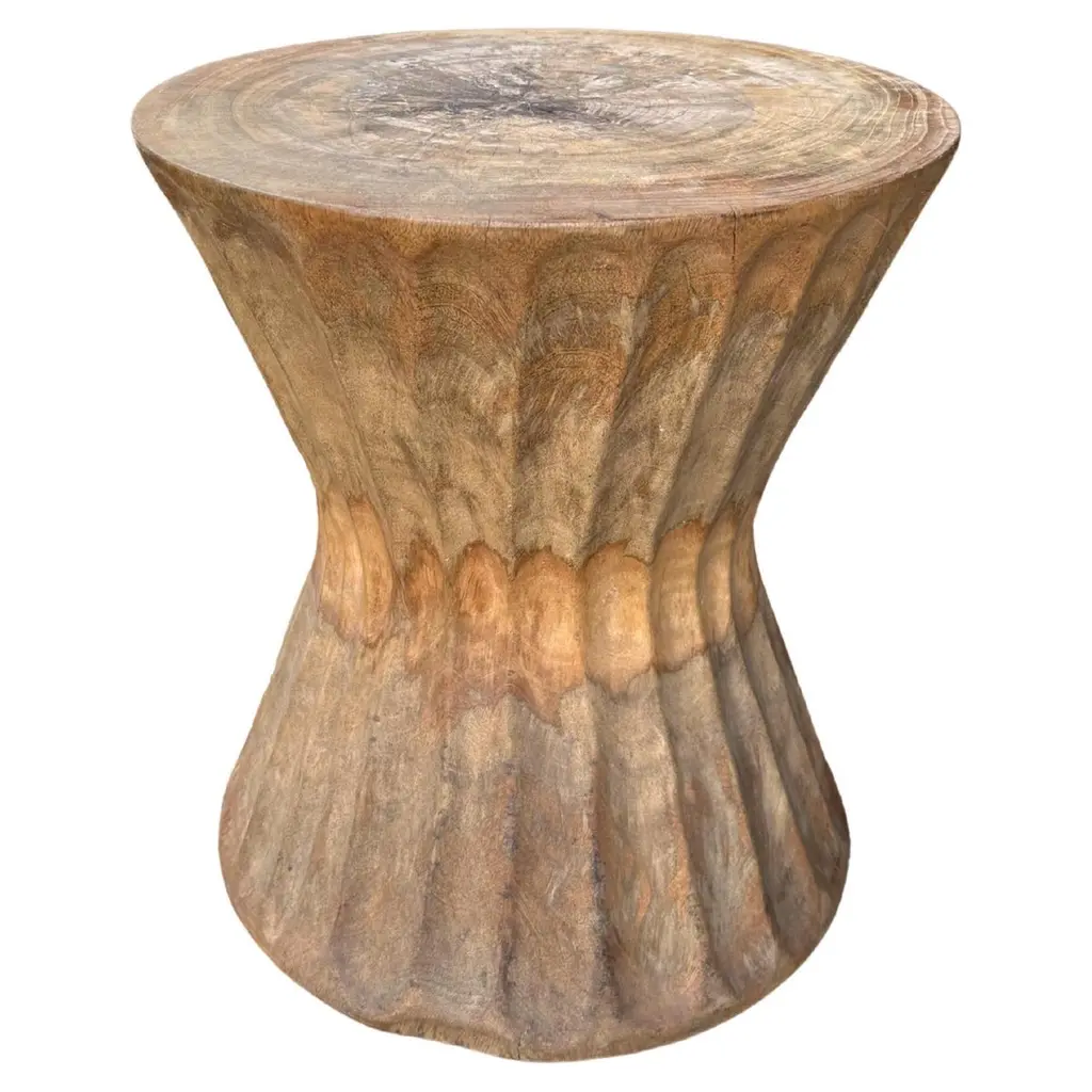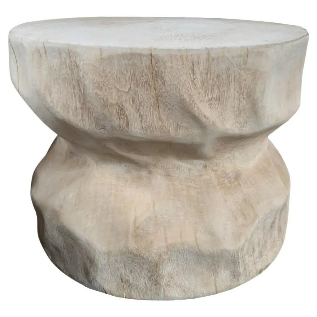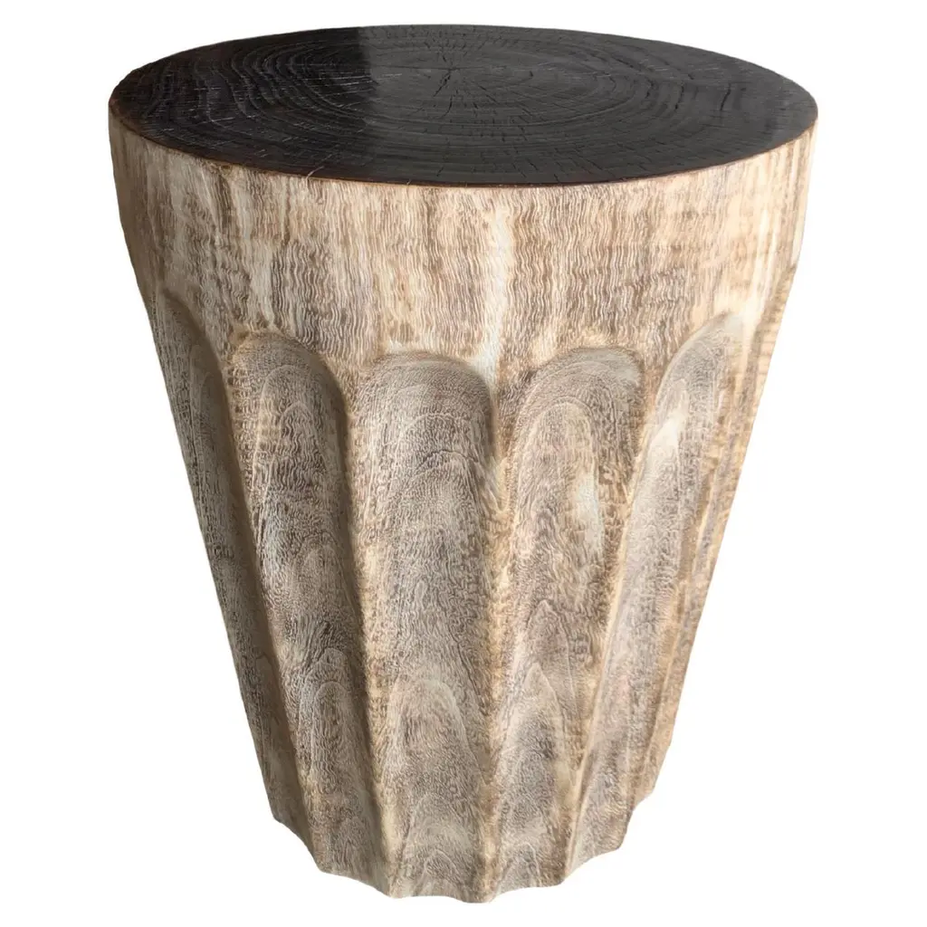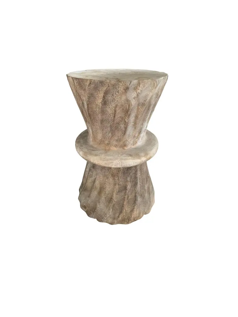 This wonderfully sculptural round side table features a ribbed & spiral pattern along its sides. The table's neutral pigment makes it perfect for any space. A uniquely sculptural and versatile piece certain to invoke conversation. It was crafted from a solid block of mango wood. It features a sanded down finish exposing a wonderful mix of wood textures. The shades of white present on the table was achieved through a bleaching process.
