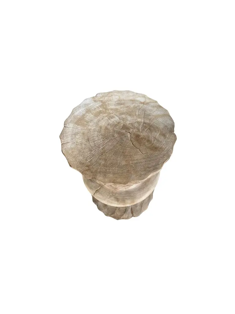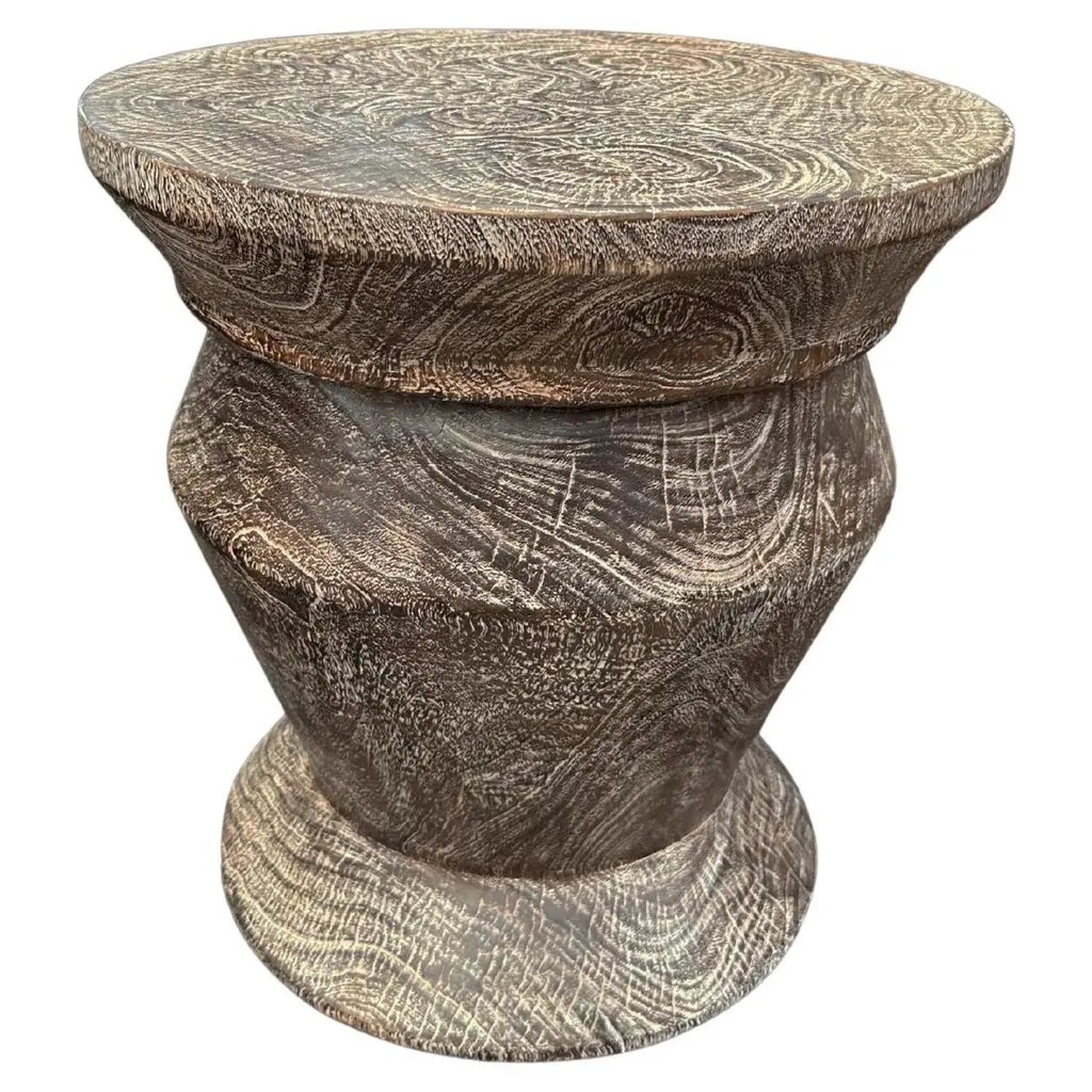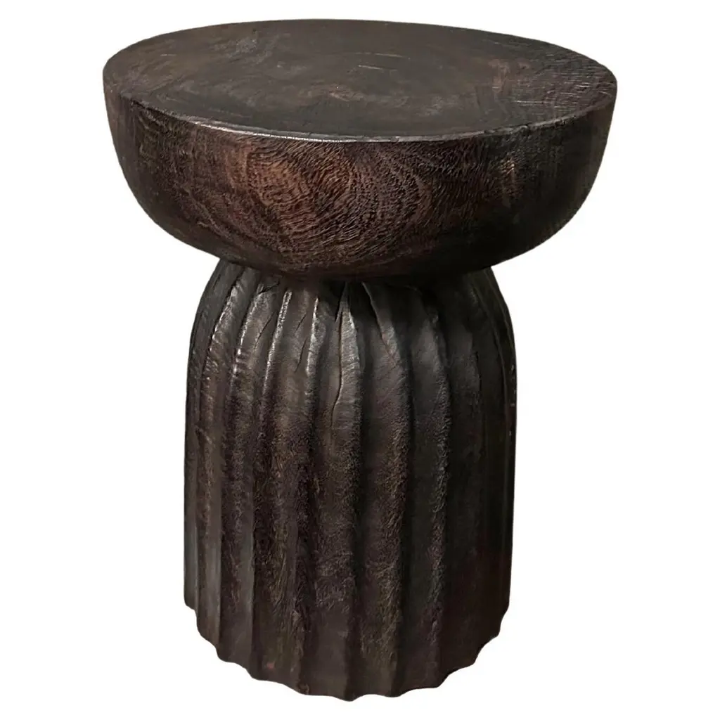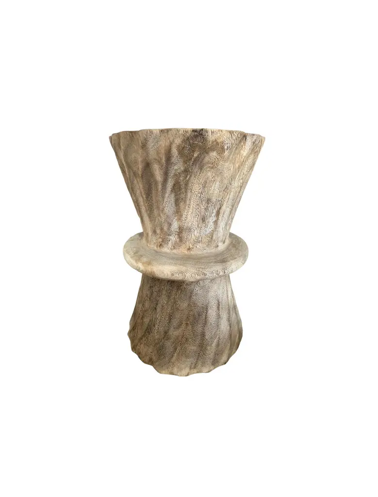 This wonderfully sculptural round side table features a ribbed & spiral pattern along its sides. The table's neutral pigment makes it perfect for any space. A uniquely sculptural and versatile piece certain to invoke conversation. It was crafted from a solid block of mango wood. It features a sanded down finish exposing a wonderful mix of wood textures. The shades of white present on the table was achieved through a bleaching process.