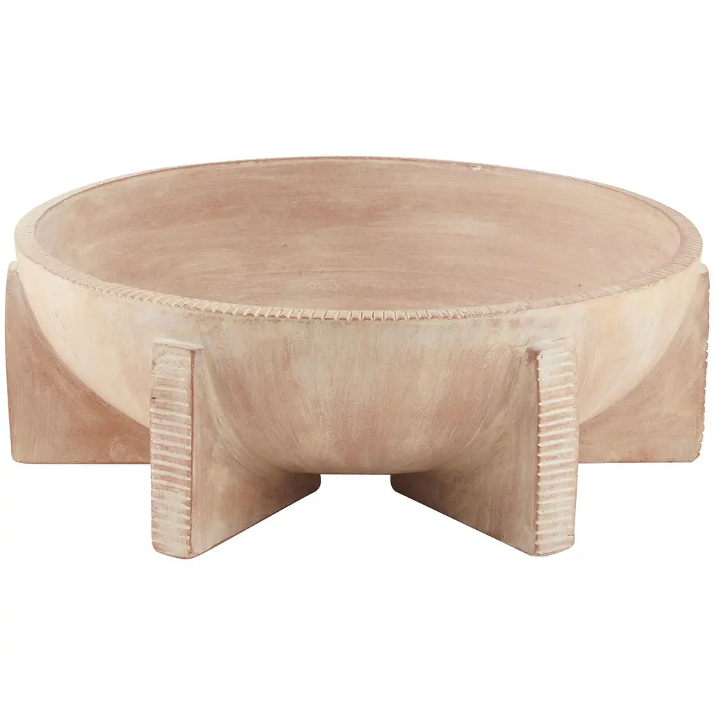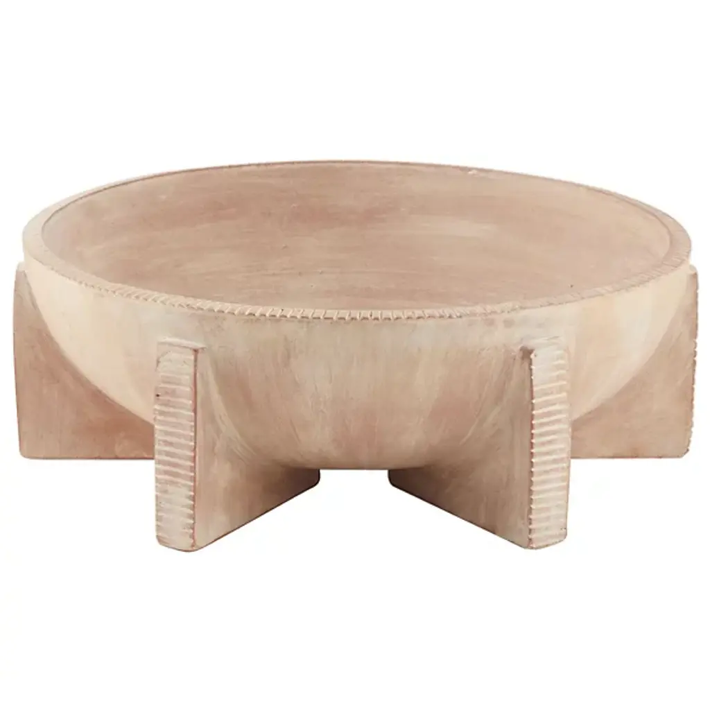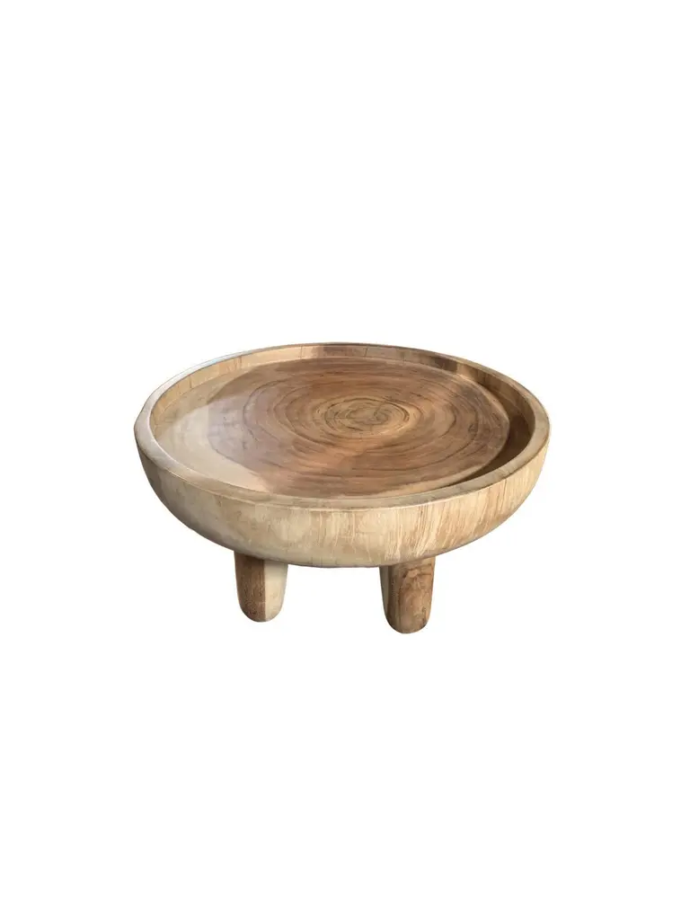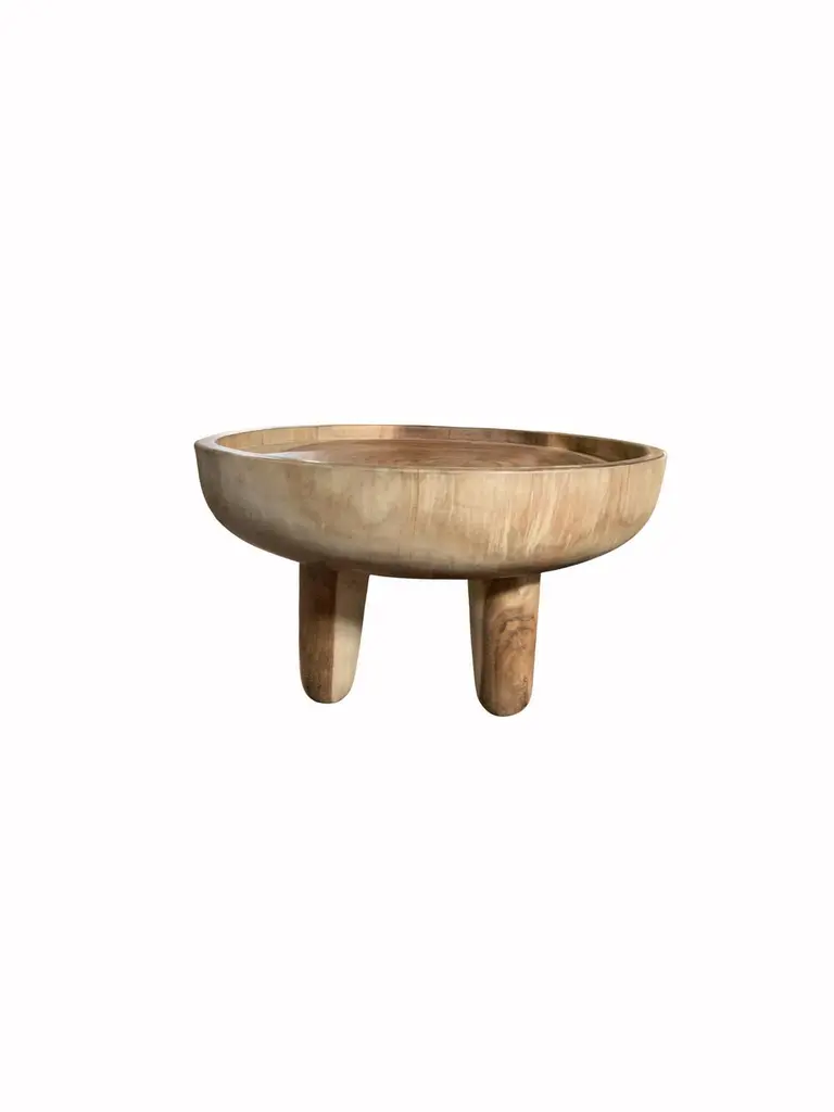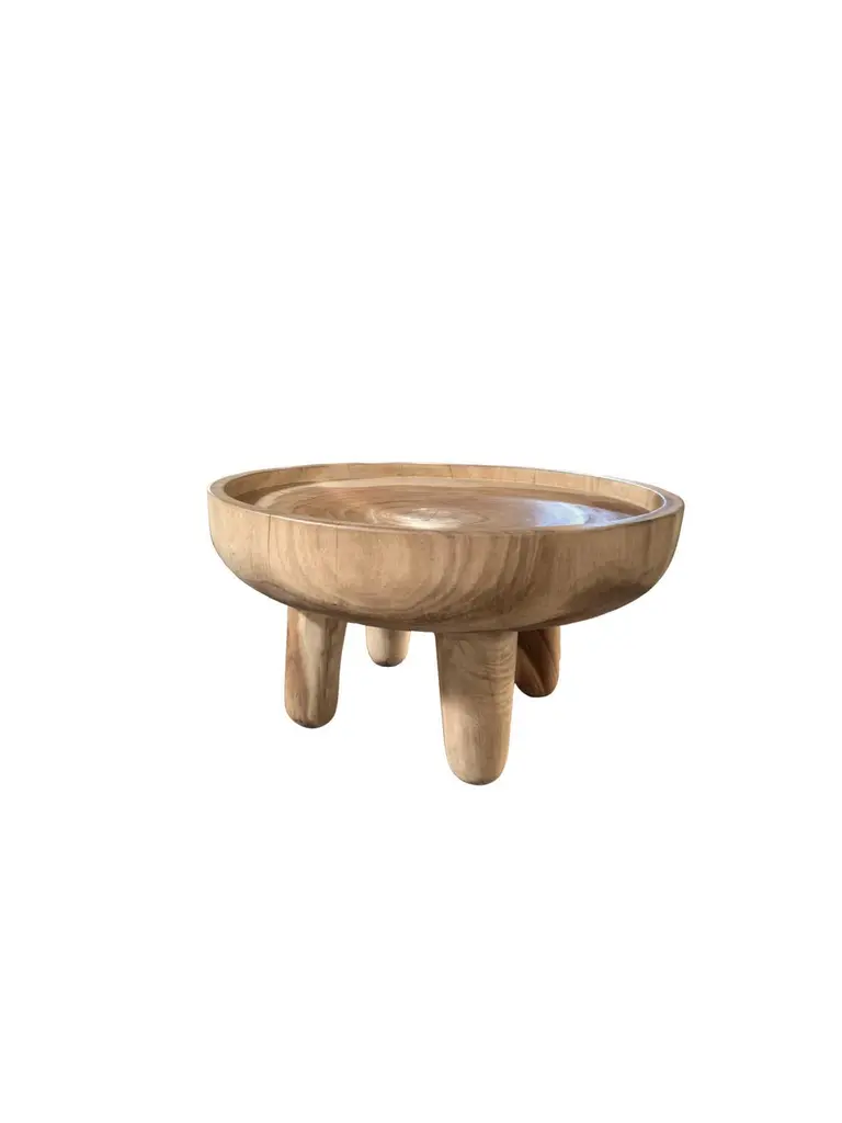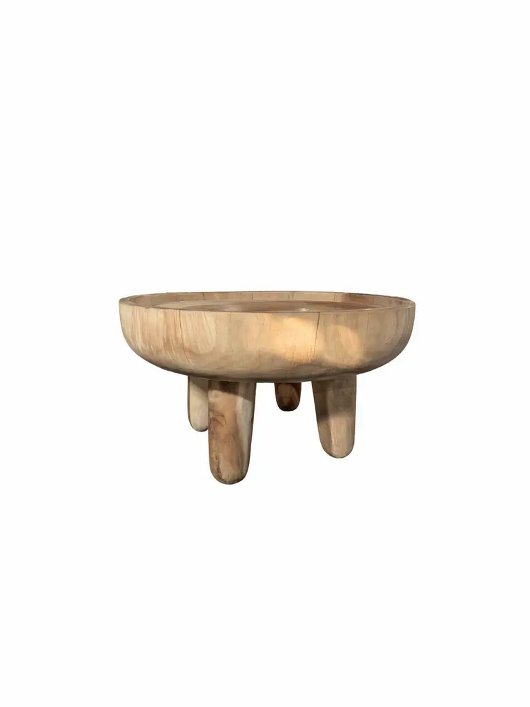 A wonderfully sculptural round side table. The table was meticulously sanded down and finished with a clear coat in order to achieve its smooth texture. Its neutral pigment and subtle wood texture makes it perfect for any space. A uniquely sculptural and versatile piece. This table features 4 angular, cylindrical and curved legs. The table top is bordered by a narrow , uninterrupted ridge that is featured on its full circumference. It was crafted from a solid block of mango wood.