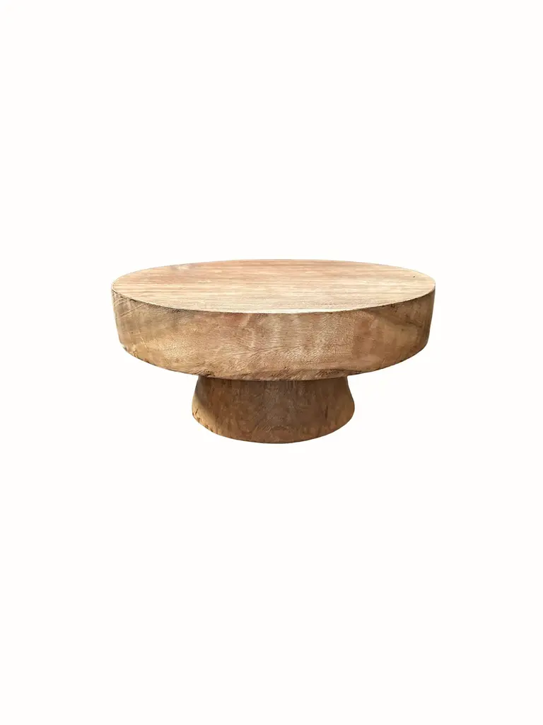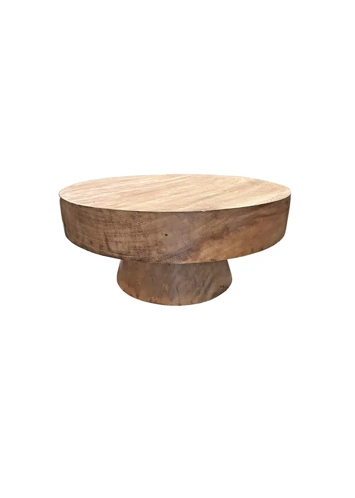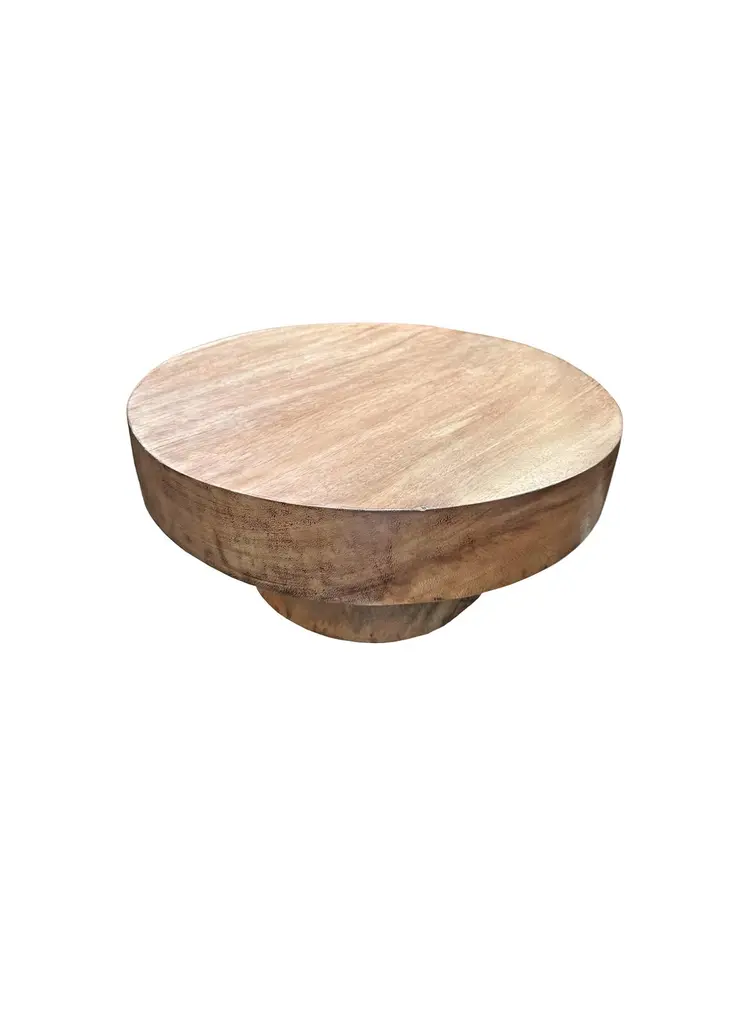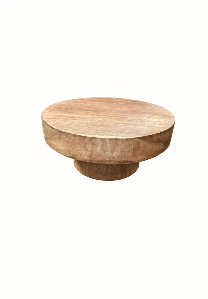 A wonderfully sculptural round side table featuring a natural finish. Its neutral pigment and subtle wood texture makes it perfect for any space. This table was crafted from mango wood and has a smooth texture.