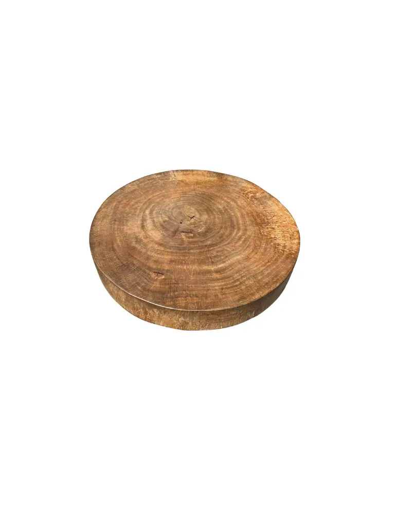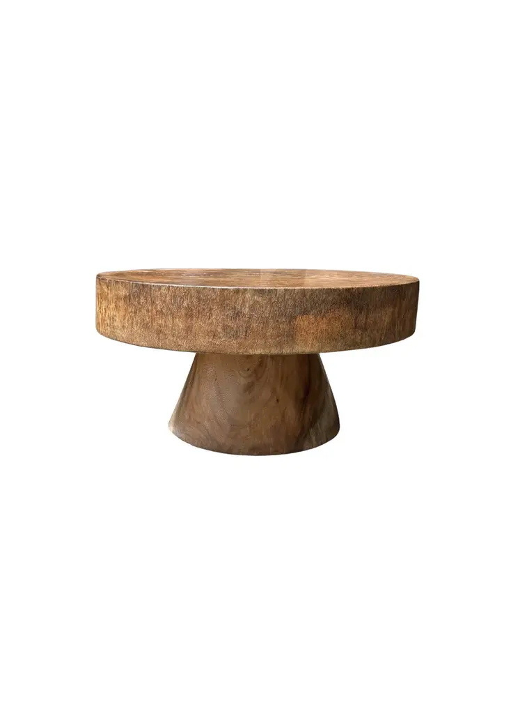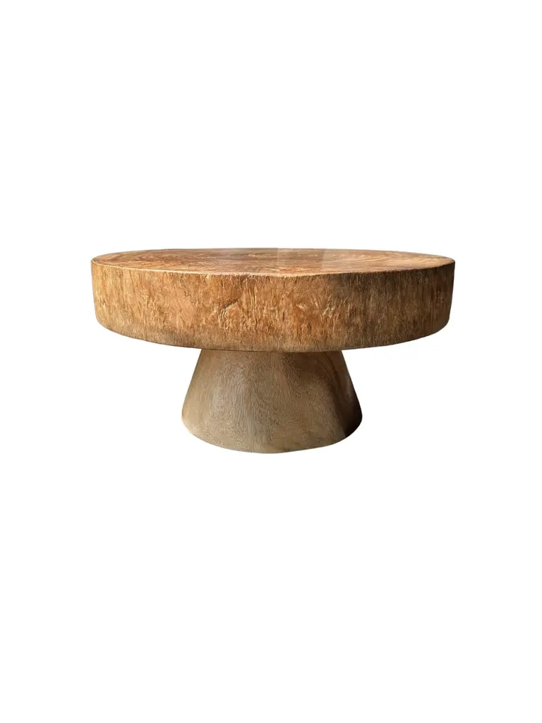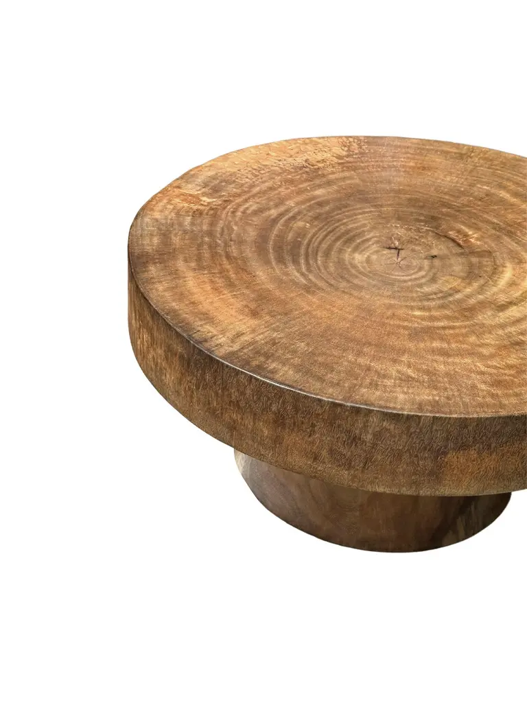 A wonderfully sculptural round side table featuring a natural finish. Its neutral pigment and subtle wood texture makes it perfect for any space. A uniquely sculptural and versatile piece certain to invoke conversation. This table was crafted from Mango wood and has a smooth texture.