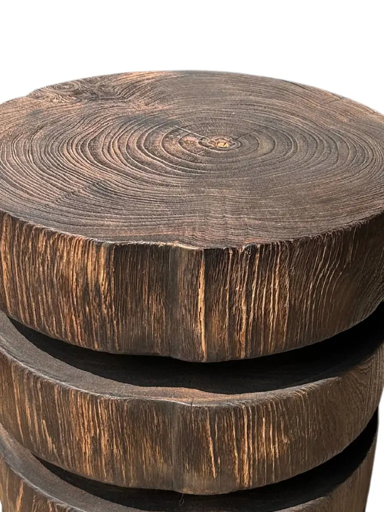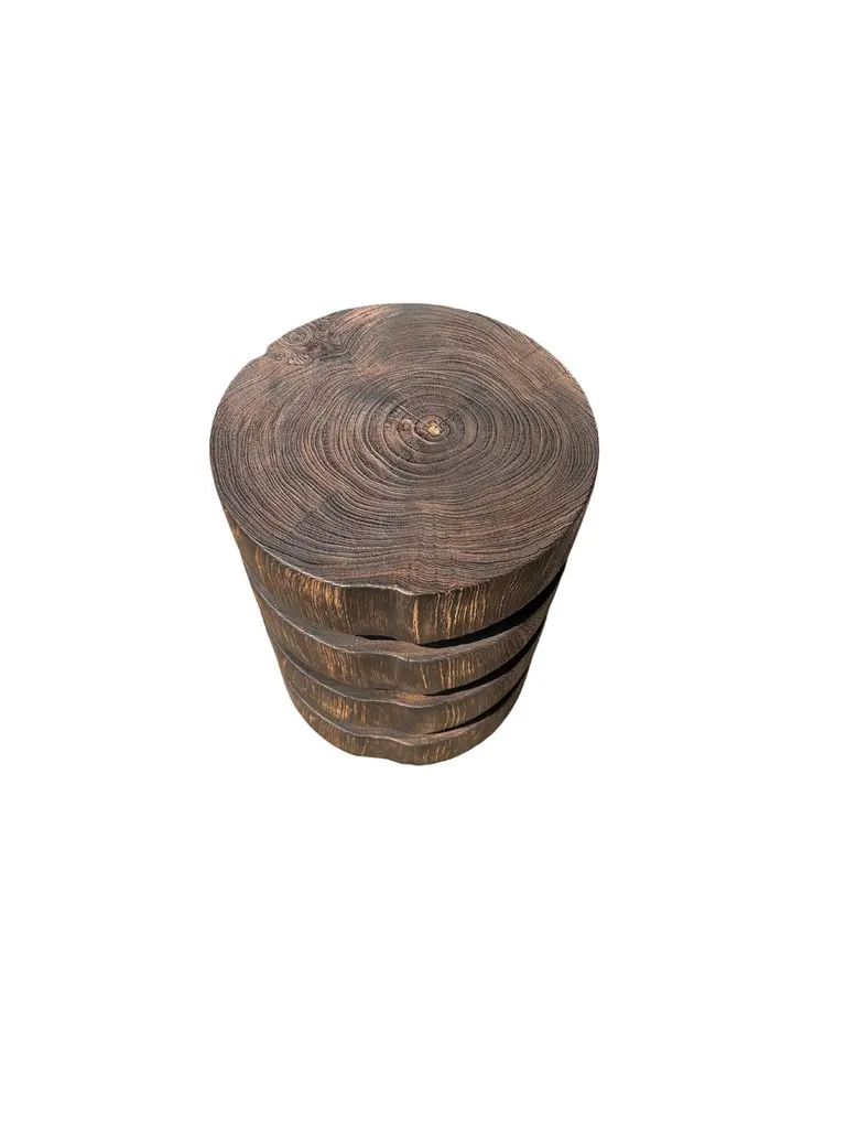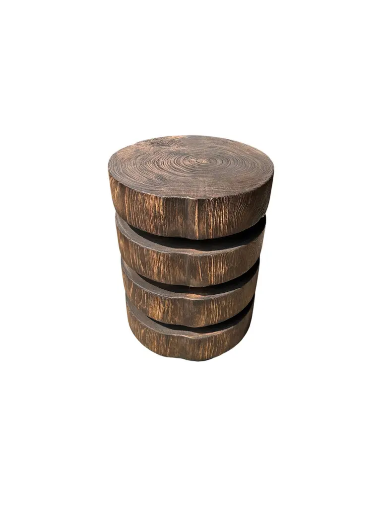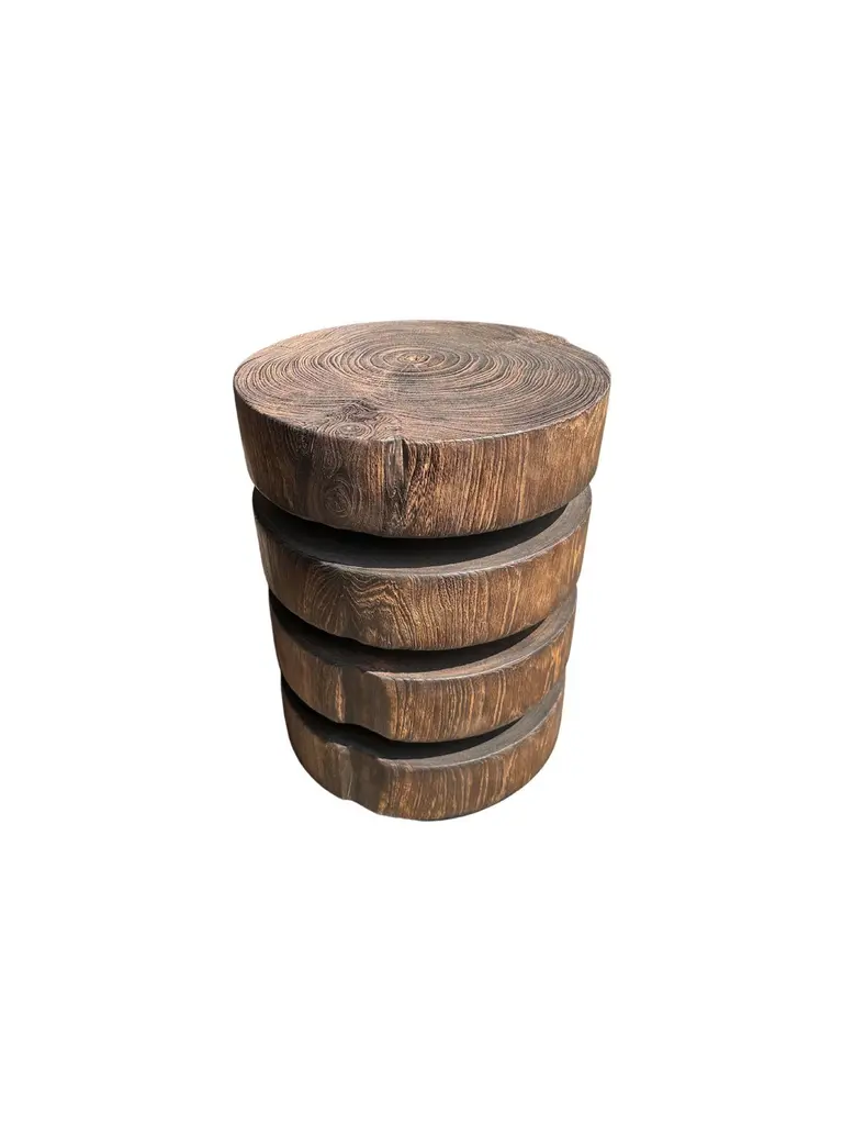 A wonderfully sculptural round side table featuring a natural finish. Its neutral pigment and subtle wood texture makes it perfect for any space. This table was crafted from solid suar wood, made to resemble stacked slabs of suar wood this table was actually carefully crafted for a single block of wood.