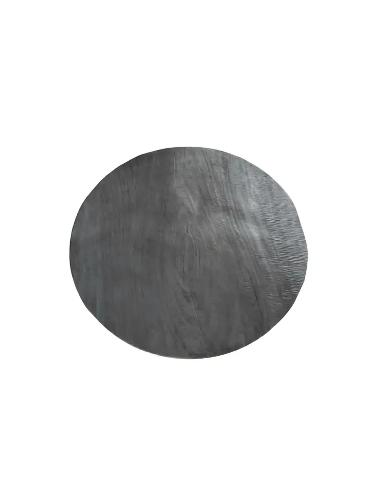A wonderfully sculptural round side table with a burnt finish. Its neutral pigment and wood texture makes it perfect for any space. It features a tapered base and large round table top. A uniquely sculptural and versatile piece certain to invoke conversation. This table was crafted from mango wood and has a smooth texture.