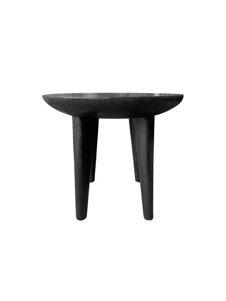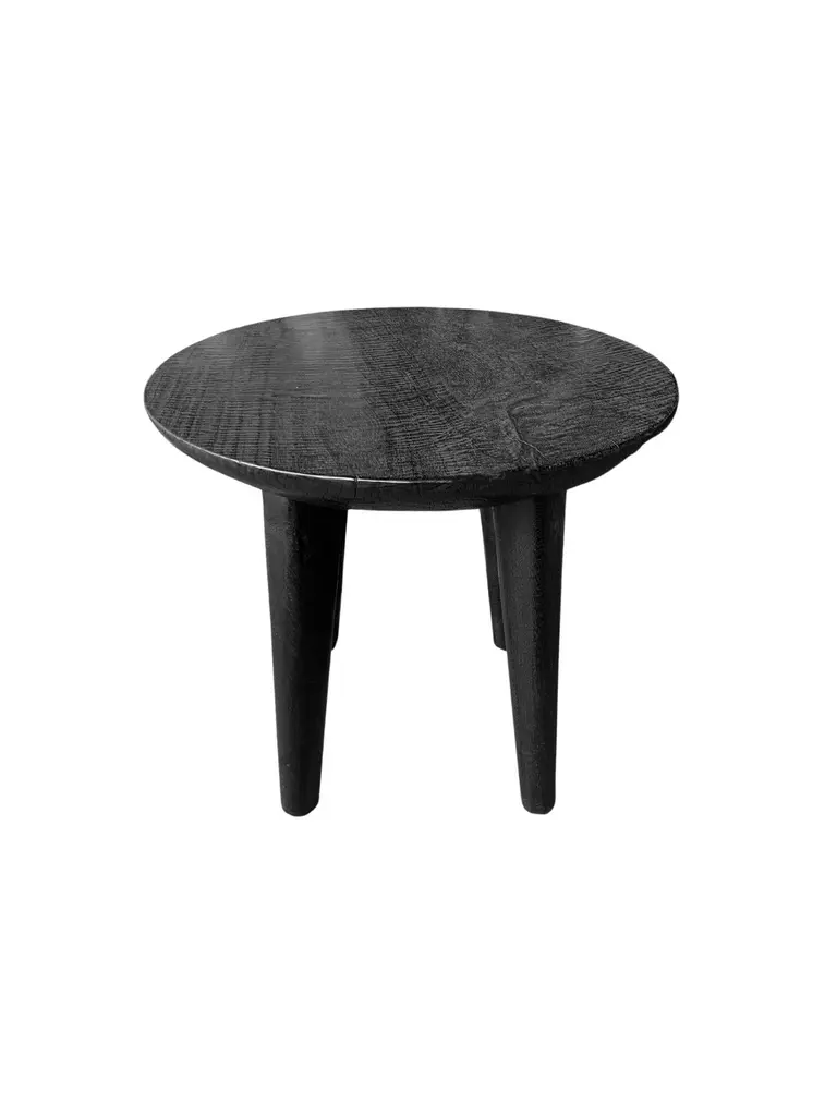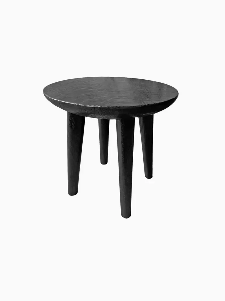 A wonderfully sculptural round side table with narrowly proportioned legs. Its stark black pigment was achieved through burning the wood three times. Its neutral pigment and subtle wood texture makes it perfect for any space. A uniquely sculptural and versatile piece certain to invoke conversation. This table was crafted from mango wood and has a smooth texture.