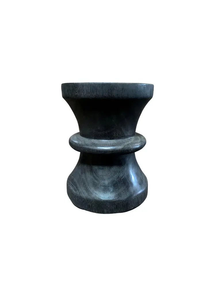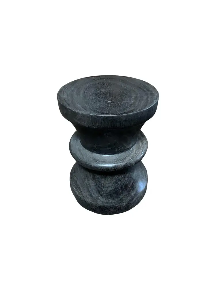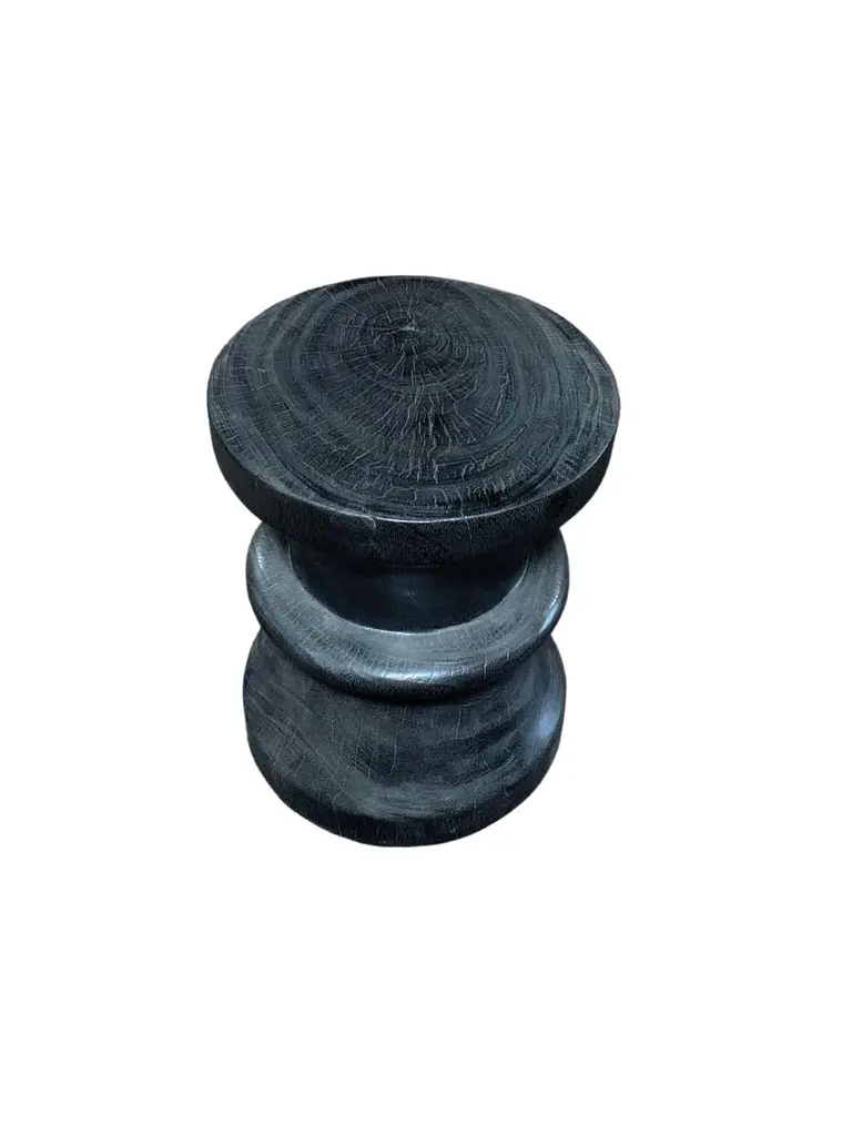 A wonderfully sculptural round side table. Its rich black pigment was achieved through burning the wood three times. Its neutral pigment and subtle wood texture makes it perfect for any space. A uniquely sculptural and versatile piece certain to invoke conversation. This table was crafted from mango wood and has a smooth texture.