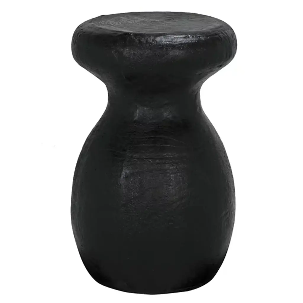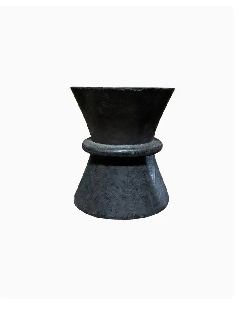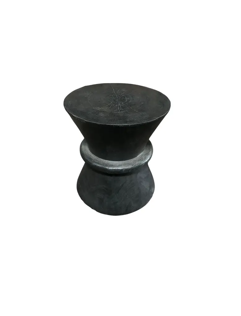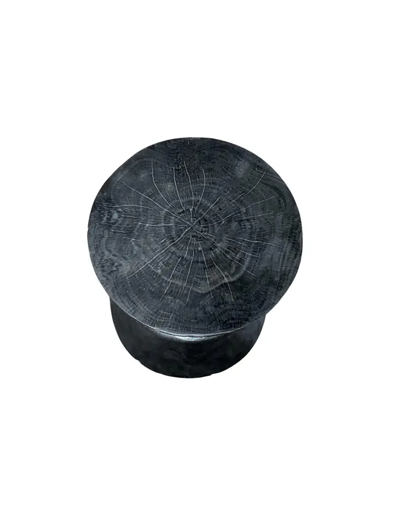 A wonderfully sculptural round side table. Its rich black pigment was achieved through burning the wood three times. Its neutral pigment and subtle wood texture makes it perfect for any space. A uniquely sculptural and versatile piece certain to invoke conversation. This table was crafted from mango wood and has a smooth texture.