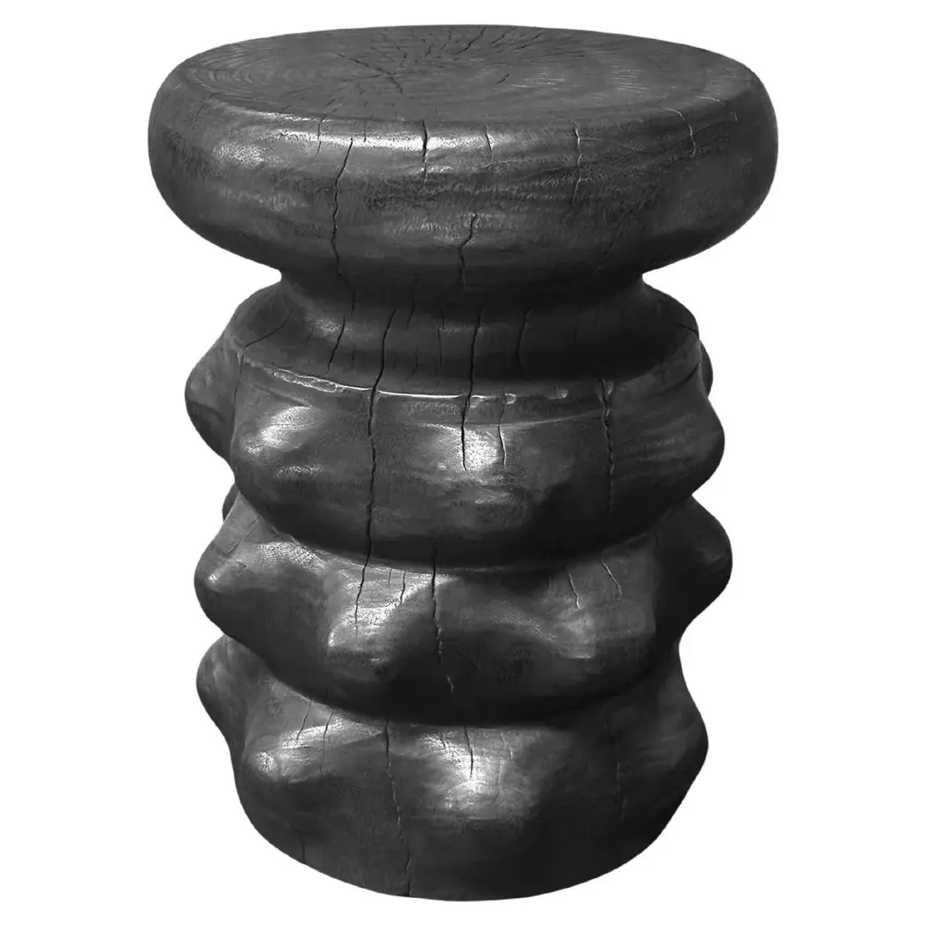 A wonderfully sculptural side table resembling a pile a river stones in a burnt finish. Its neutral pigment and subtle wood texture makes it perfect for any space. To achieve its black tone, the wood was burnt multiple times and then finished with a clear coat. This table was crafted from mango wood and has a smooth texture.