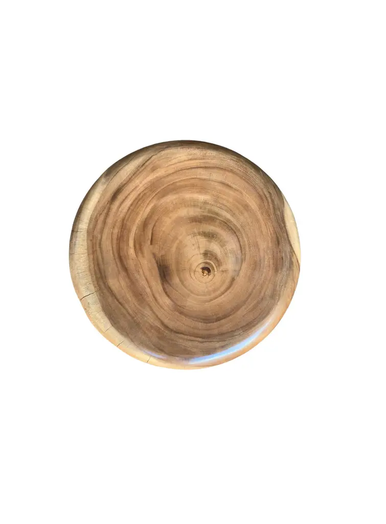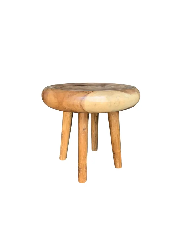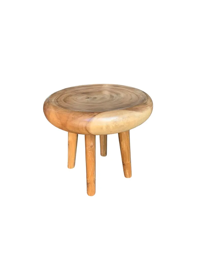 A wonderfully sculptural round side table with narrowly proportioned legs. Its neutral pigment and subtle wood texture makes it perfect for any space. A uniquely sculptural and versatile piece certain to invoke conversation. This table was crafted from mango wood and has a smooth texture.