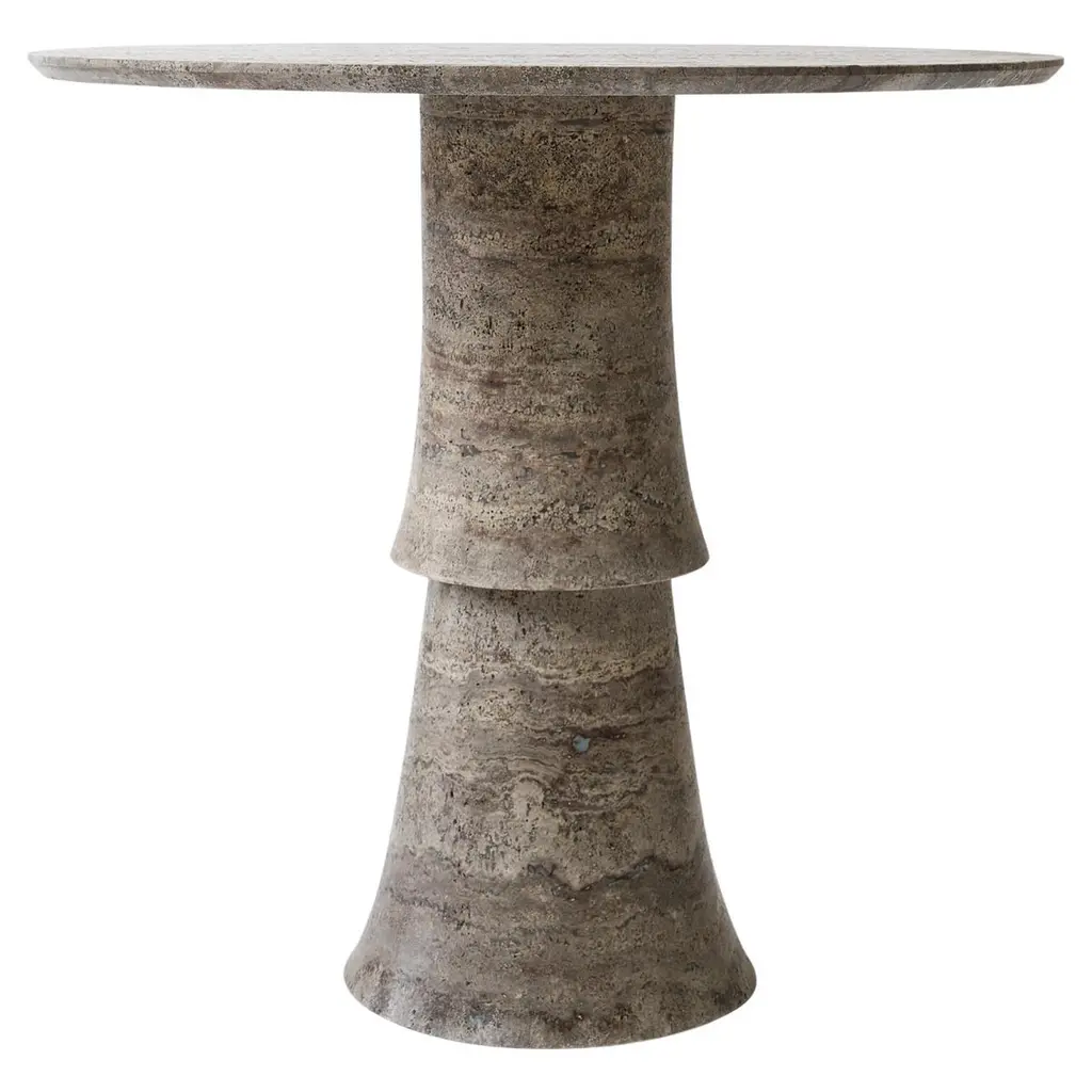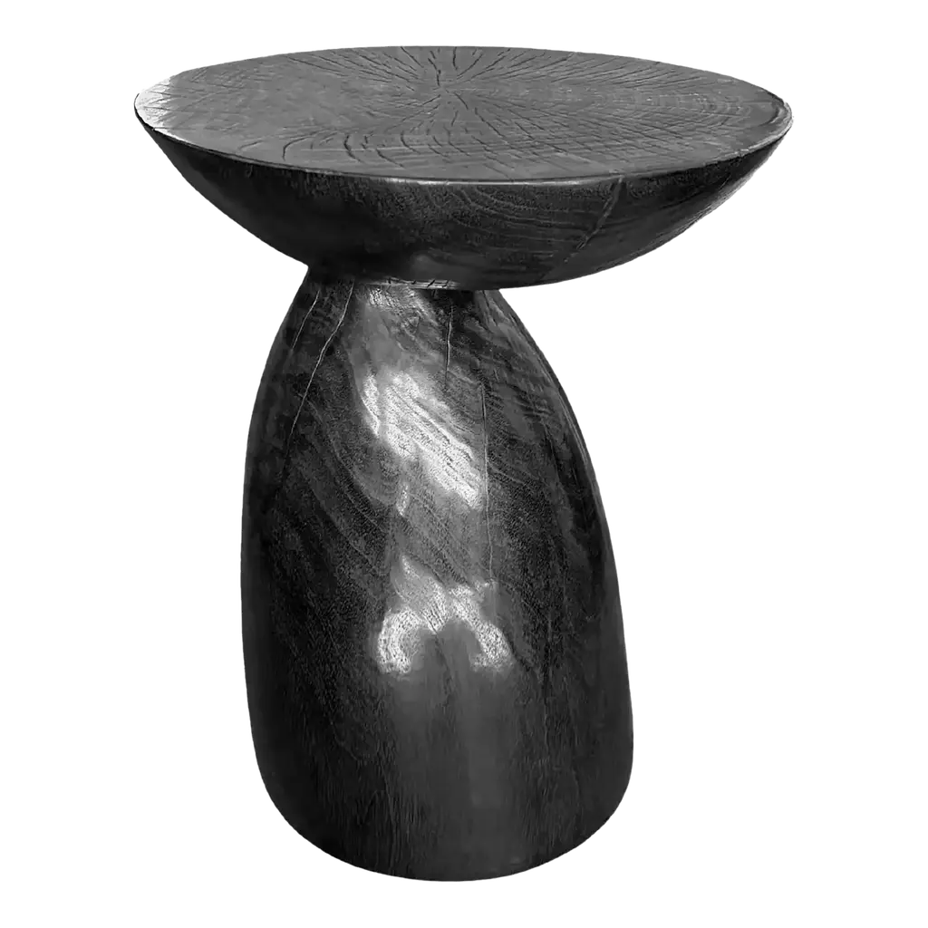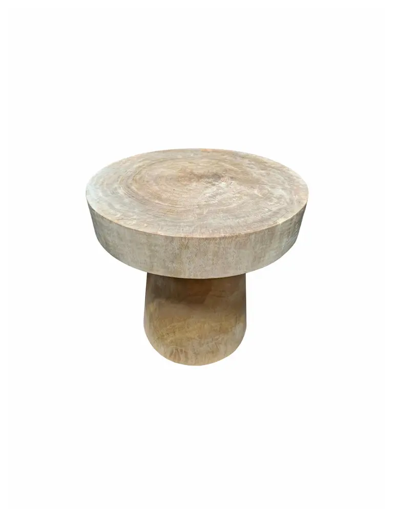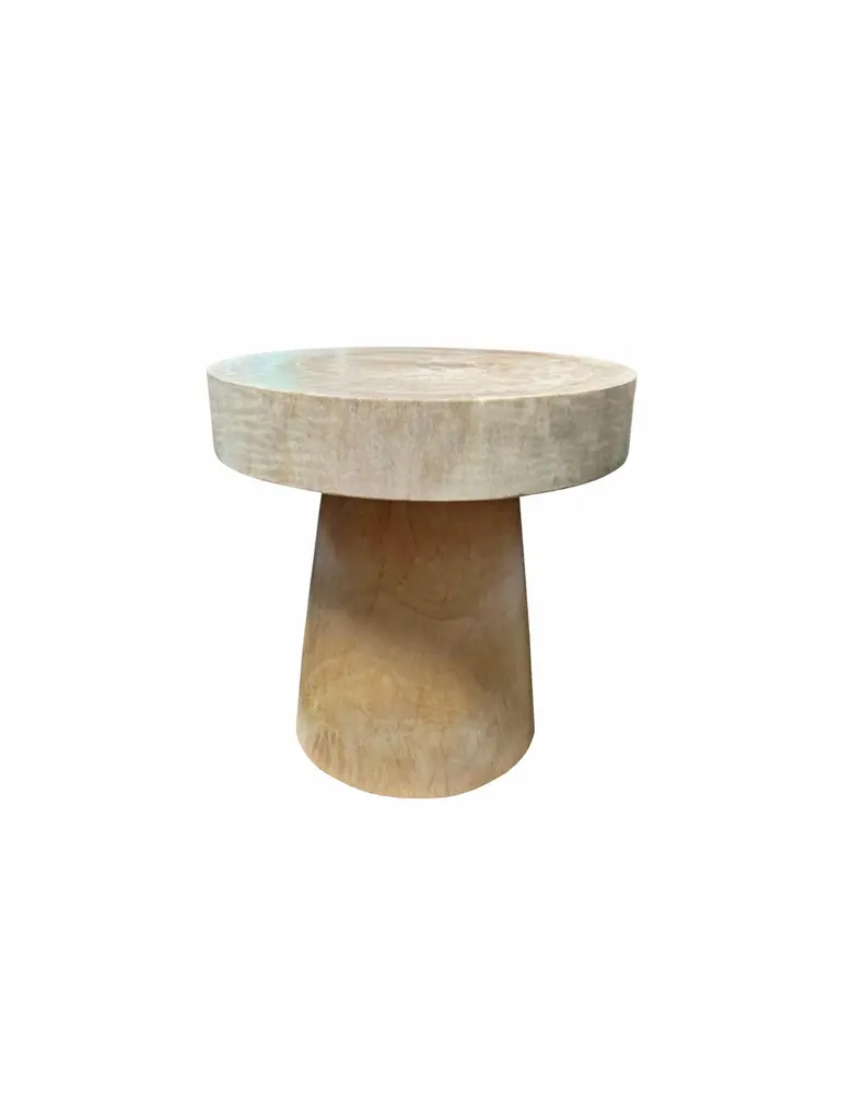 A wonderfully sculptural round side table with clear coated finish. Its neutral pigment and wood texture makes it perfect for any space. It features a tapered base and large round table top. A uniquely sculptural and versatile piece certain to invoke conversation. This table was crafted from mango wood and has a smooth texture.