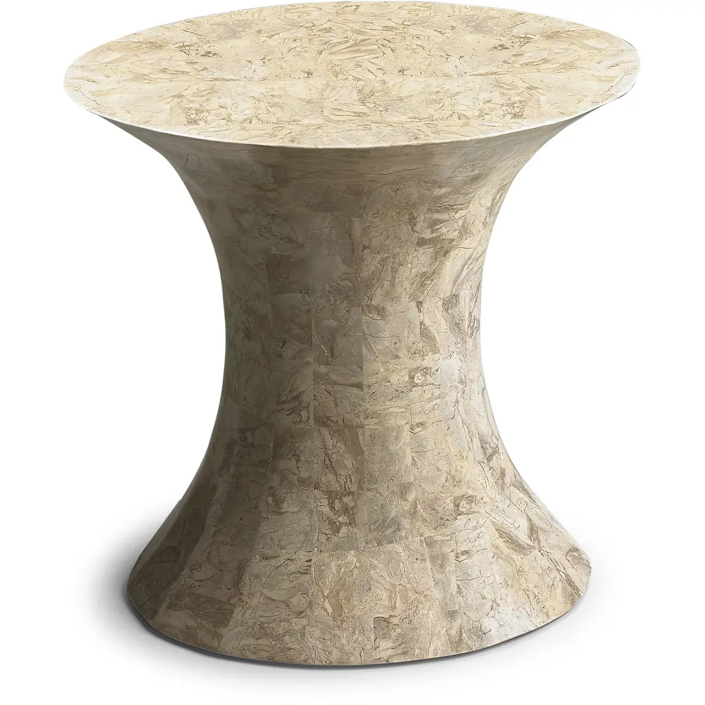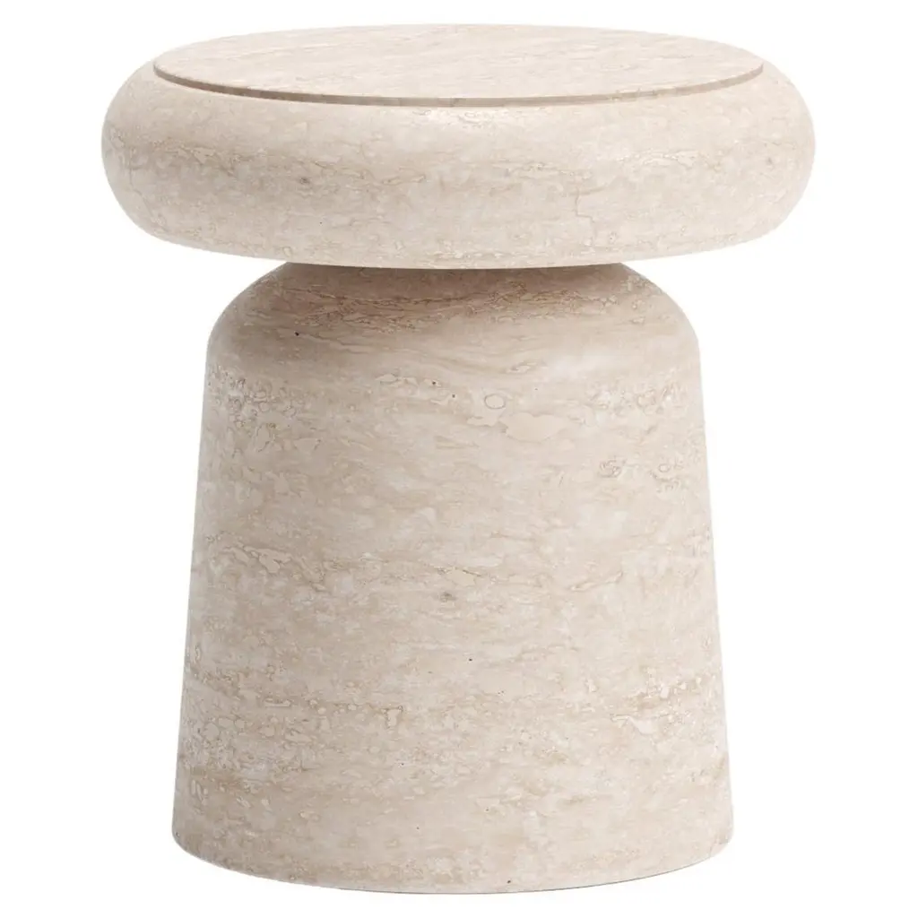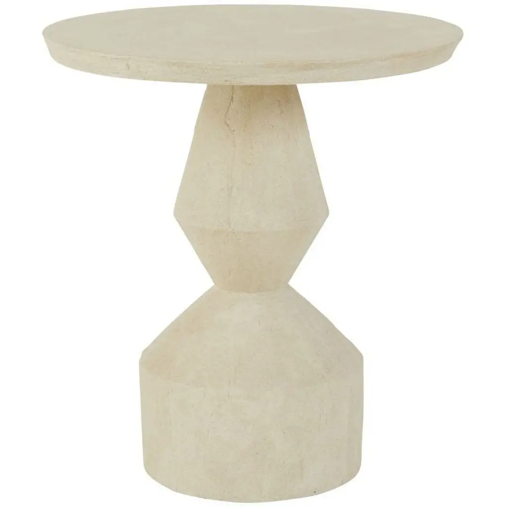 A wonderfully sculptural round side table with clear coated finish. Its neutral pigment and wood texture makes it perfect for any space. It features a tapered base and large round table top. A uniquely sculptural and versatile piece certain to invoke conversation. This table was crafted from mango wood and has a smooth texture.