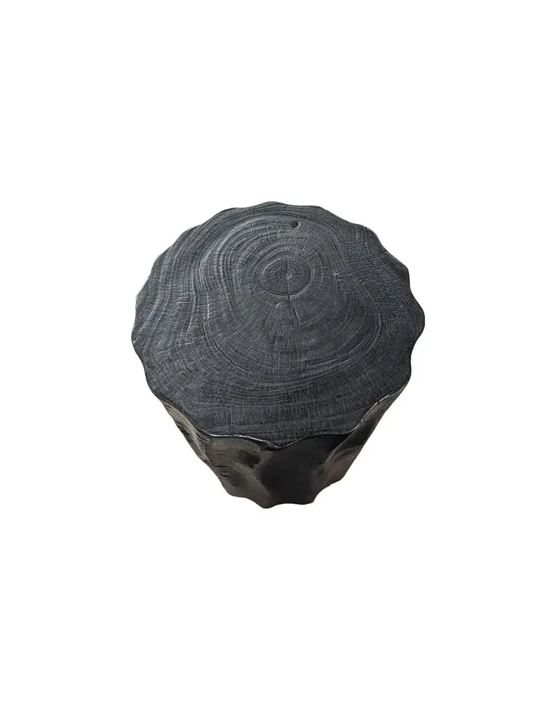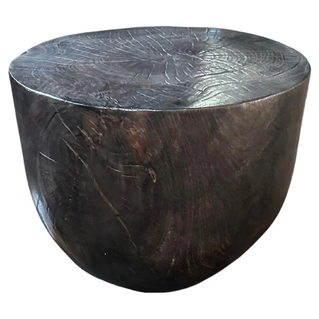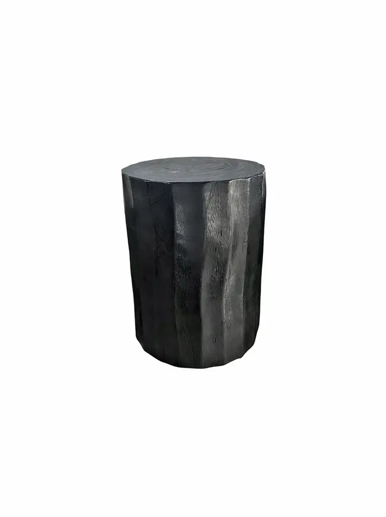 A wonderfully sculptural side table. Its rich black pigment was achieved through burning the wood three times. Its neutral pigment and subtle wood texture makes it perfect for any space. A uniquely sculptural and versatile piece certain to invoke conversation. This table was crafted from mango wood and has a smooth texture.