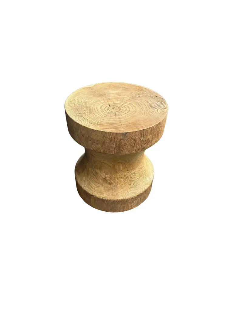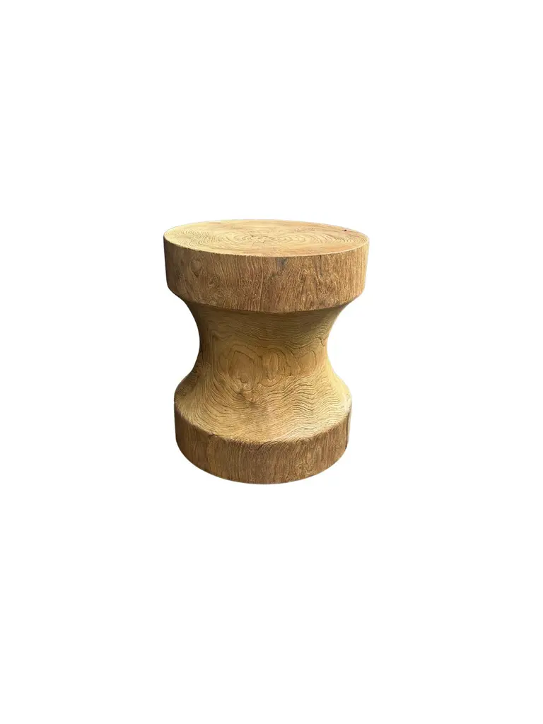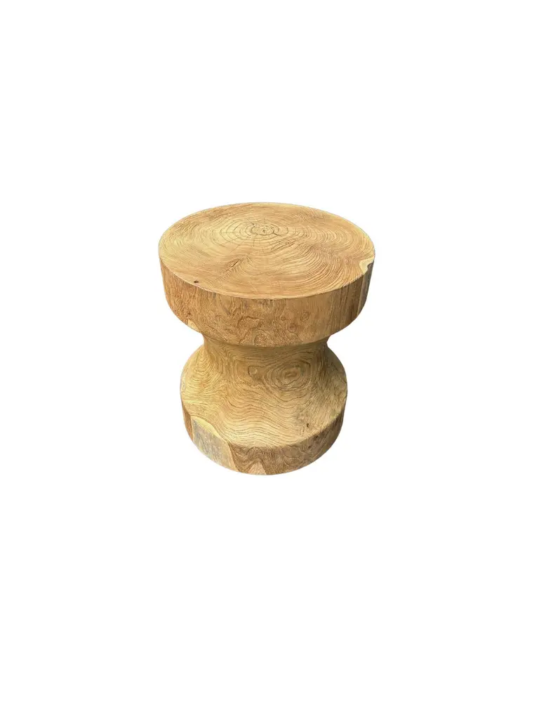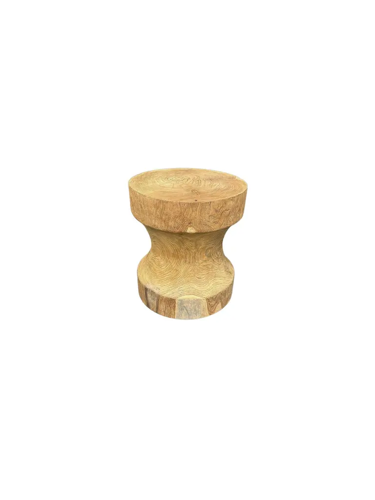 A wonderfully sculptural round side table in a natural finish. Its neutral pigment and wood texture makes it perfect for any space. Carved from a solid trunk of teak, the wood textures are brought to life.