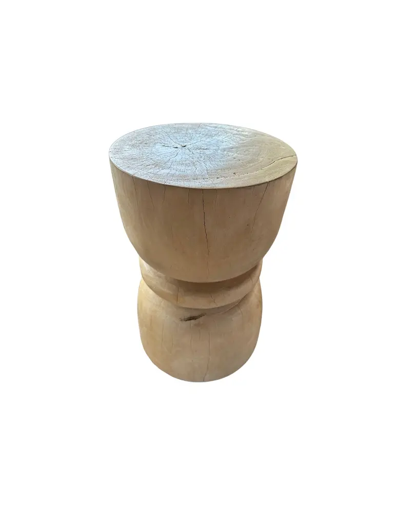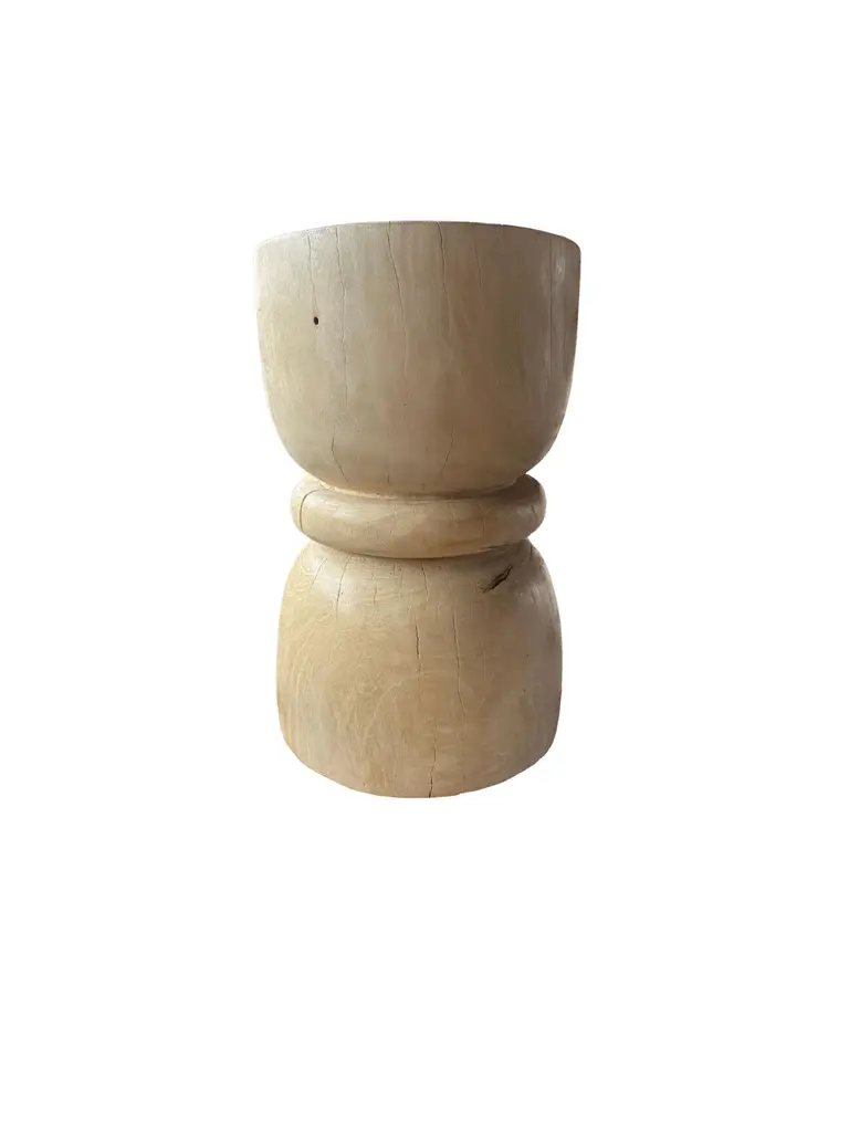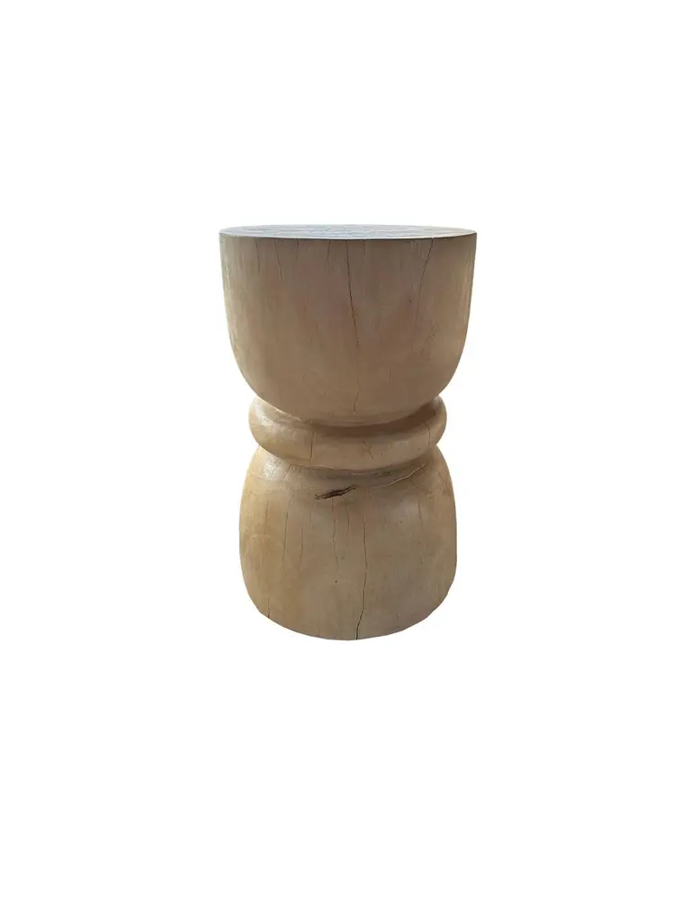 This wonderfully sculptural round side table features a bleached finish, providing a washed out tone to the wood. The table's neutral pigment makes it perfect for any space. It was crafted from a solid block of mango wood and has elegant mix of wood textures.