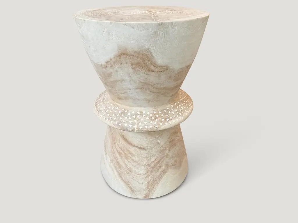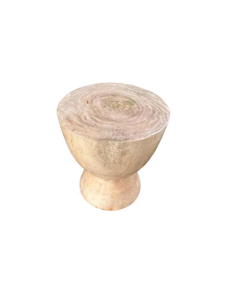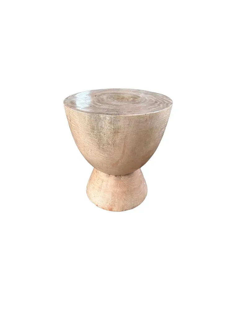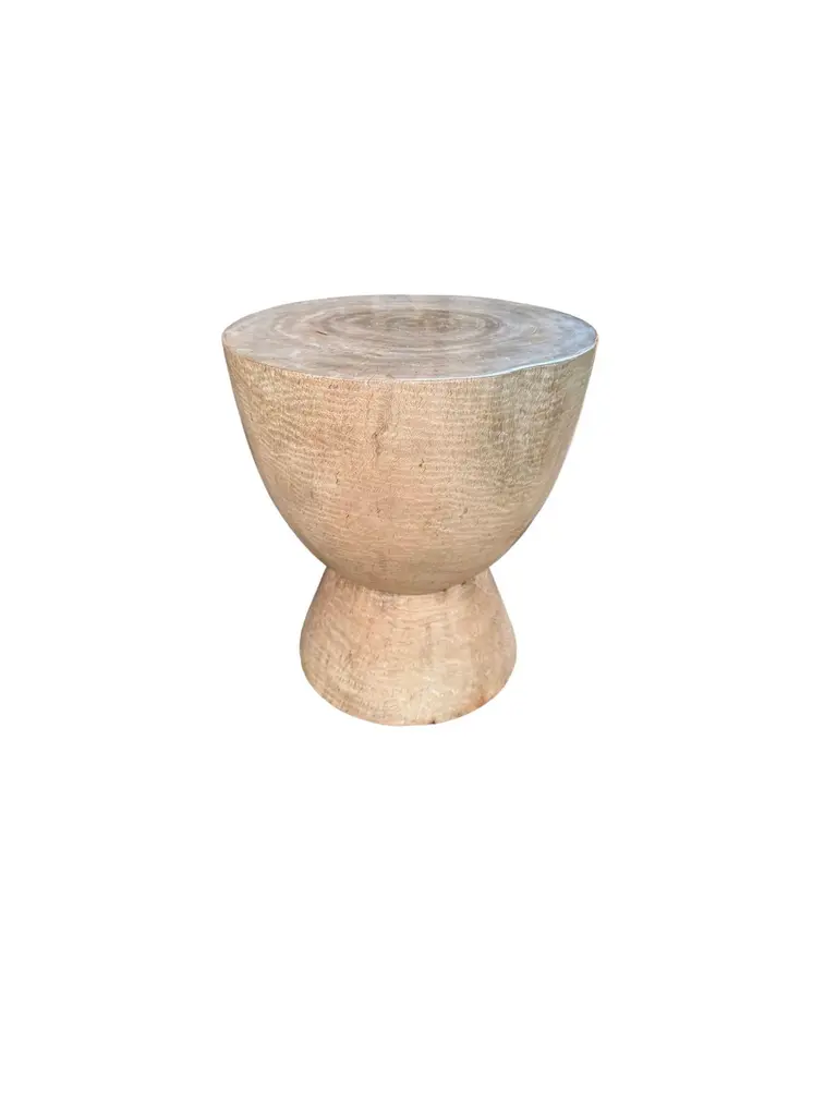 This wonderfully sculptural round side table features a bleached finish, providing a washed out tone to the wood. The table's neutral pigment makes it perfect for any space. It was crafted from a solid block of mango wood and has elegant mix of wood textures.