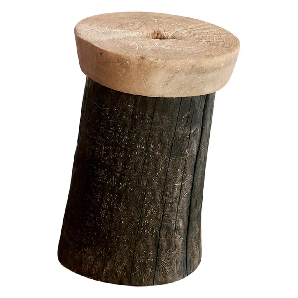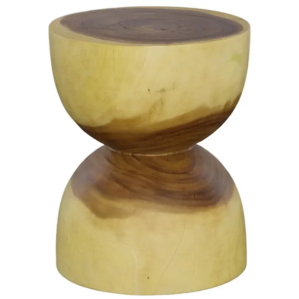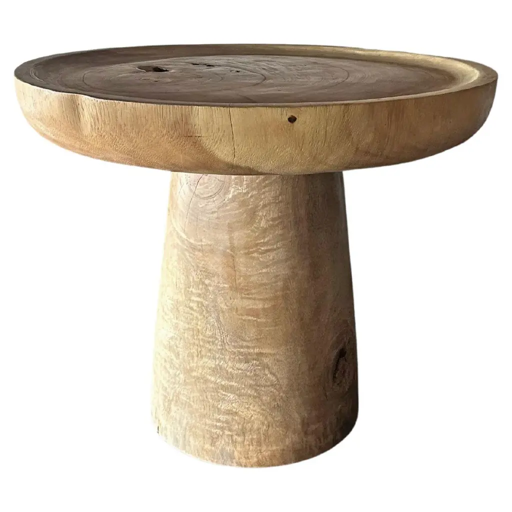 This wonderfully sculptural round side table features a bleached finish, providing a washed out tone to the wood. The table's neutral pigment makes it perfect for any space. It was crafted from a solid block of mango wood and has elegant mix of wood textures.