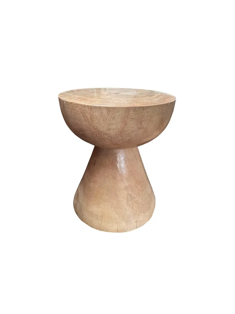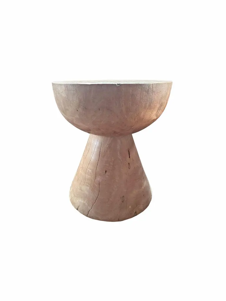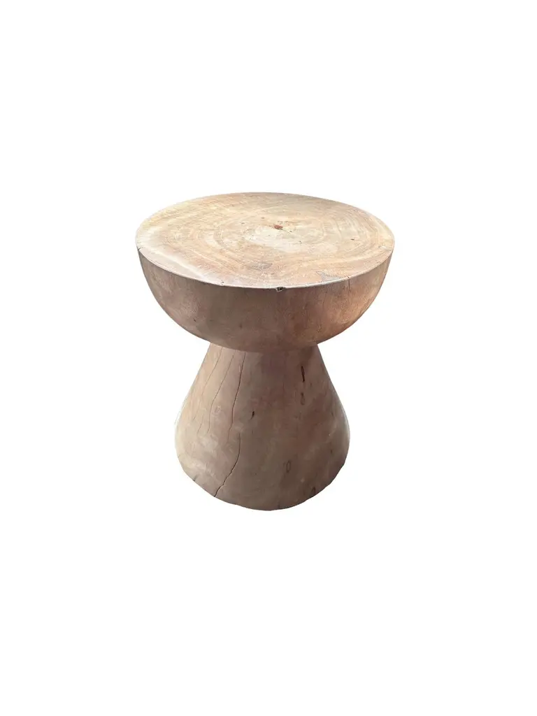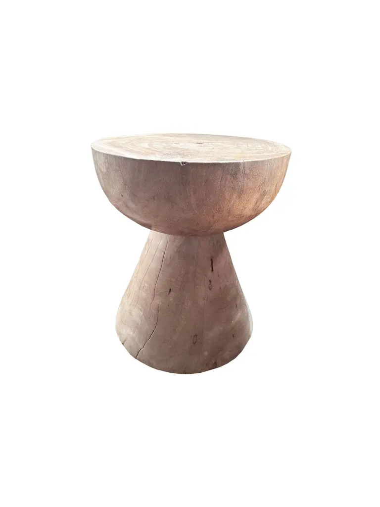 This wonderfully sculptural round side table features a bleached finish, providing a washed out tone to the wood. The table's neutral pigment makes it perfect for any space. It was crafted from a solid block of mango wood and has elegant mix of wood textures.
