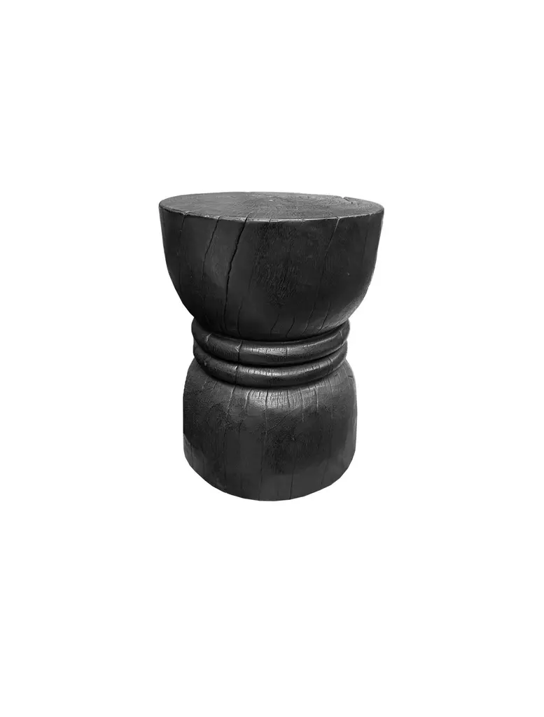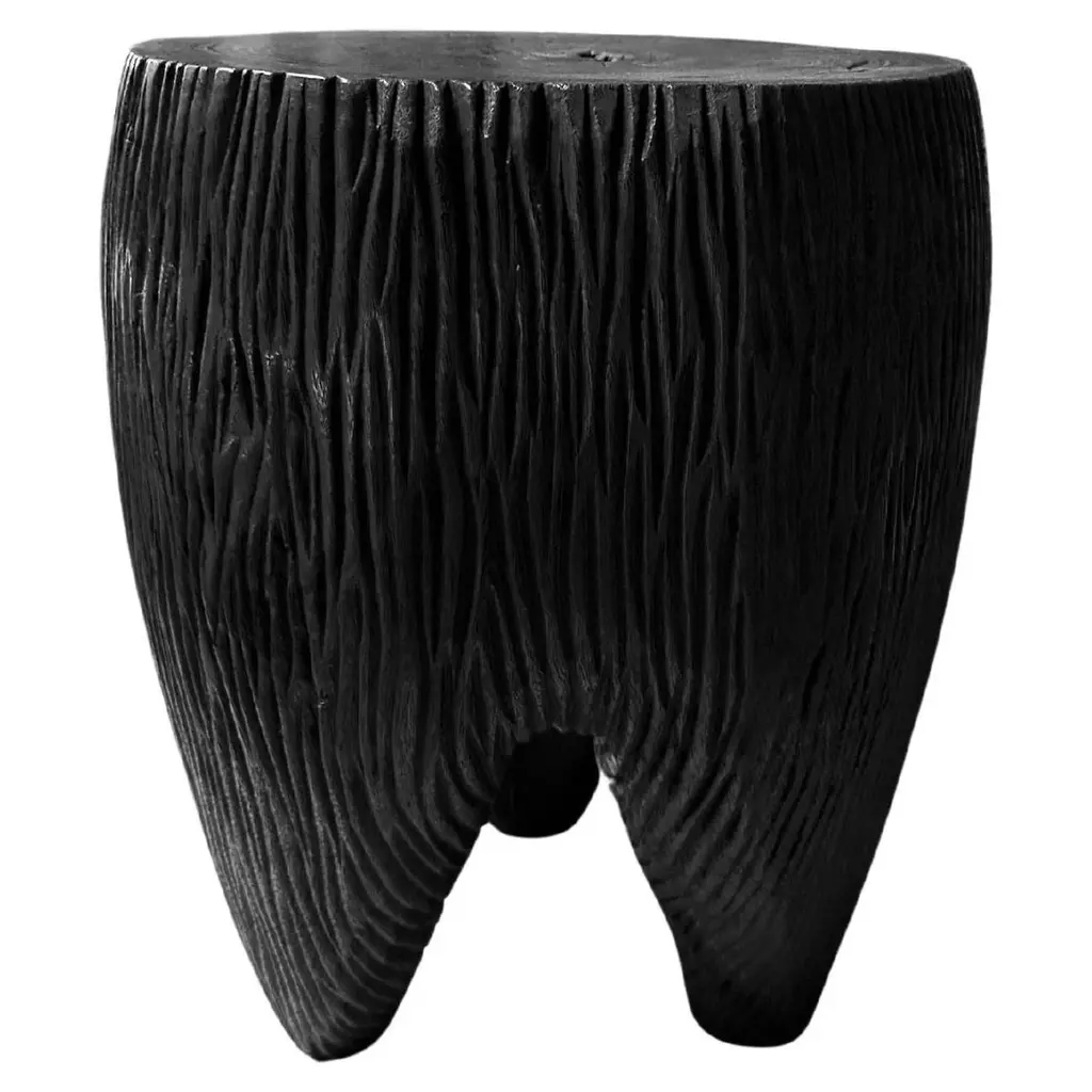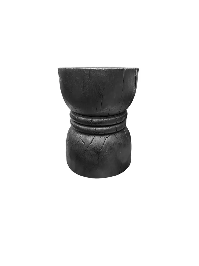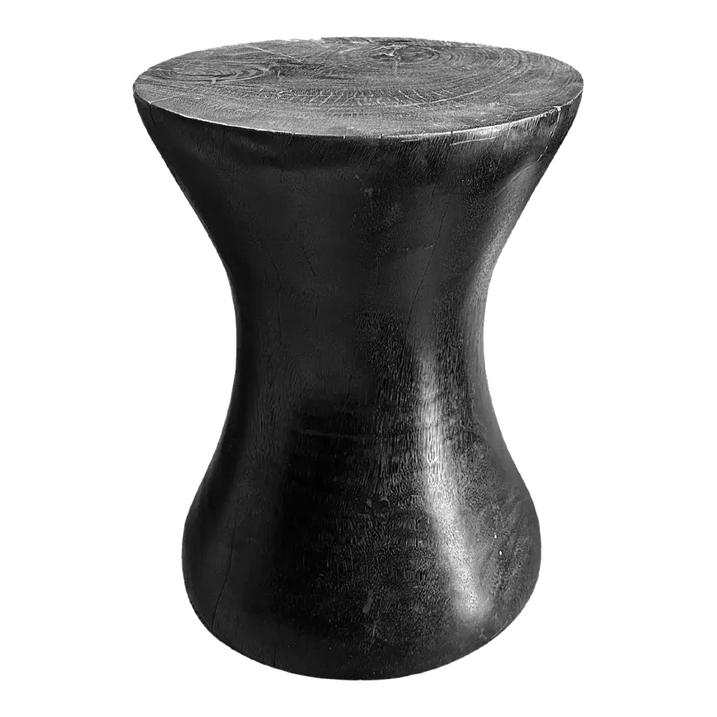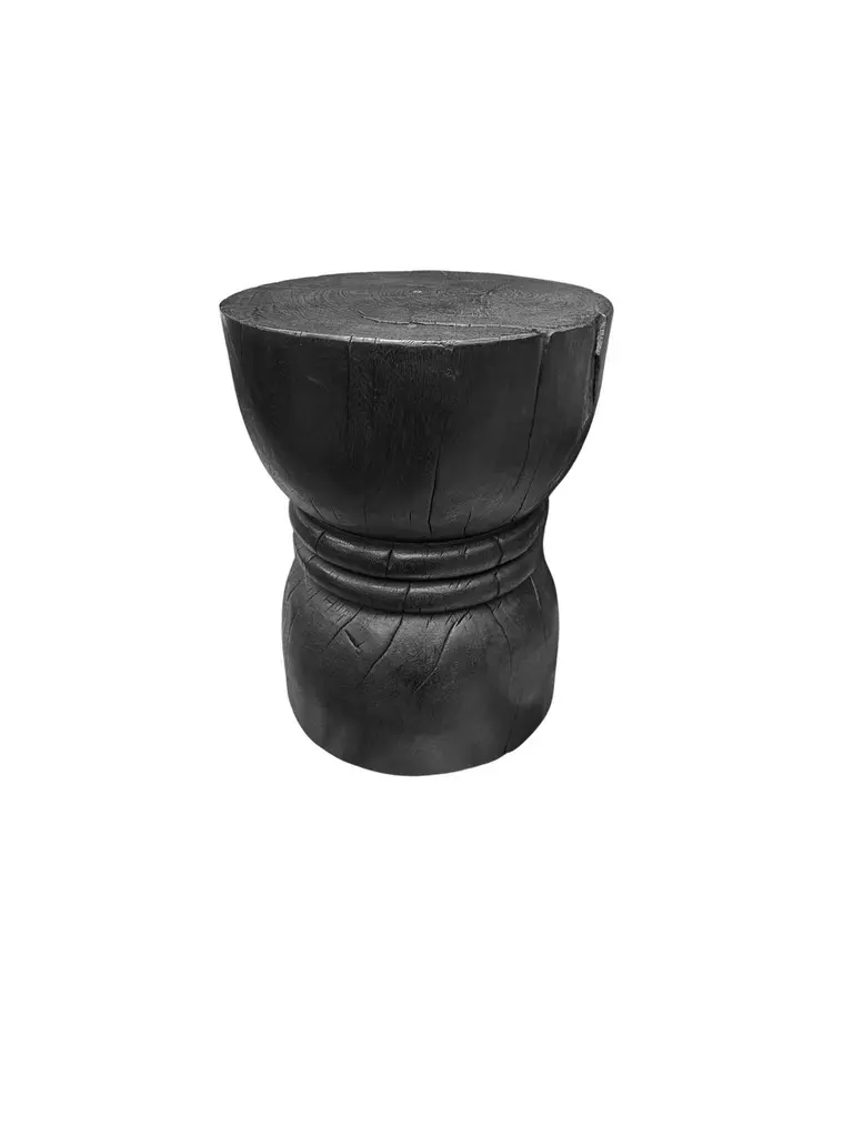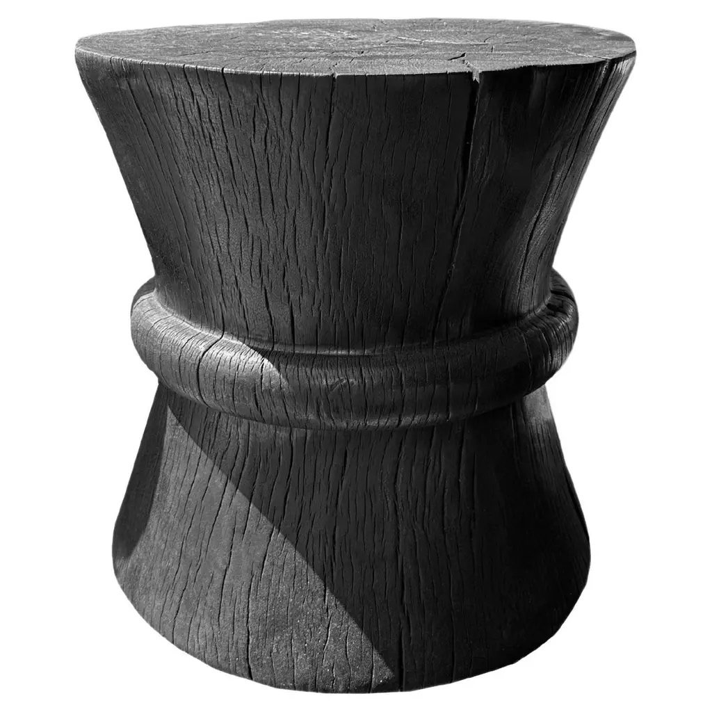 This wonderfully sculptural round side table features a burnt finish, providing a stark black tone to the wood. The exterior was burnt numerous times and finished with a clear coat. The table's neutral pigment makes it perfect for any space. It was crafted from a solid block of mango wood and has elegant mix of wood textures.