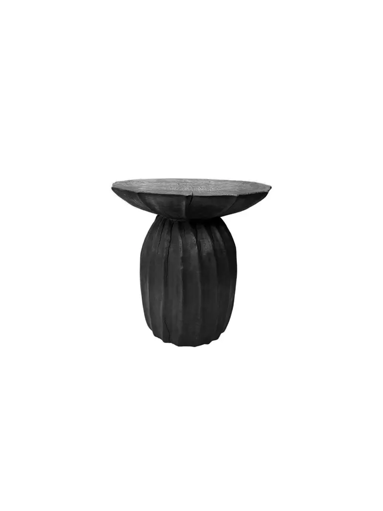 This wonderfully sculptural round side table features a ribbed pattern along its sides. The table's neutral pigment makes it perfect for any space. It was crafted from a solid block of mango wood and has elegant contours resembling a flowing form. To achieve its black tone the table was burnt numerous times and finished with a clear tone.