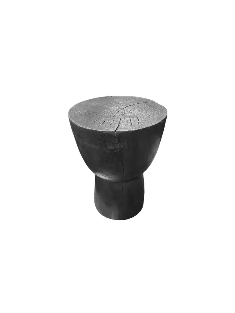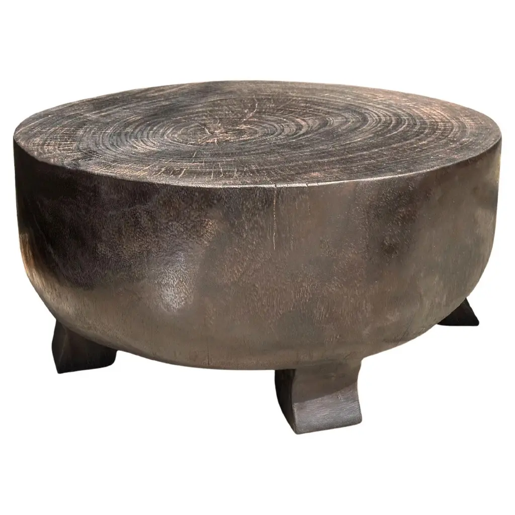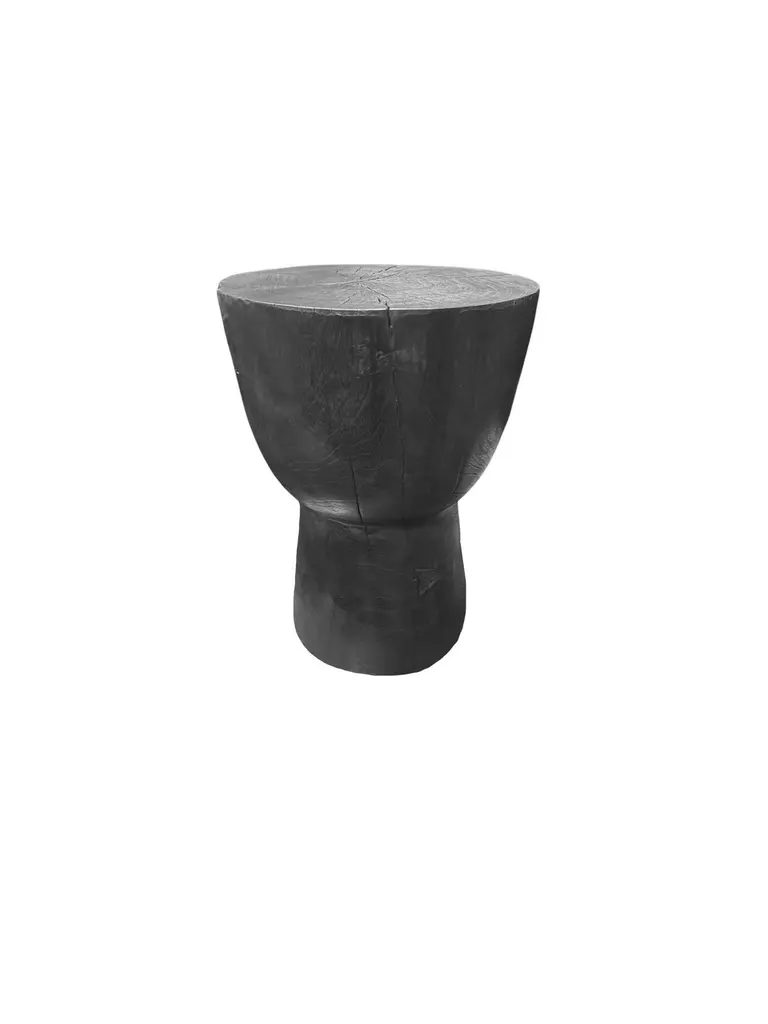 This wonderfully sculptural round side table features a burnt finish where the wood was burnt numerous times and finished with a clear coat. The table's neutral pigment makes it perfect for any space. It was crafted from a solid block of mango wood and has elegant mix of wood textures.