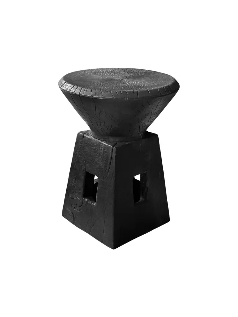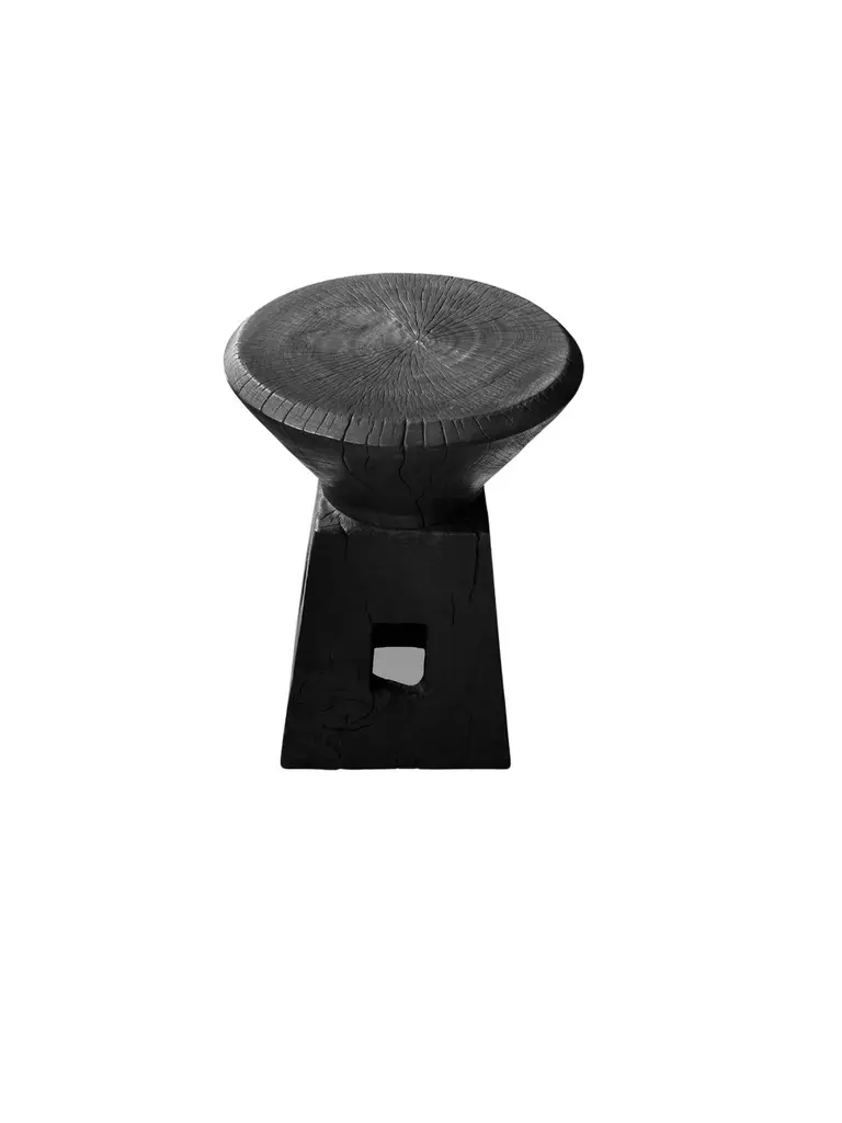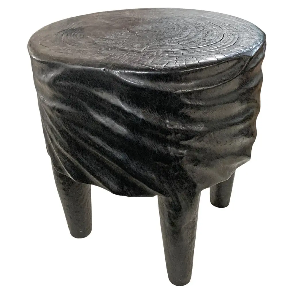 A wonderfully sculptural side table. It has a burnt finish, The wood pigment was achieved through burning the wood several times and finishing it with a clear coat. A uniquely sculptural and versatile piece. It was crafted from a solid block of Mango wood.