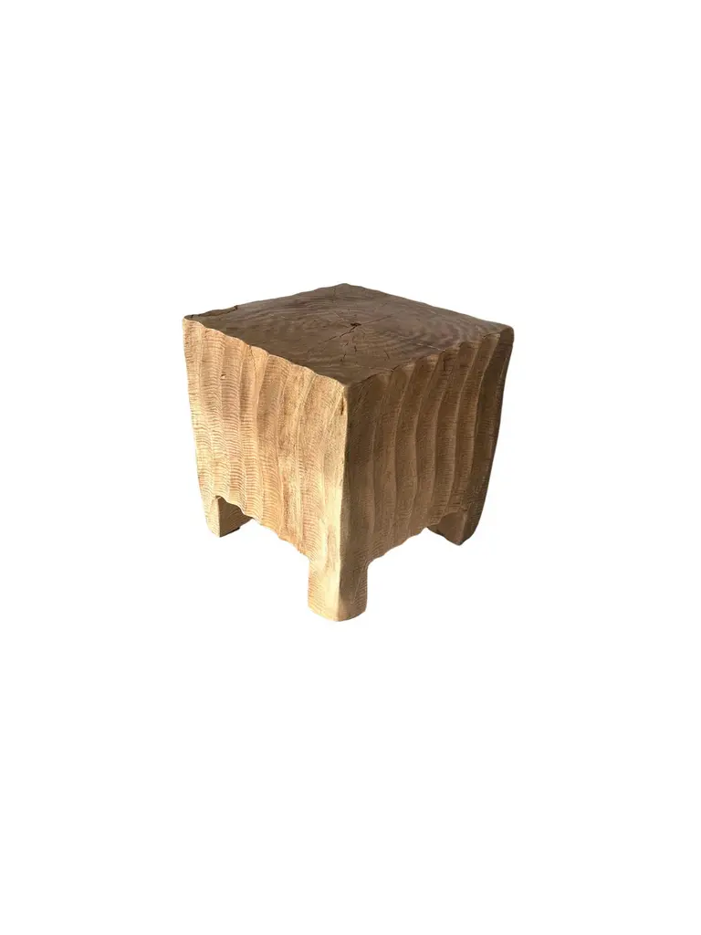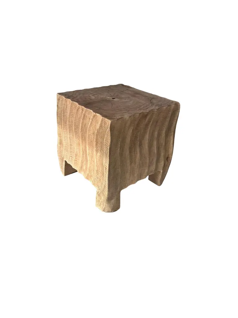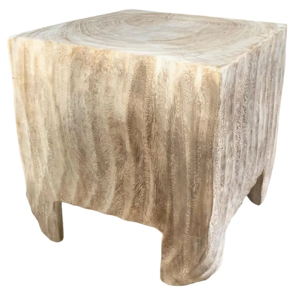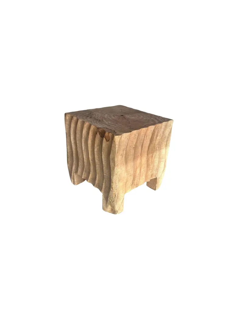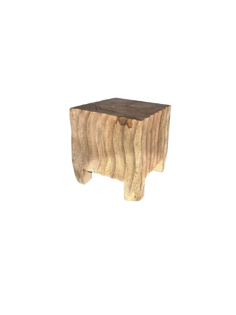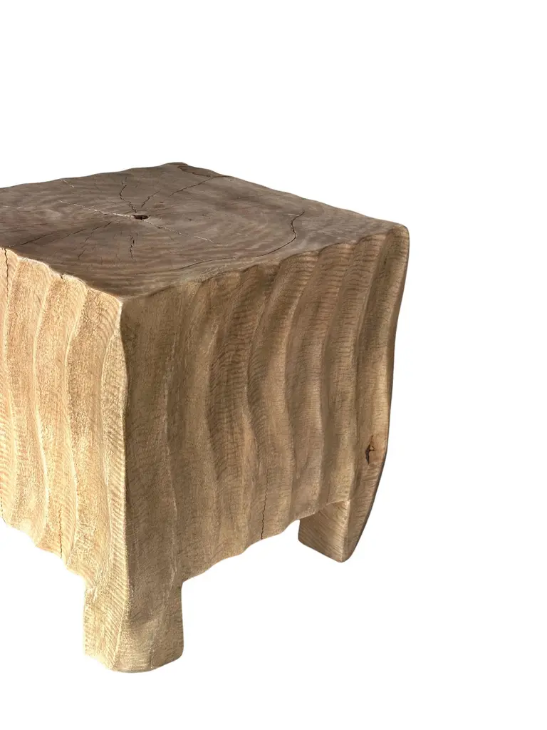 This wonderfully sculptural round side table features a ribbed pattern along its sides. The table's neutral pigment makes it perfect for any space. A uniquely sculptural and versatile piece certain to invoke conversation. It was crafted from a solid block of mango wood.