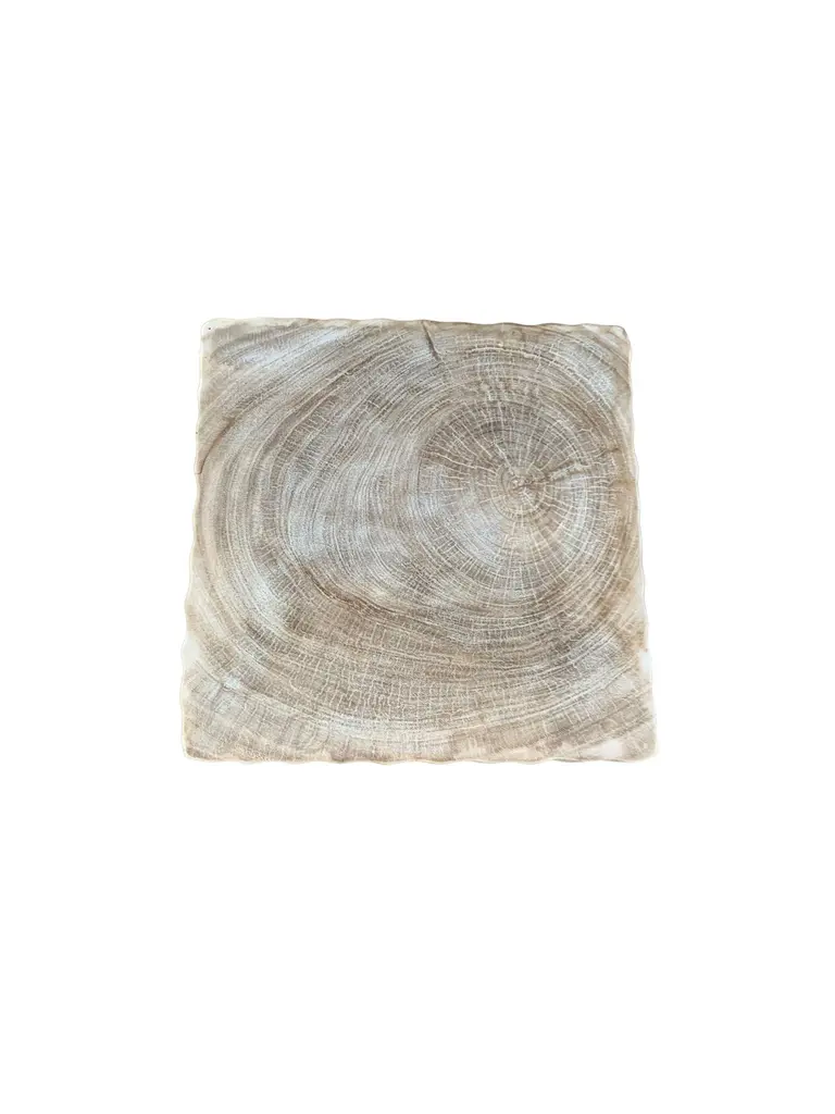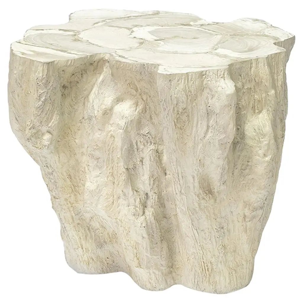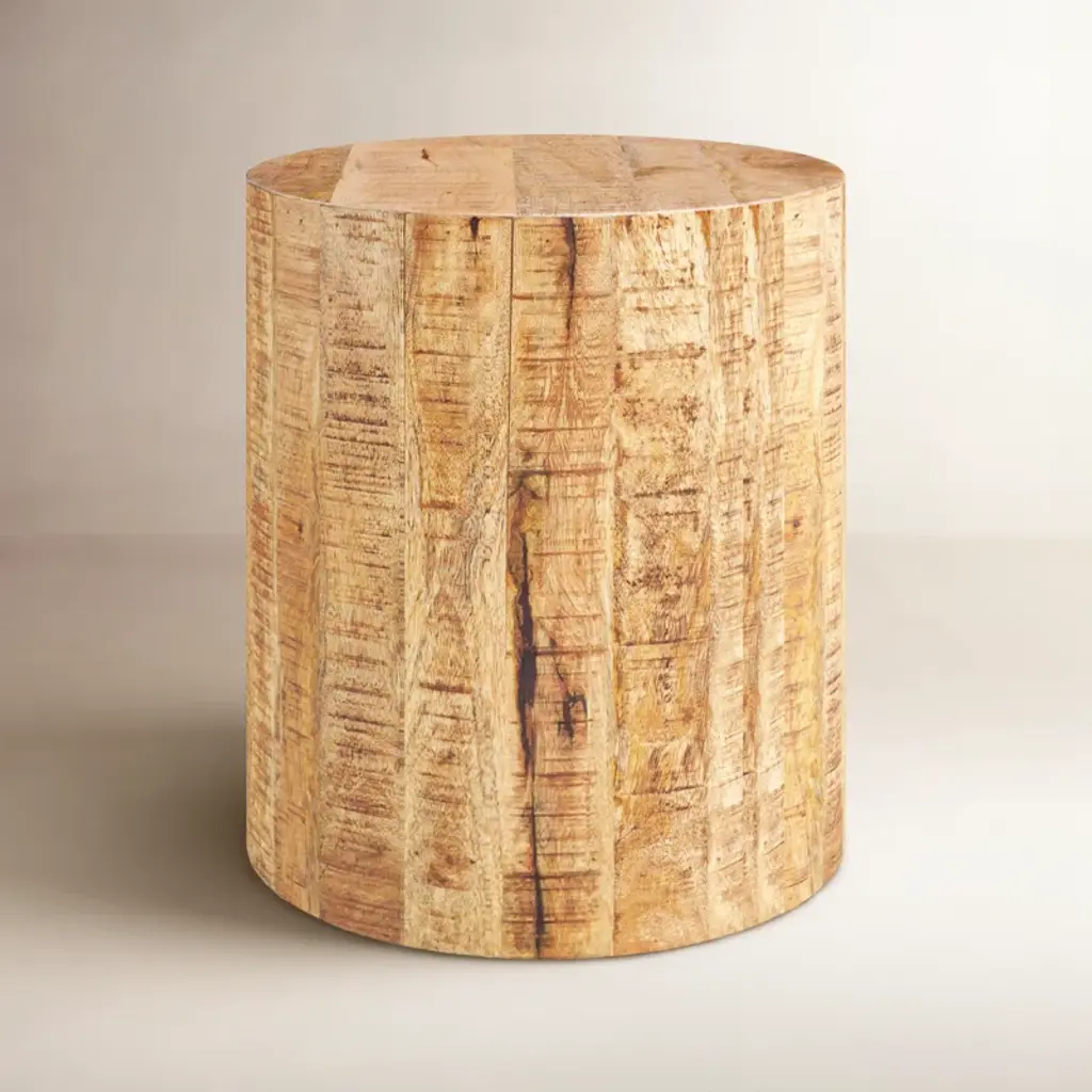 This wonderfully sculptural round side table features a ribbed pattern along its sides. The table's neutral pigment makes it perfect for any space. A uniquely sculptural and versatile piece certain to invoke conversation. It was crafted from a solid block of mango wood. It features a sanded down finish exposing a wonderful mix of wood textures.