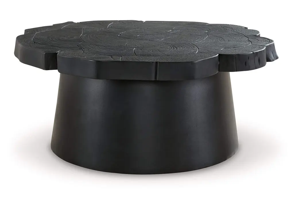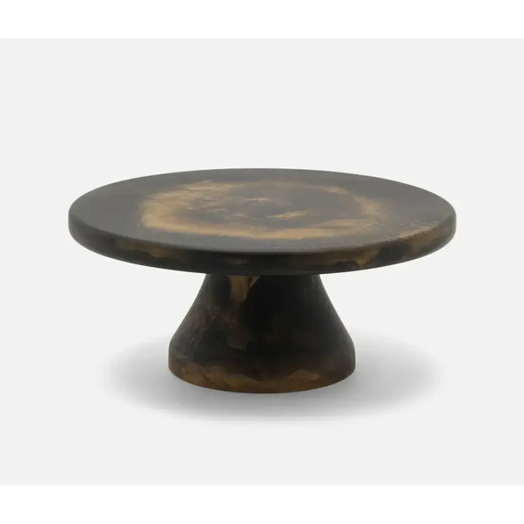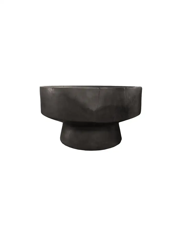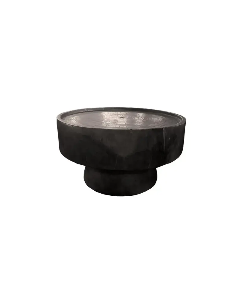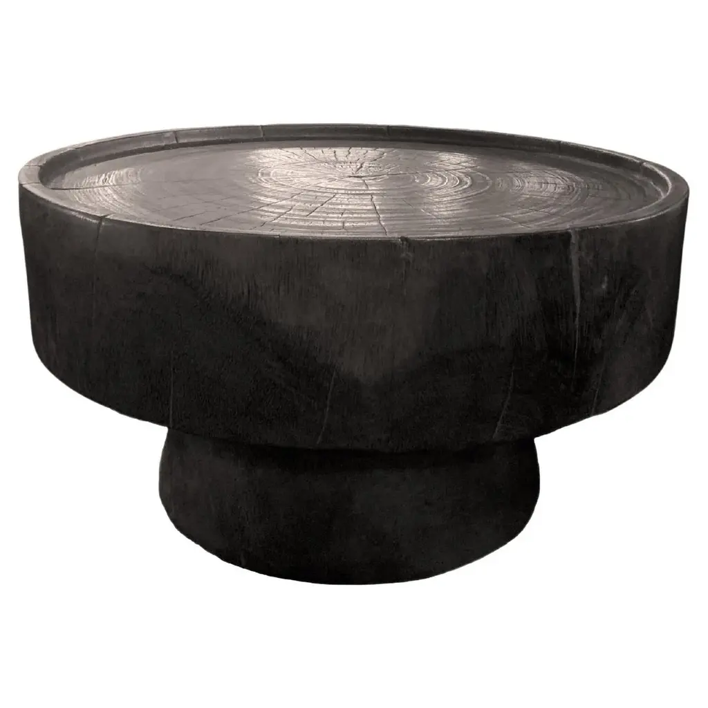 A wonderfully sculptural round side table. Its rich black pigment was achieved through burning the wood three times. Its neutral pigment and subtle wood texture makes it perfect for any space. A uniquely sculptural and versatile piece certain to invoke conversation. This table was crafted from a solid block of mango wood and has a smooth texture.
