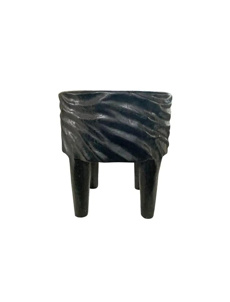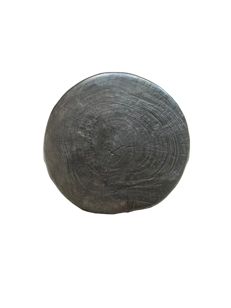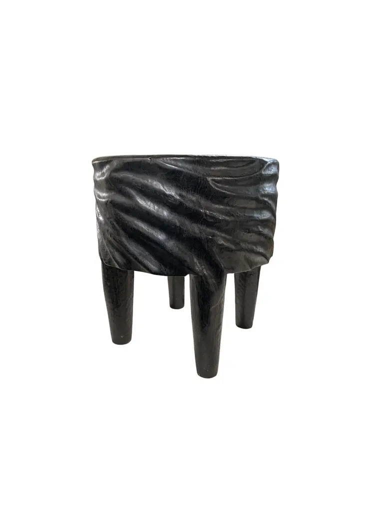 A wonderfully sculptural round side table with a hand-carved design around its exterior and four elongated legs. Its rich black pigment was achieved through burning the wood three times. Its neutral pigment and subtle wood texture makes it perfect for any space. A uniquely sculptural and versatile piece certain to invoke conversation. This table was crafted from a solid block of mango wood and has a smooth texture.