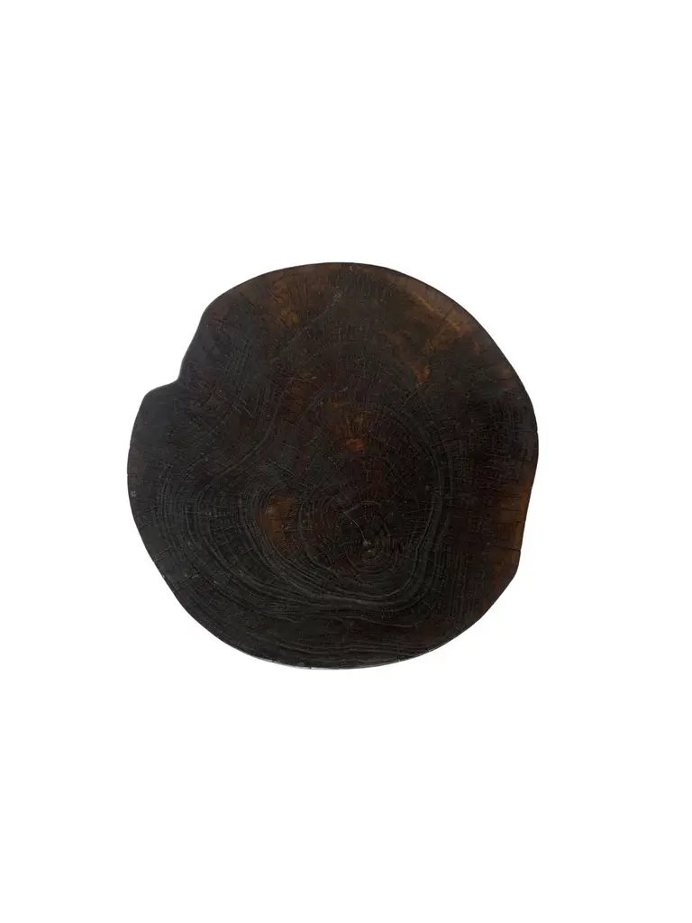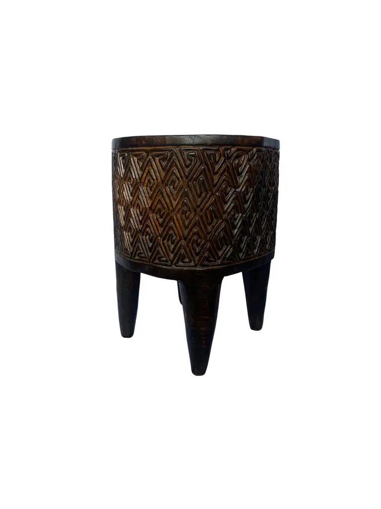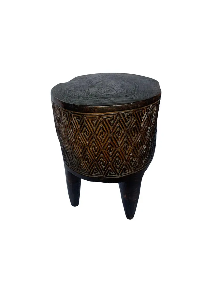 A wonderfully sculptural round side table with a wonderful hand-carved design on its exterior. Its neutral pigment and subtle wood texture makes it perfect for any space. A uniquely sculptural and versatile piece certain to invoke conversation. This table was crafted from a solid block of mango wood and has a smooth texture and finish.