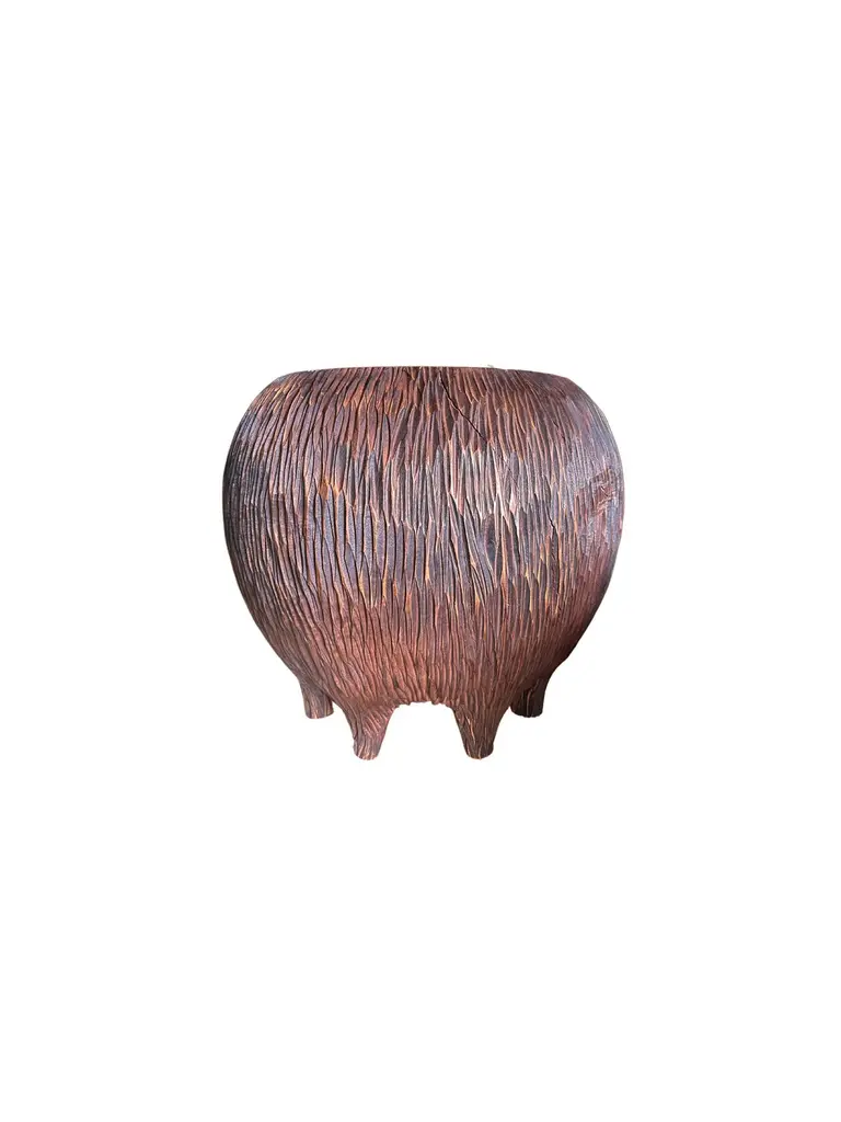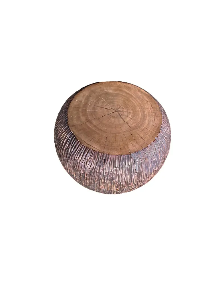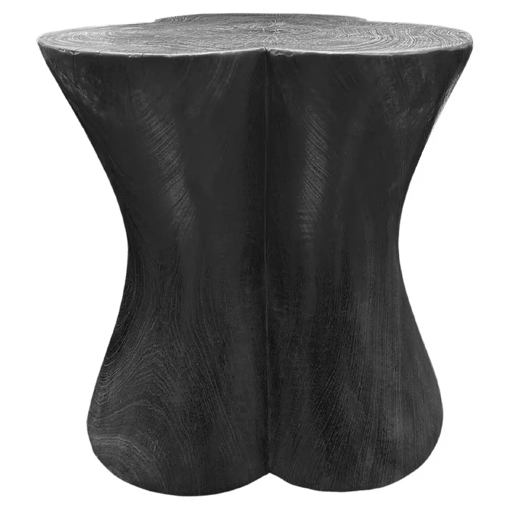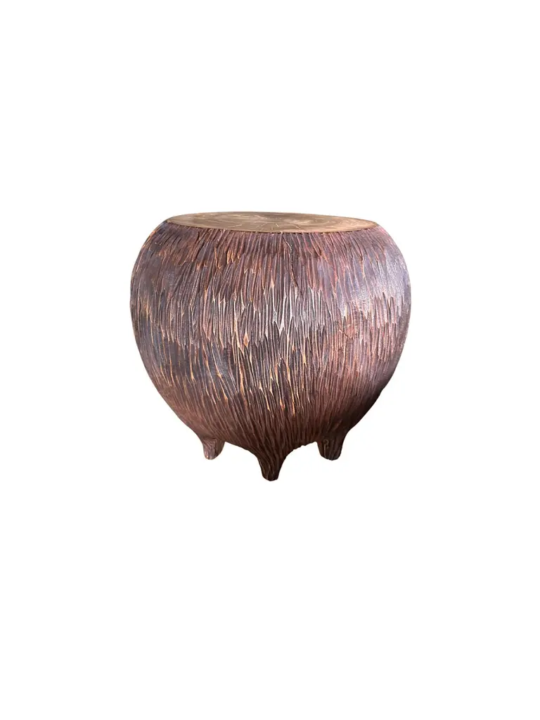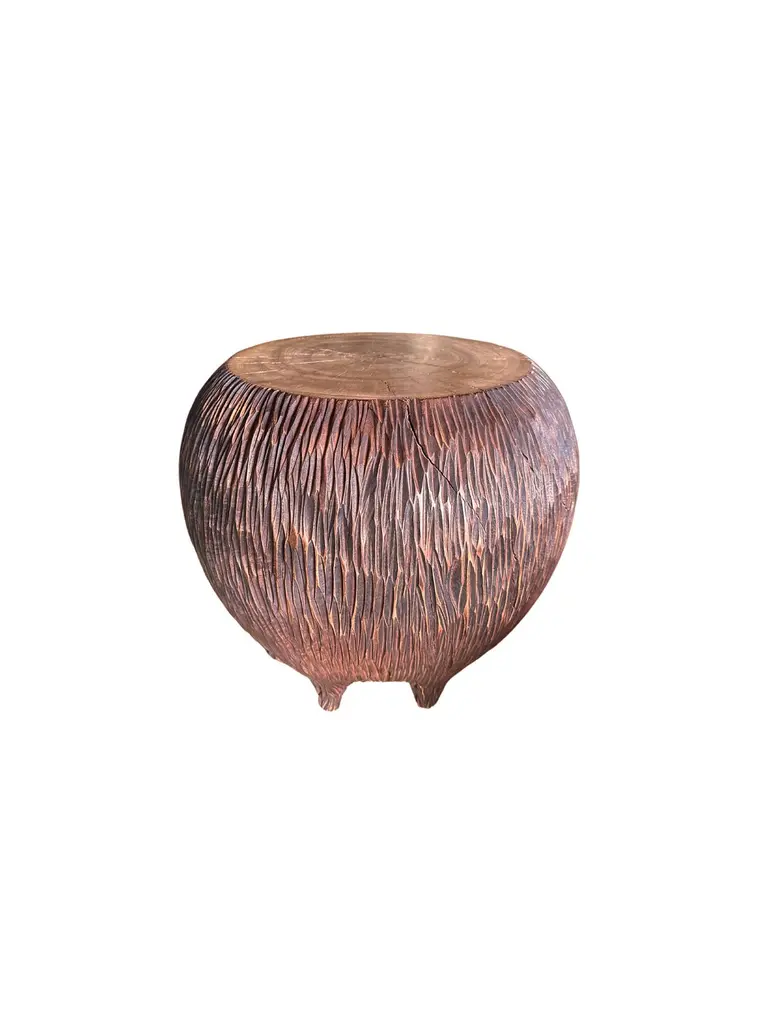 An elegantly rounded, sculptural side table crafted from a single block of mango wood. This table is elevated by 6 shallow legs that blend with the overall form. Unique to this table is the hand-hewn detailing on all sides. The table top was sanded down providing a smooth finish and contrast in texture. The perfect organic object to bring warmth to any space.